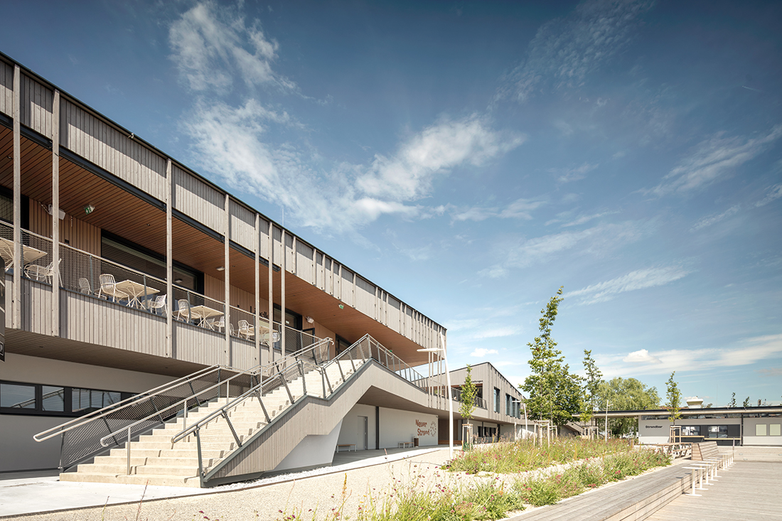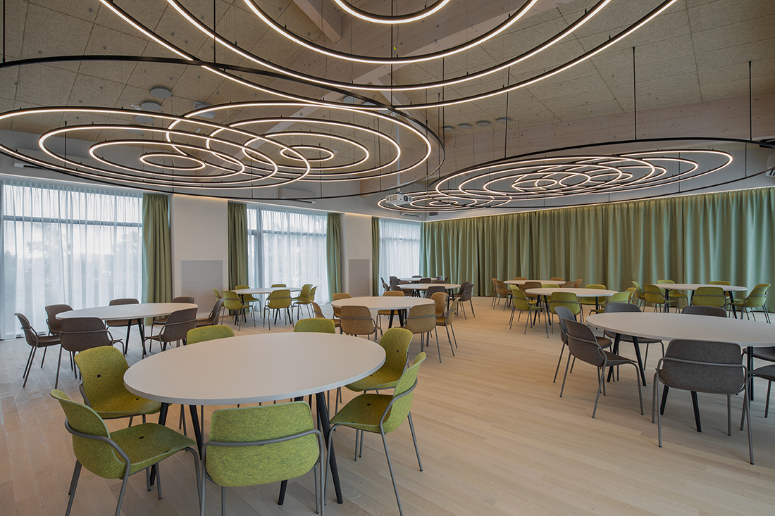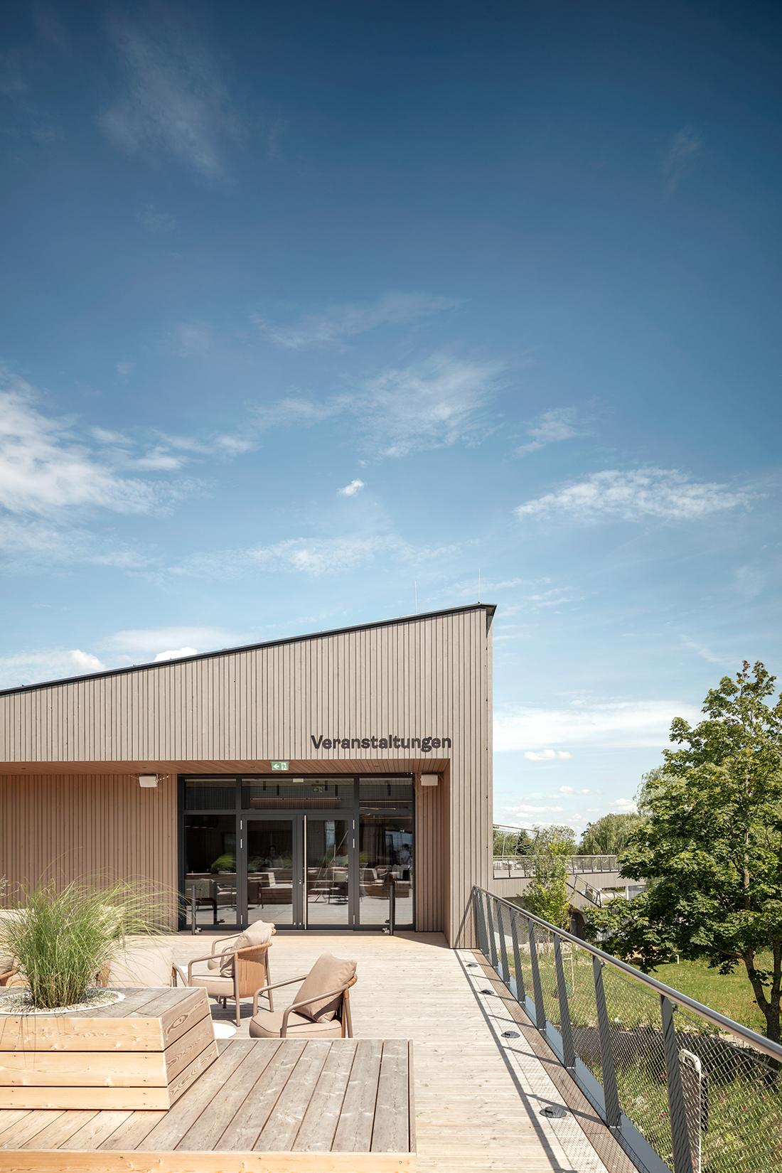The ground floor and stair cores are constructed using solid materials, while the upper floor and roof are made from prefabricated timber elements. The upper level houses a 160-seat restaurant and an event hall for up to 130 guests. Positioned above the reed beds, the elevated structure offers unparalleled views of the lake, enhancing the connection between architecture and nature.