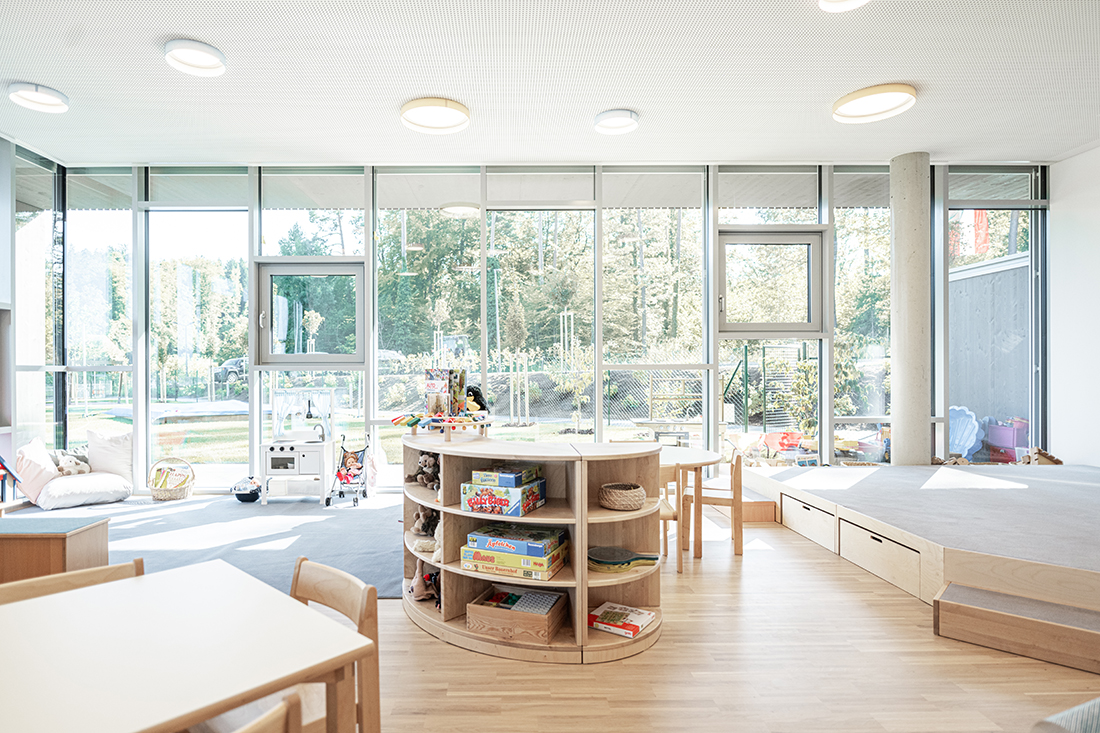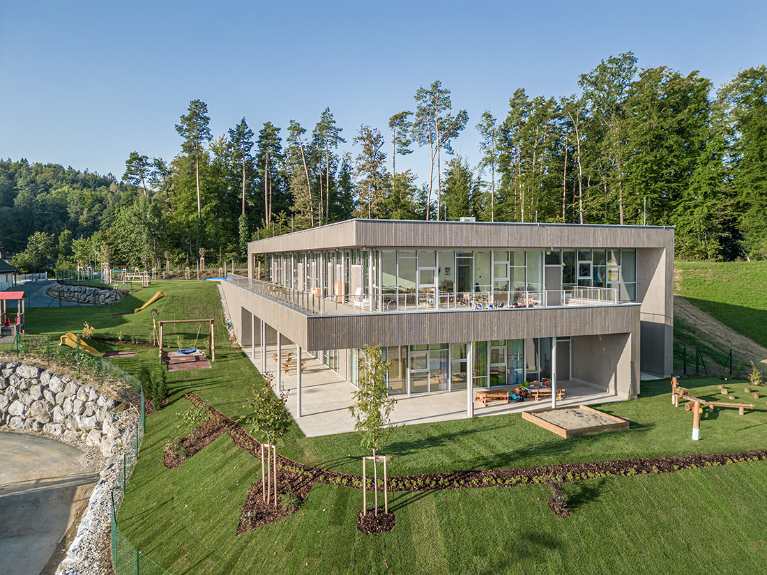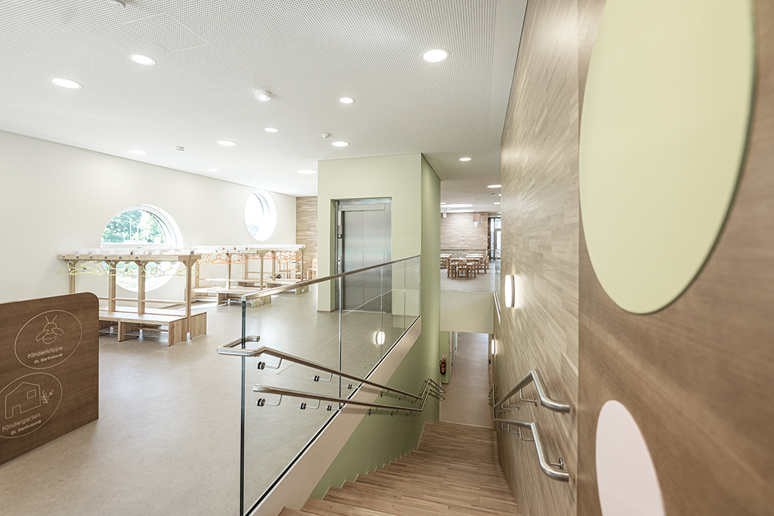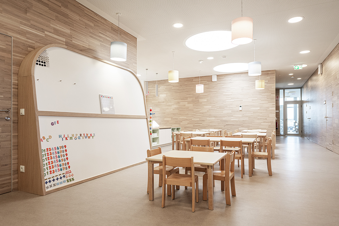The two-storey structure adapts to the sloping terrain and blends seamlessly with the natural surroundings. Floor-to-ceiling glass façades provide children with unobstructed views of the centre of St. Bartholomä, while offering adults a picturesque panorama of the surrounding hills.