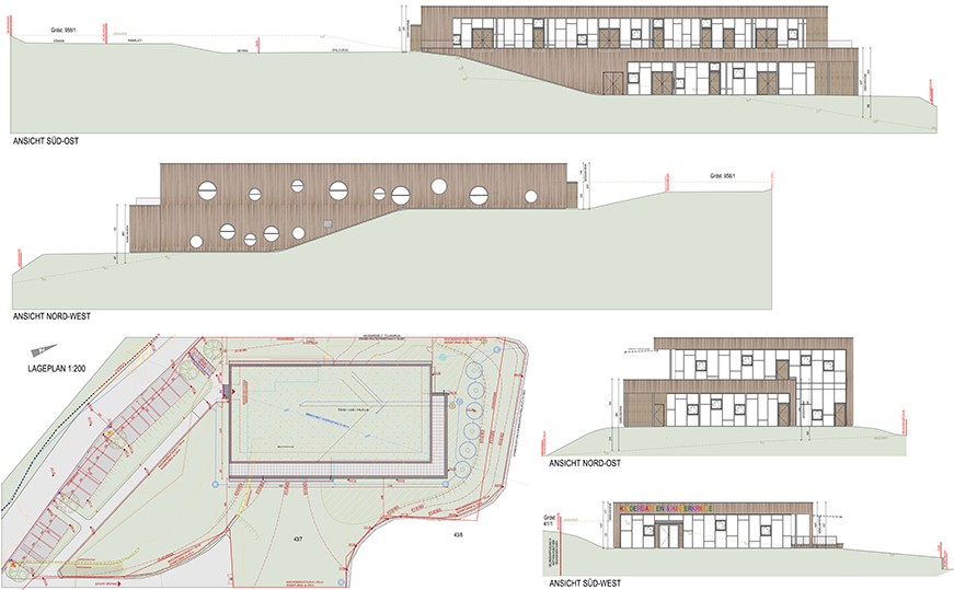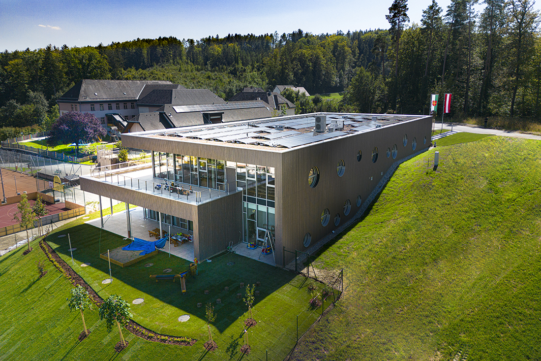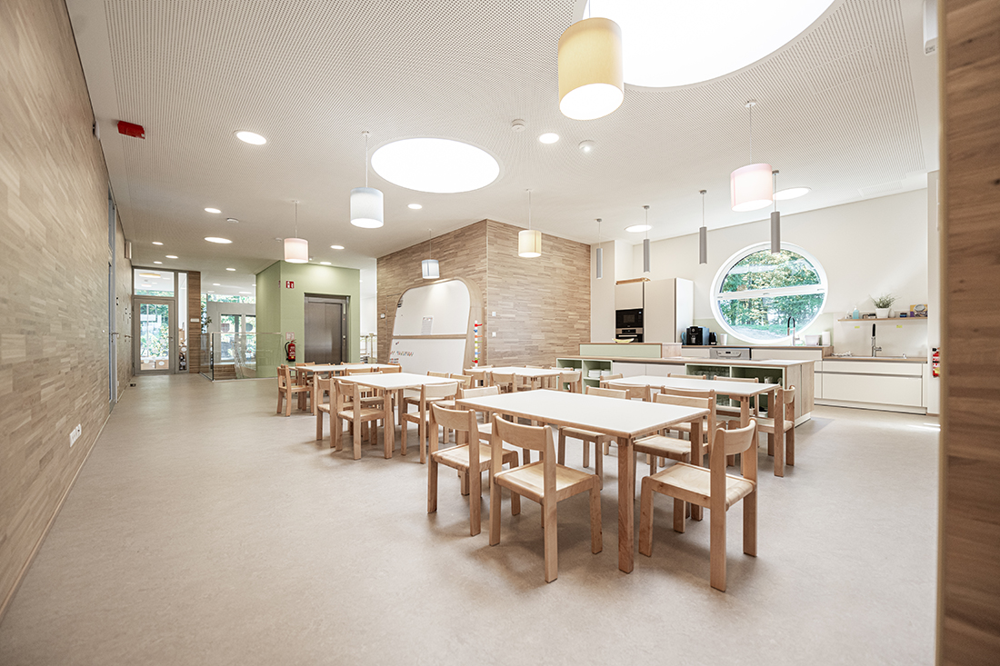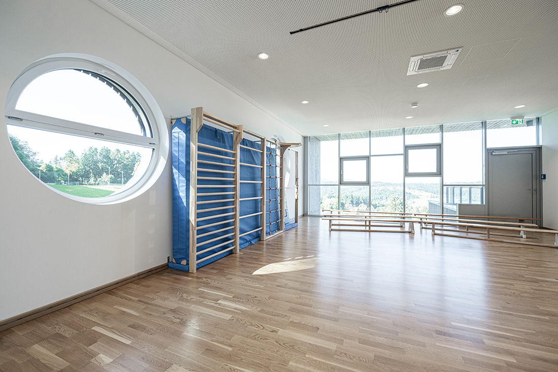 The two-storey structure adapts to the sloping terrain and blends seamlessly with the natural surroundings. Floor-to-ceiling glass façades provide children with unobstructed views of the centre of St. Bartholomä, while offering adults a picturesque panorama of the surrounding hills.