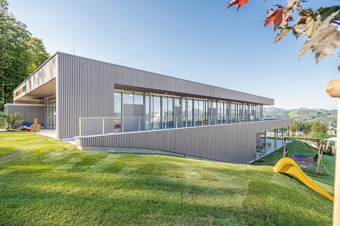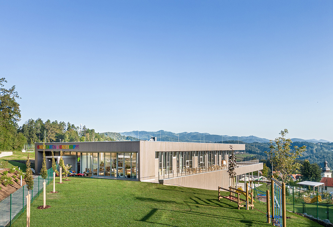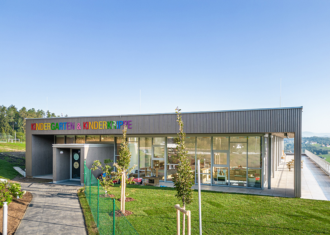 The new, fully accessible kindergarten building in St. Bartholomä, Austria, emphasizes sustainability. This is reflected in the use of natural materials such as wood cladding, a PV system on the roof, and a green roof covering the rest of the building.