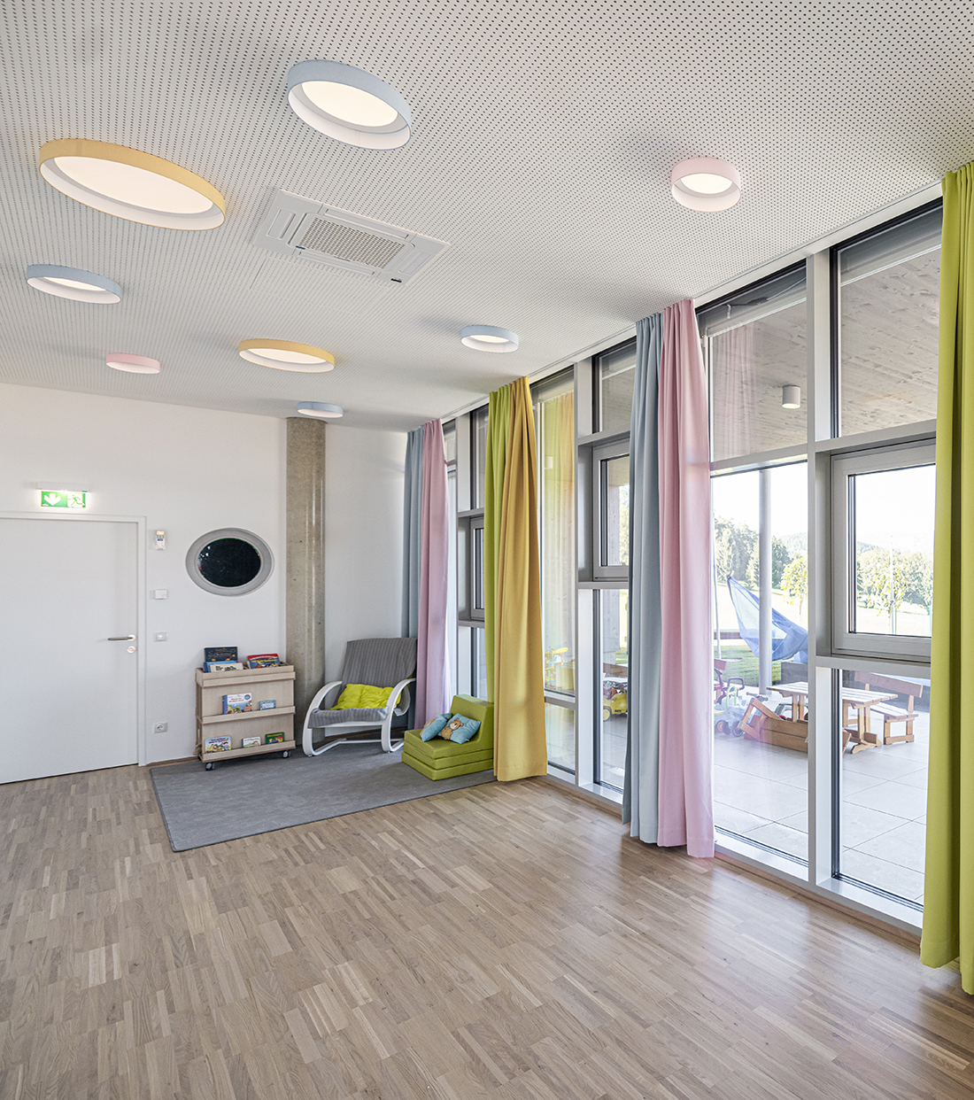 Inside, natural wood surfaces on the floors and walls create a cozy atmosphere, complementing the fresh green and white walls and the pastel tones of the interior. This design invites children to explore their creativity with colour. The use of acoustic ceilings and floors enhances the quiet and comfortable ambiance of the space. Construction began in July 2022 and was completed on schedule in August 2023.