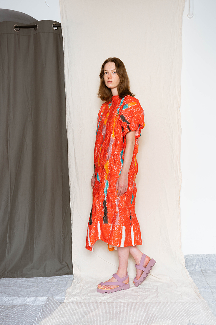 Nika Ravnik (1981) is a fashion and costume designer who pays special attention researching the structure and shape of clothing. She graduated in fashion and textile design at the Faculty of Natural Sciences and Engineering in Ljubljana and upgraded her studies at Central Saint Martins in London and Designskolen Kolding in Denmark. She lives and works in Ljubljana, and is also a member of the Galerija GT Cultural Society. The ethos of her work is sustainably oriented, focusing on mindful design approach, such as the “zero-waste” principle, the “one-size-fits-all” concept and the principle of versatility. Simple geometric shapes form the basis of garments, which are transformed into authentic wearable creations through experimentation and manipulation of details. Following a conceptual aspect the aesthetics reflects a touch of avant-garde and timelessness.