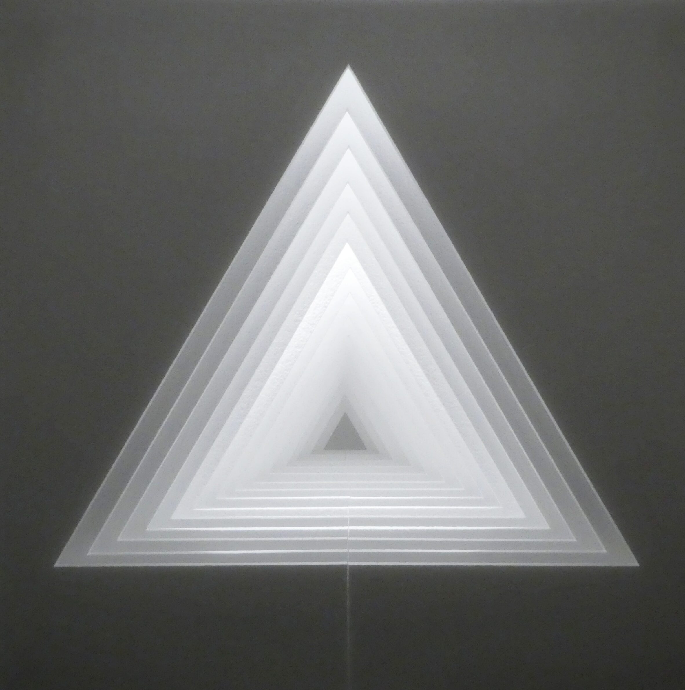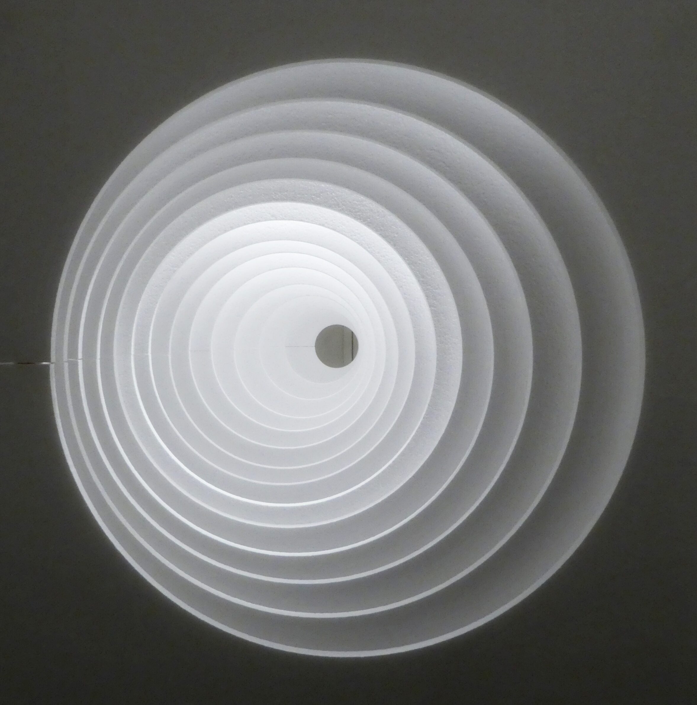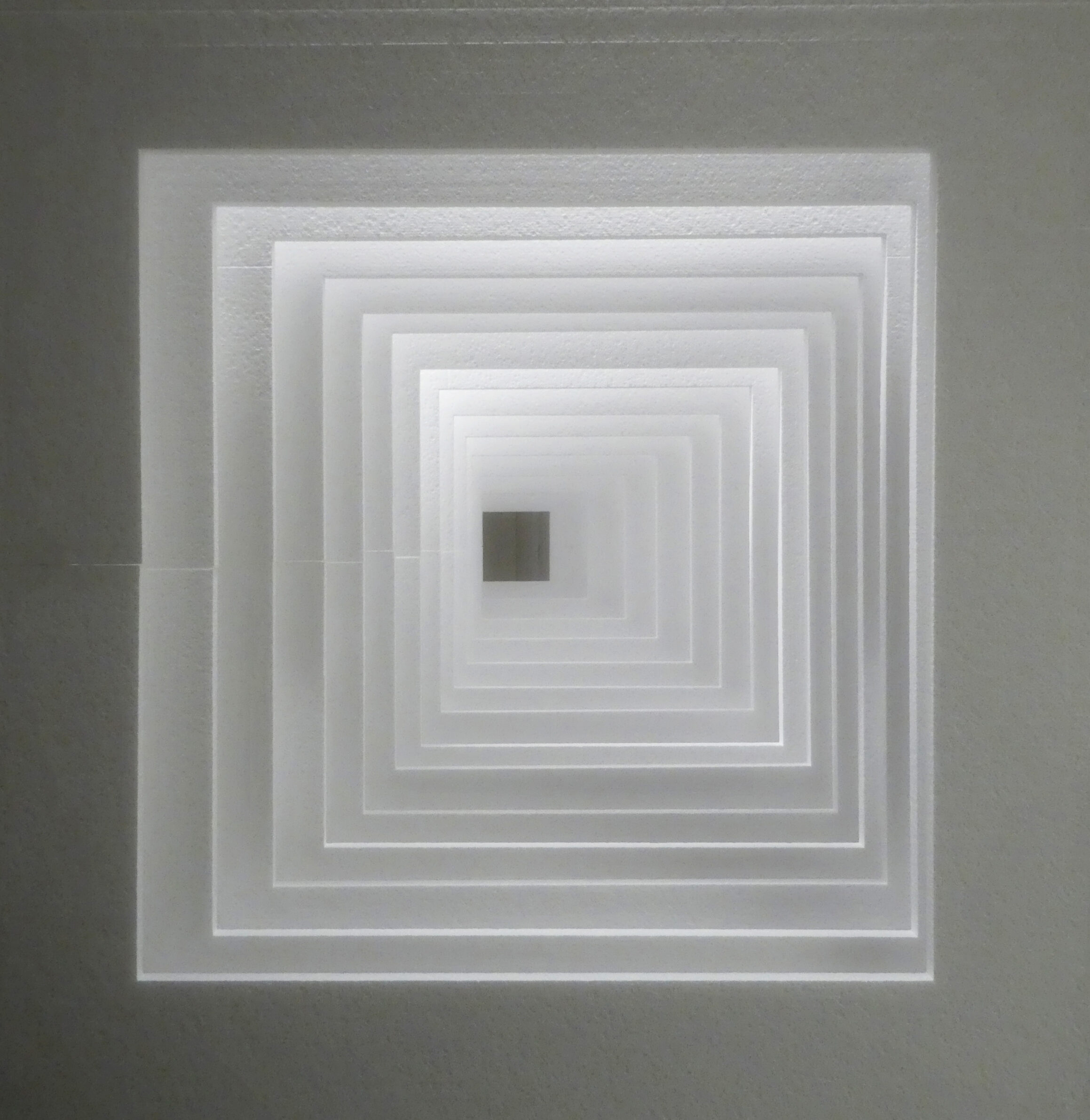 The installation consists of three cubic objects based on fundamental geometric forms -circle, square and triangle - key elements of Vasarely’s visual system. Each sculpture is constructed from layered XPS polystyrene boards that translate two-dimensional optical compositions into spatial sections. Positioned on pedestals within the exhibition space, the objects invite visitors to move around them and experience how optical effects evolve through perspective, light and movement.