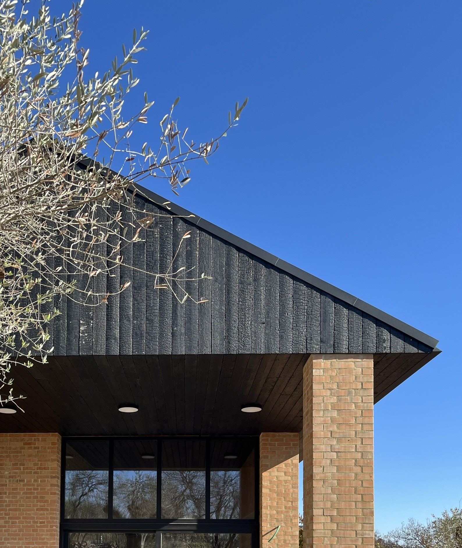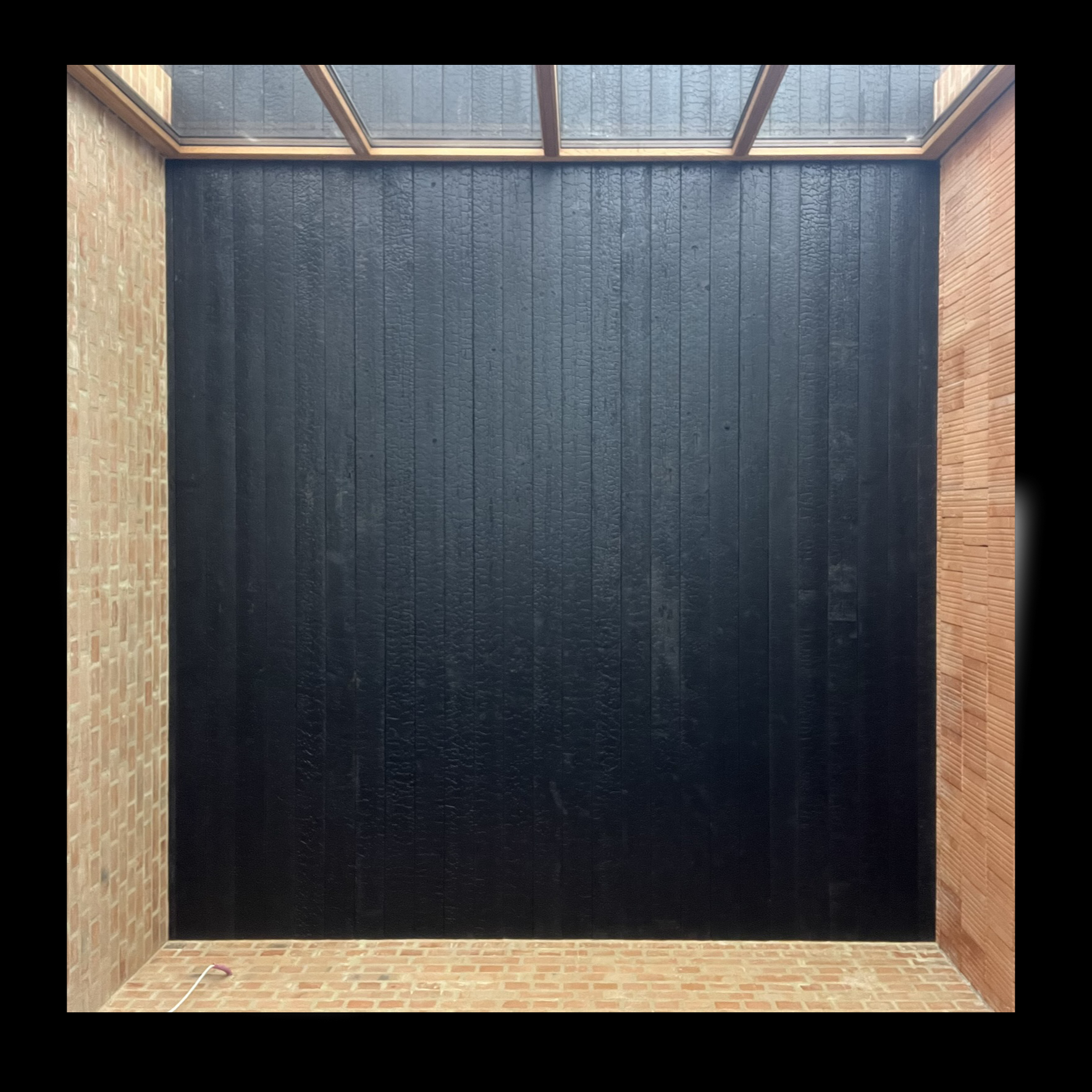 The house experiments with exposed construction both inside and outside: visible brick and block masonry, exposed concrete lintels, polished concrete floors and natural clay plaster surfaces. Oak joinery and built-in furniture introduce warmth to the otherwise robust material palette. A strong identity emerges from the contrast of deep red masonry and black charred timber cladding, used on the facade and continued into the interior, where generous volumes emphasise the raw material atmosphere.