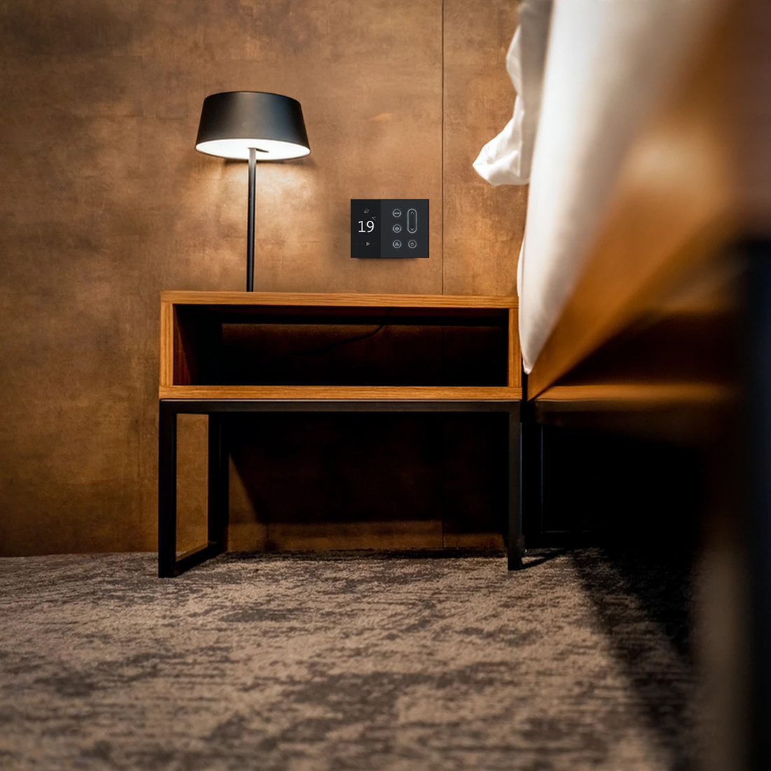 Designed by Gensler, Nova combines refined aesthetics with functional intelligence, offering a balance between design flexibility and technological performance. The collection includes a multi-sensor smart thermostat with an OLED LCD display and a series of fully customizable keypads that control lighting, curtains, blinds, and programmable environmental scenarios. Nova also integrates Do Not Disturb (DND) and Make Up Room (MUR) functions, visible externally through a room-number panel with door-access options.