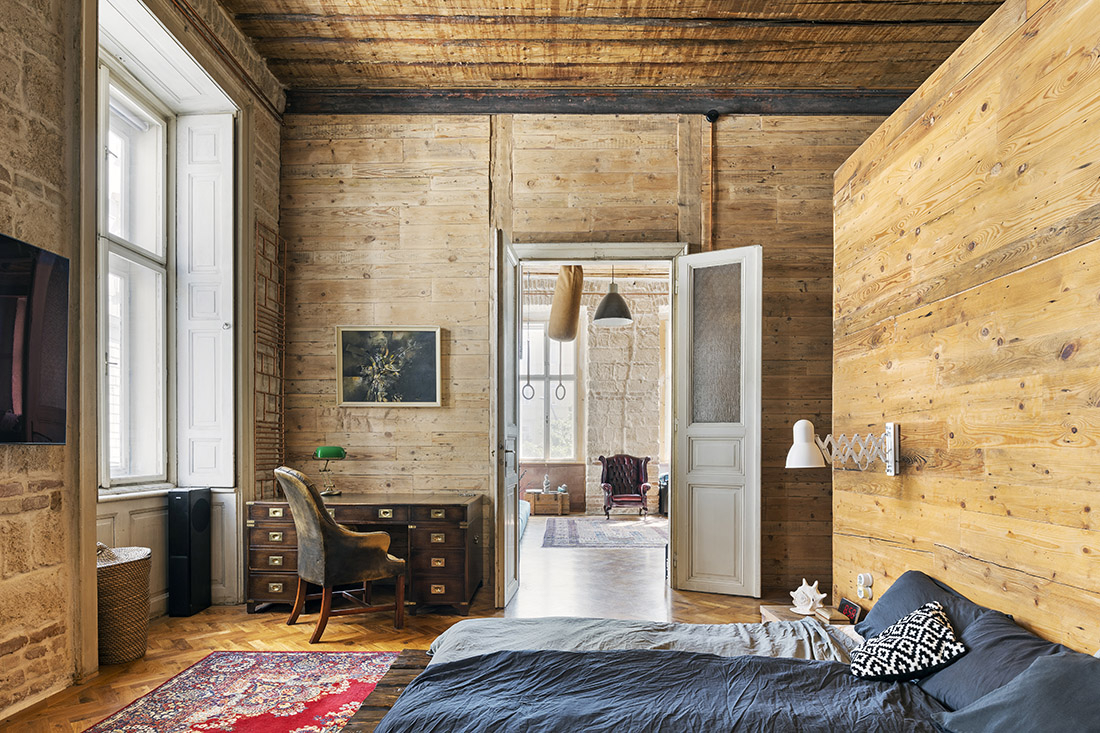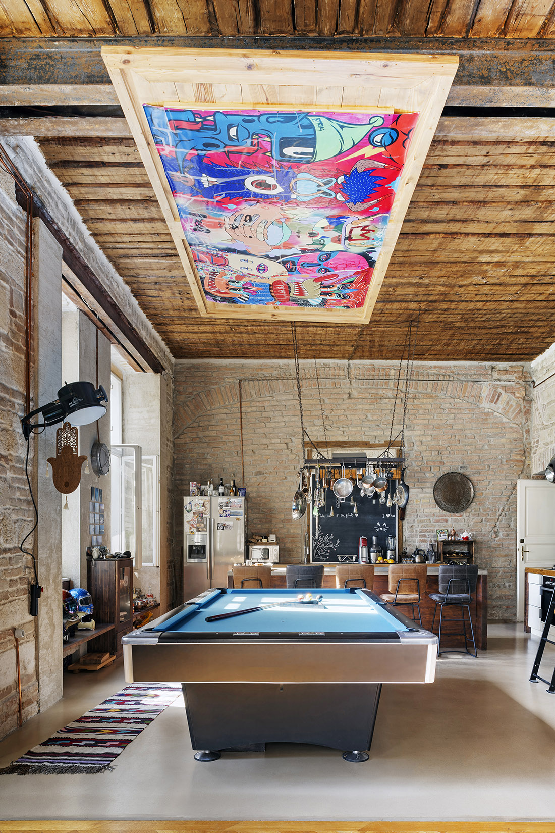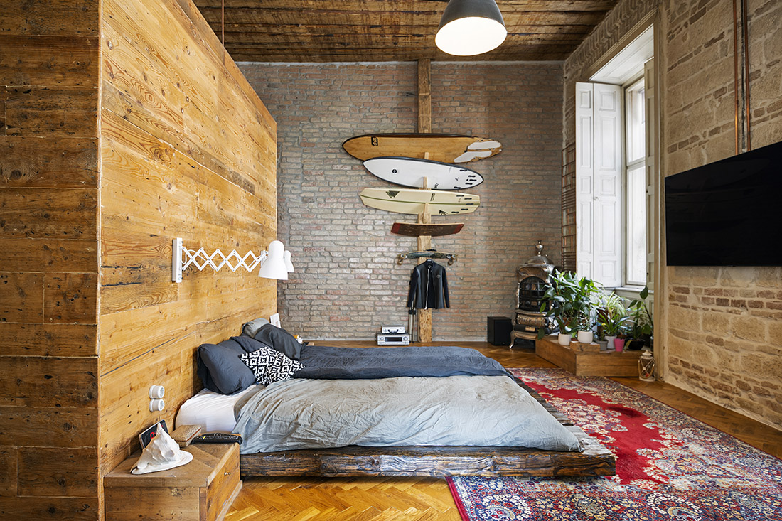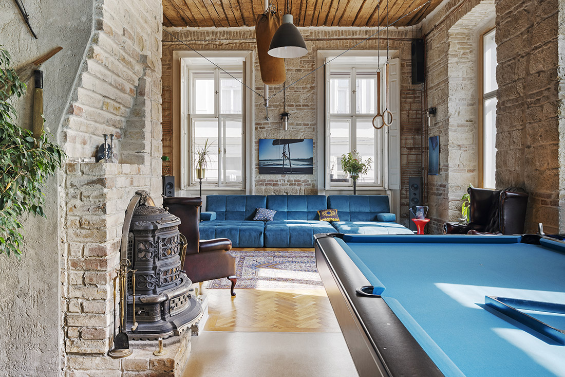 How do raw bricks, an old punching bag and a colorful, graffiti-like work on the ceiling, which even has a function, fit together? In contrast to the minimalist, clean apartments, here and there antiques return, the love of objects steeped in history, the tasteful mixing of different eras and styles. Electric cables routed through former gas pipes, a hundred-and-fifty-year-old bathtub, stripped walls and ceiling, as well as many stories related to the objects make this eclectically furnished downtown apartment special.