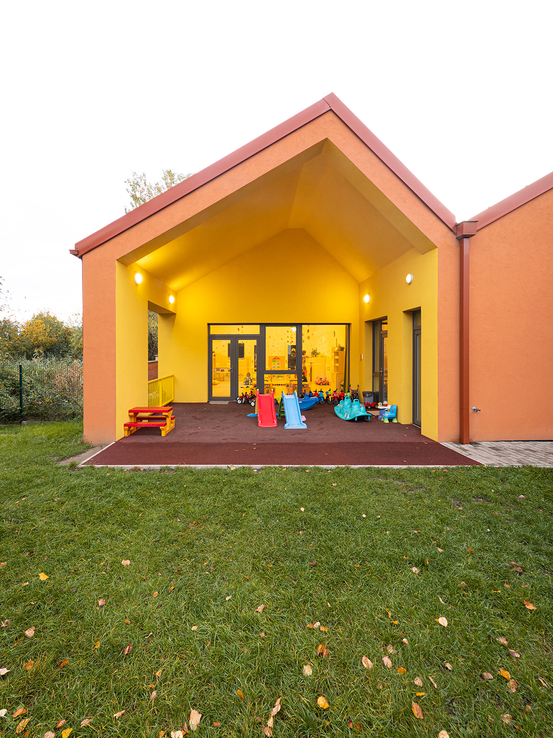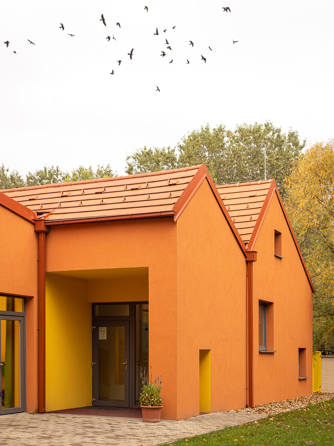 The extension accommodates a new entrance, dressing room, children’s bathroom, gym, and children’s room. Its volume draws on both the archetypal house shape familiar to children and the architectural character of the region. Gabled roofs, playful asymmetries, and carefully placed openings define the building’s expression, while bright colors reinforce its welcoming, child-oriented atmosphere.
