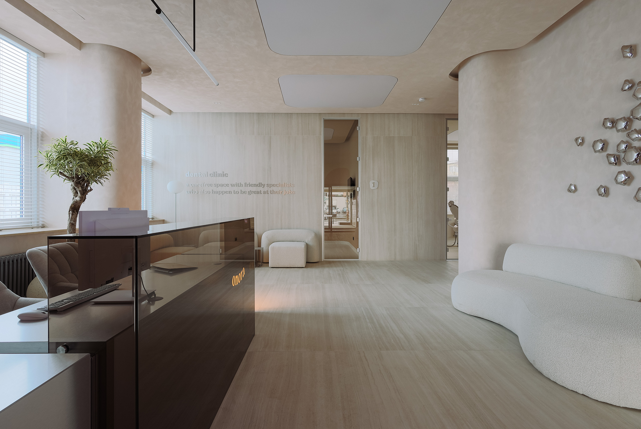 The Onora dental clinic project began with a clear intention: to transform a conventional medical space into a calm, welcoming environment that challenges the typical perception of dental care. Spanning 200 square meters, the design prioritizes openness and visual clarity, featuring only three spacious treatment rooms and generous waiting areas, instead of a dense, profit-driven layout.
