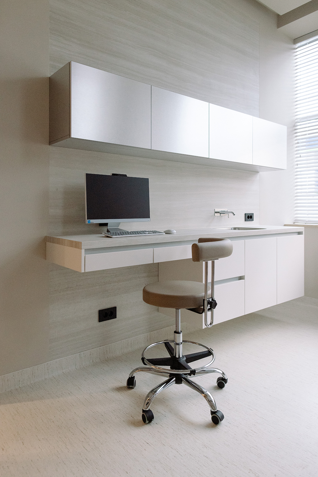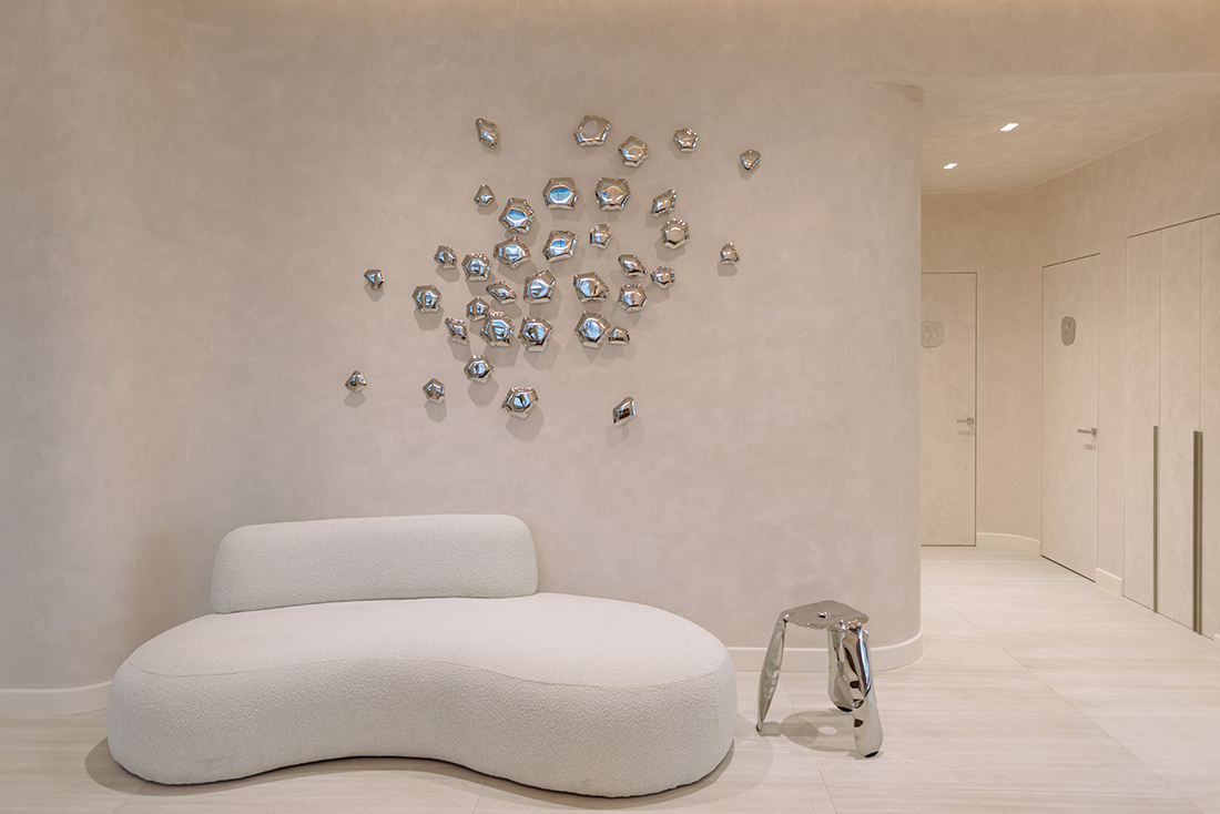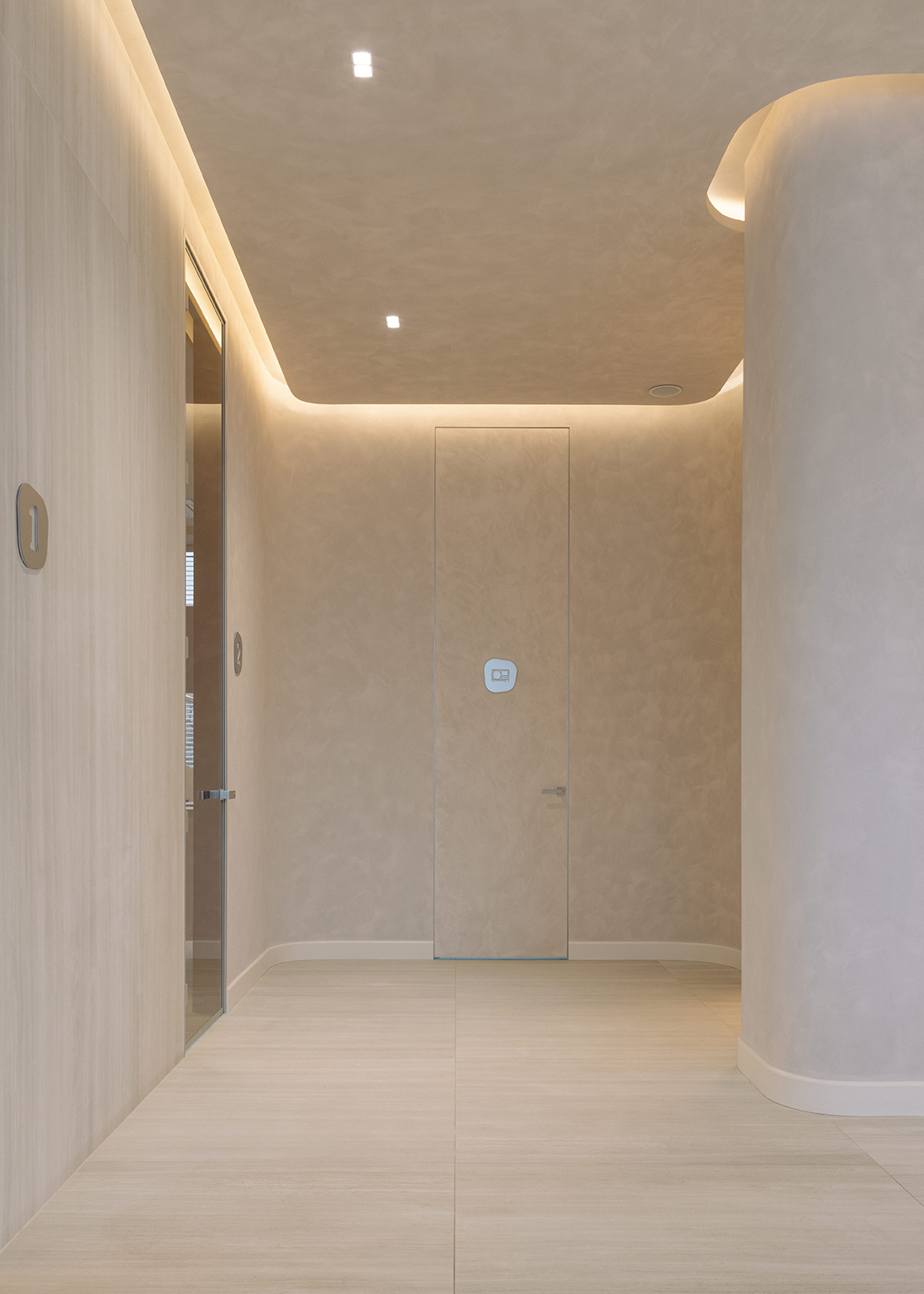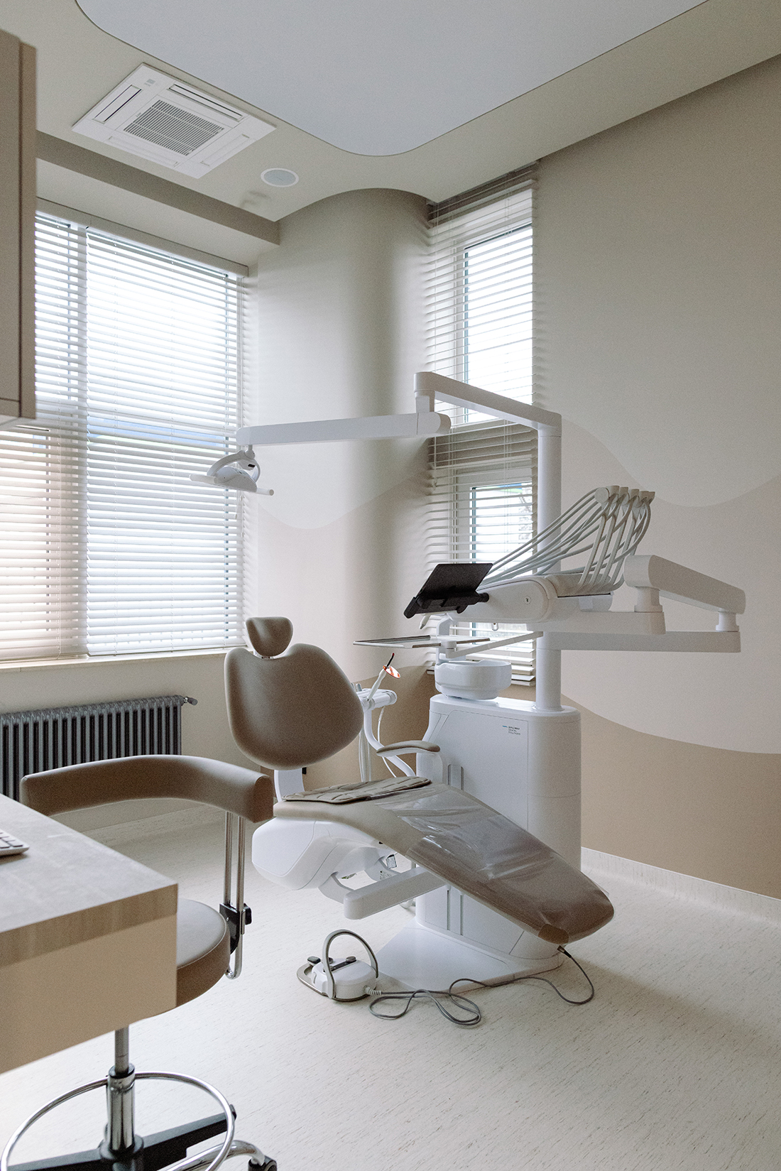 A warm, minimalist approach defines the interior, with a neutral palette enriched by soft whites, subtle pastels, natural tones, and delicate brushed metal accents. Natural light plays a central role, enhancing clean furniture lines and the fluid, organic geometry of the walls. The space is conceived as a cohesive whole, with seamless transitions and discreetly integrated functional zones. By balancing aesthetics with comfort, Onora redefines the dental experience, replacing anxiety with a sense of ease and quiet refinement.