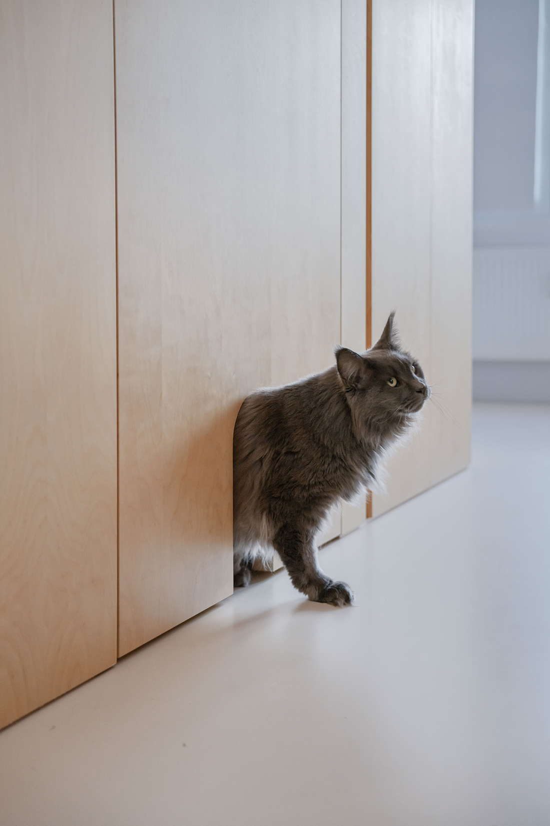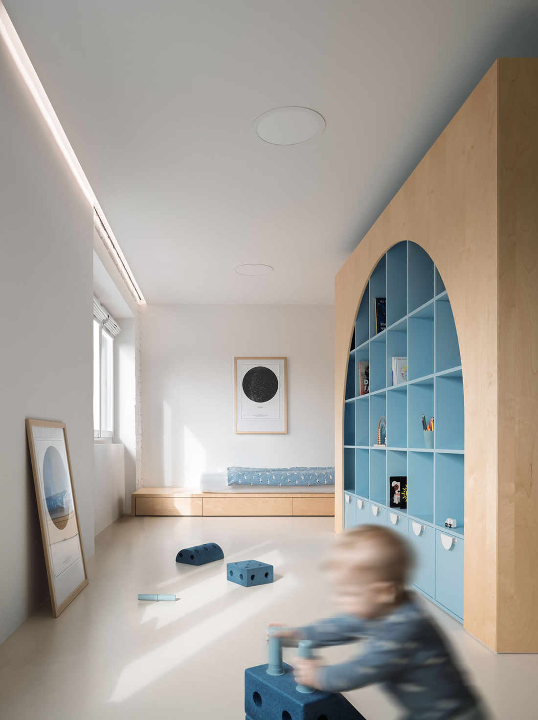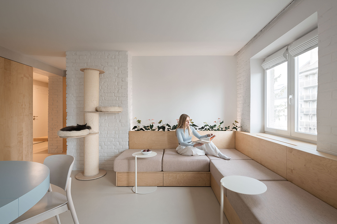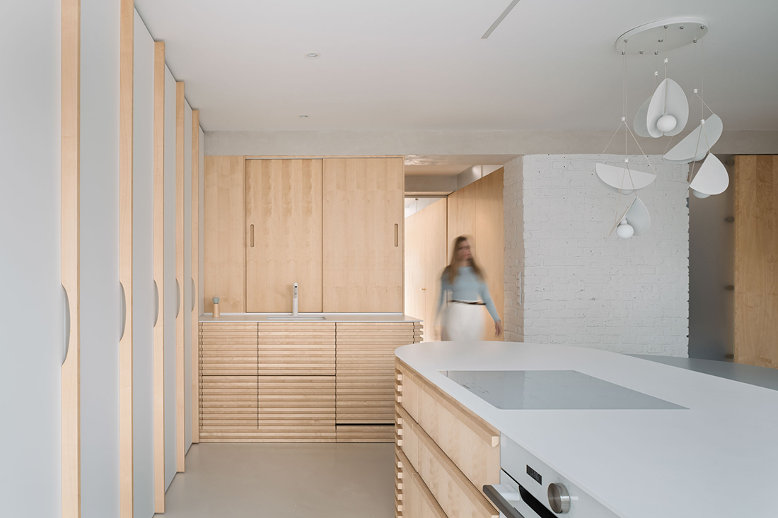 The only fully enclosed room is the bedroom, conceived as a compact sleeping box with an oversized bed (2.8 × 2.1 meters), designed to comfortably accommodate both parents and their children together. A key design theme is the exposure of structural materials. Load-bearing walls were stripped to reveal the original brickwork, finished only with white paint. New partitions were designed more like built-in furniture than traditional walls. Made with light birch veneer, they provide warmth, durability, and practicality, especially in high-use areas around the core.