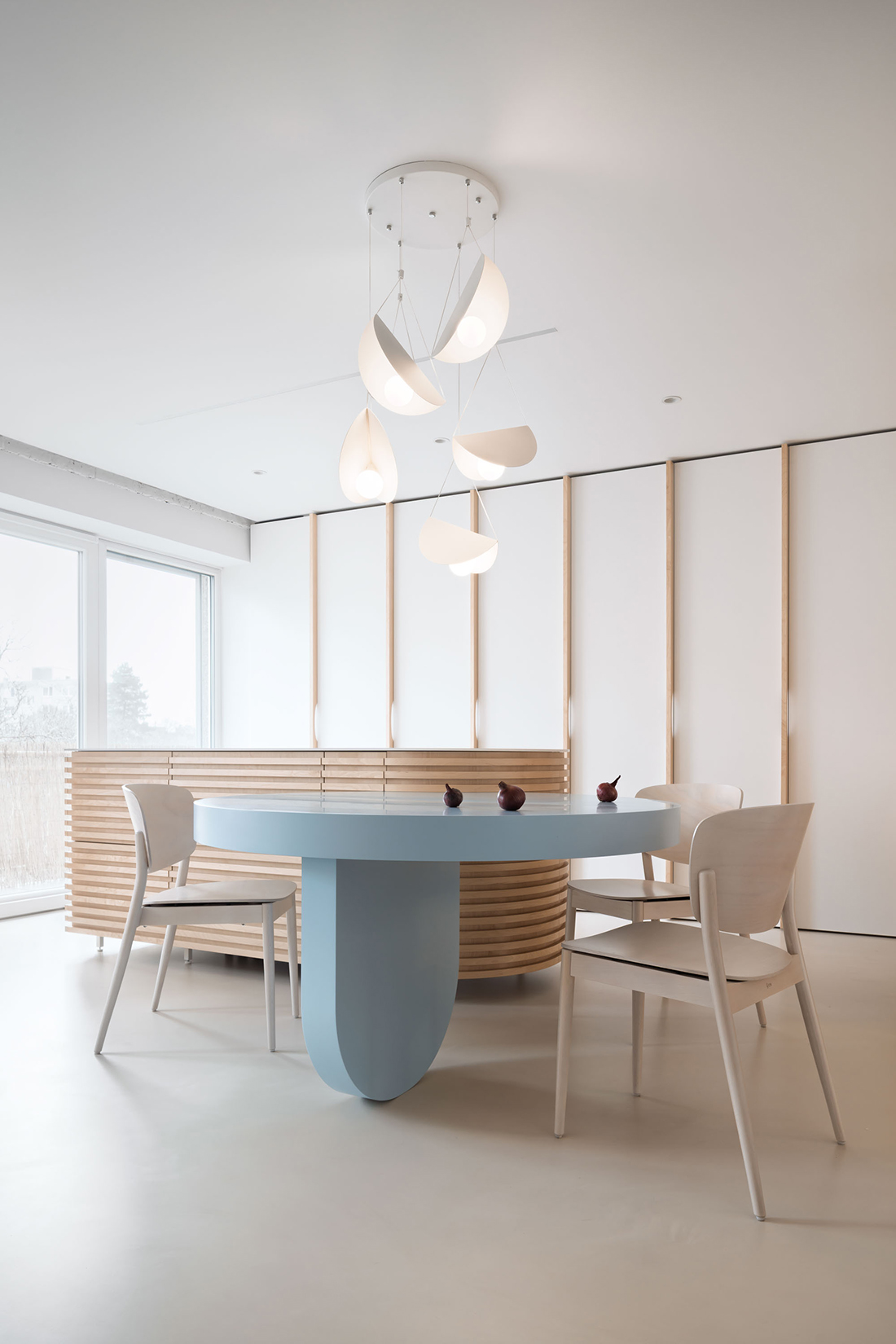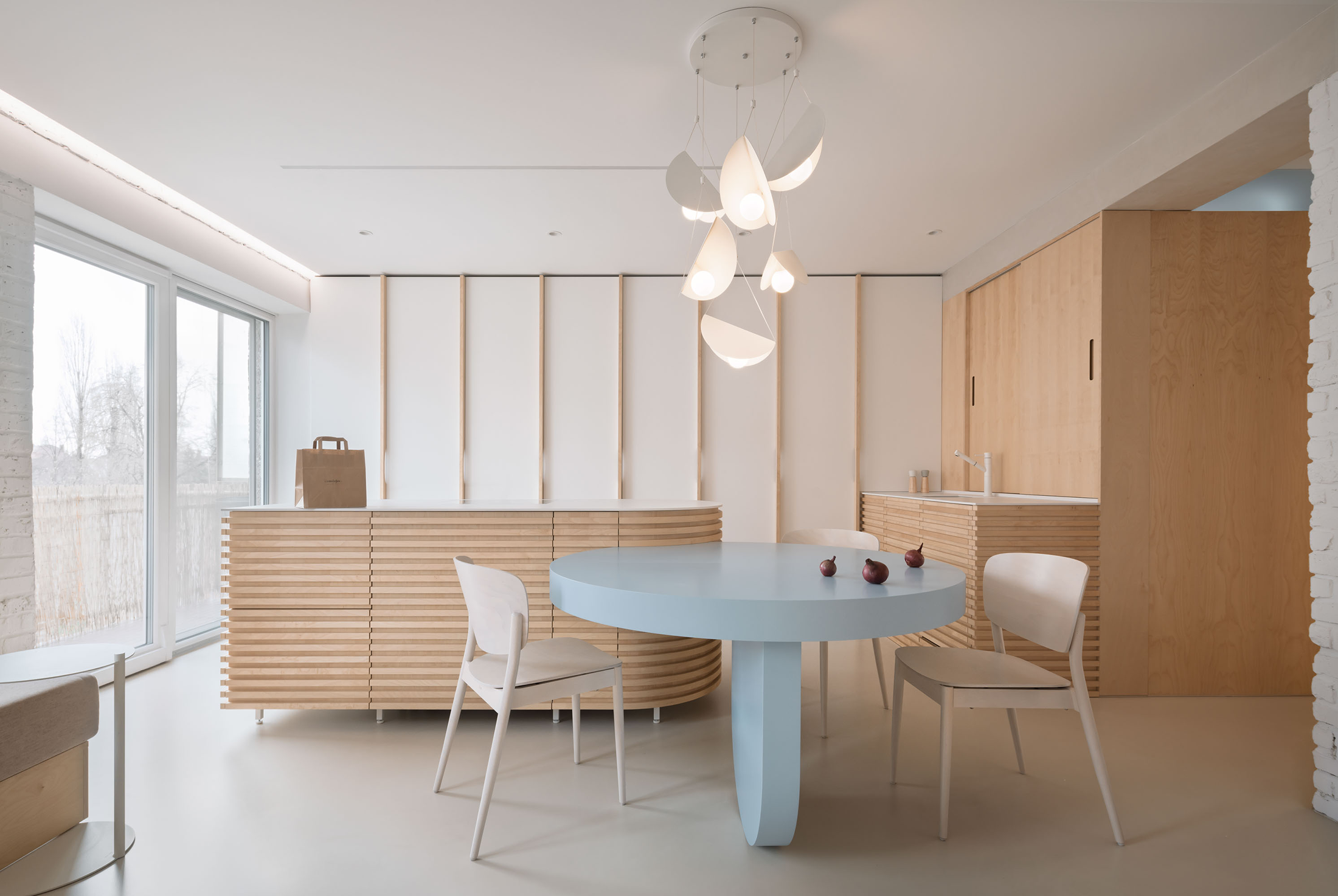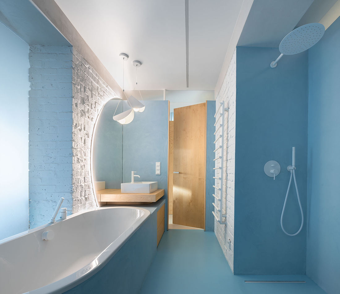 The only fully enclosed room is the bedroom, conceived as a compact sleeping box with an oversized bed (2.8 × 2.1 meters), designed to comfortably accommodate both parents and their children together. A key design theme is the exposure of structural materials. Load-bearing walls were stripped to reveal the original brickwork, finished only with white paint. New partitions were designed more like built-in furniture than traditional walls. Made with light birch veneer, they provide warmth, durability, and practicality, especially in high-use areas around the core.