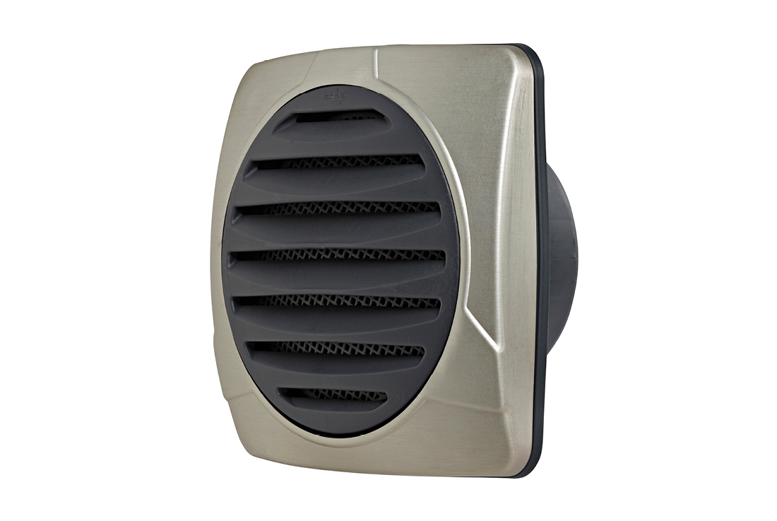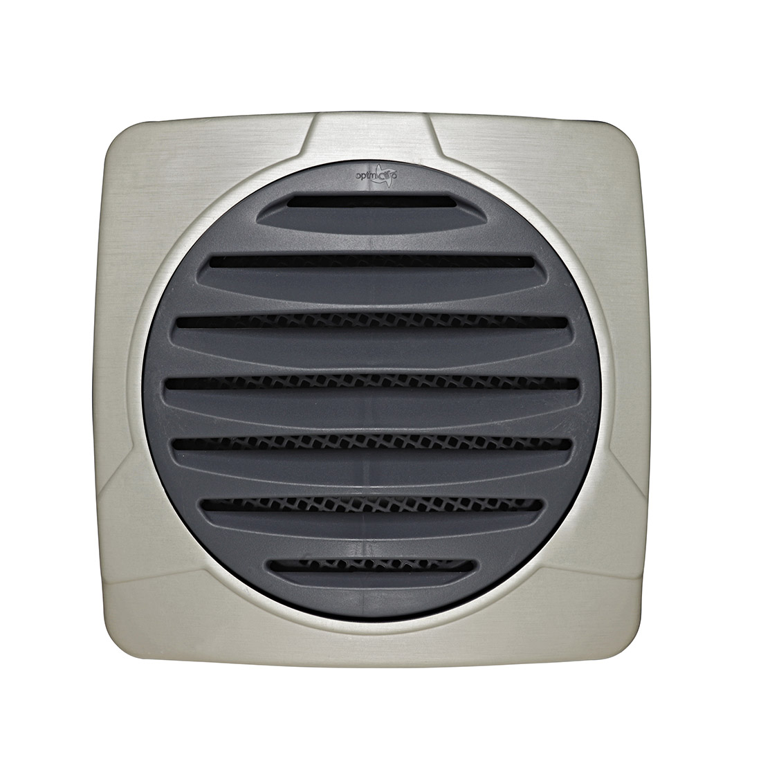 The OptimAIRo exterior vent is an original product with a modern design, featuring aluminum cover frames, UV-resistant and water-resistant fins, and environmentally-friendly PP. It ensures easy installation, is Blower Door test certified, and includes a modular magnetic backflow flap and ball bearing to protect from insects. Mounting materials are included.