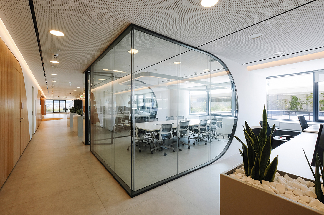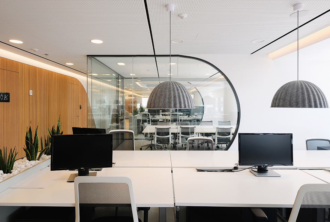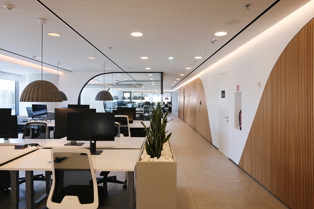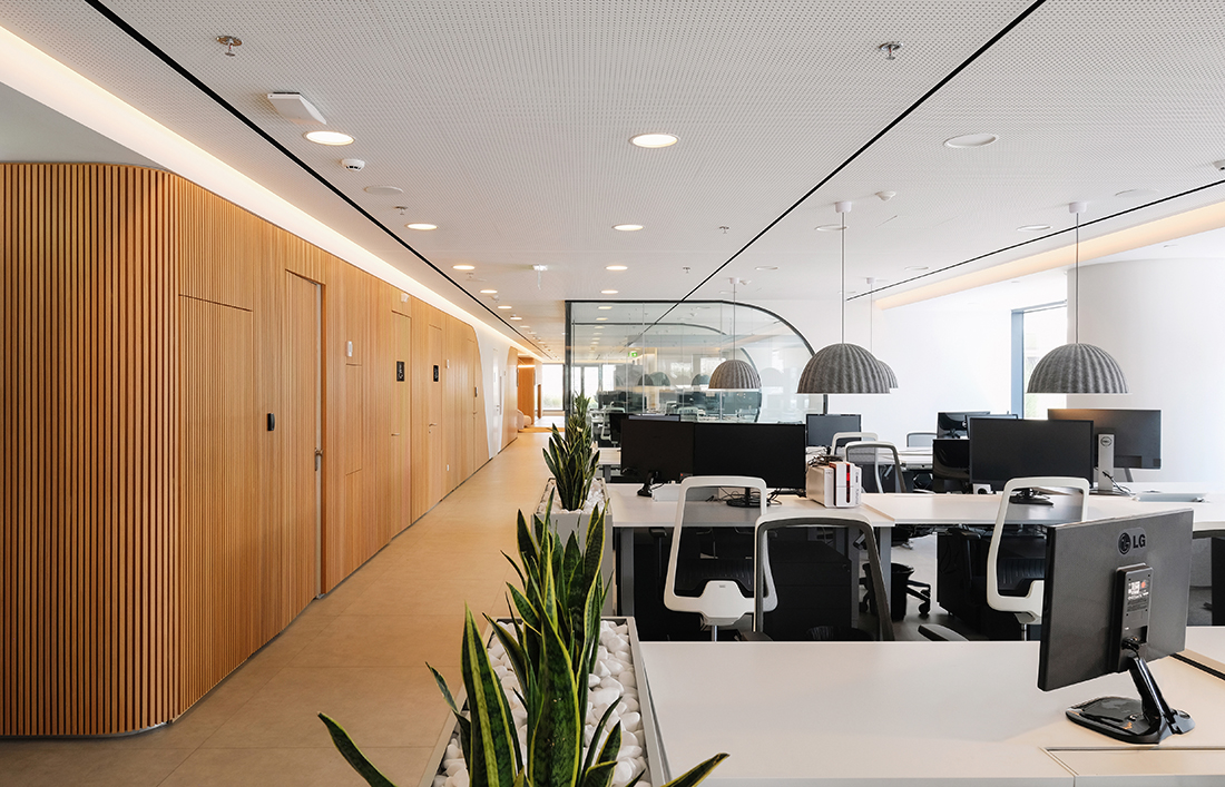 The large, open-plan area accommodates 40 employees and is complemented by a translucent meeting space that maintains visual continuity while reducing noise. The workspace also includes private offices, individual office pods, a kitchen, and a café. Plants are strategically placed to delineate different zones, while the design takes advantage of the building’s spacious and bright external areas to enhance the work environment.