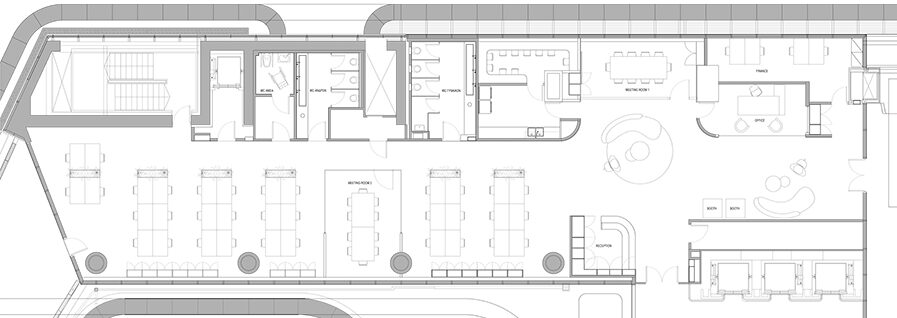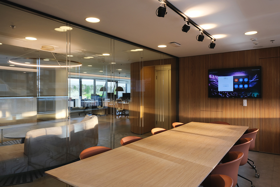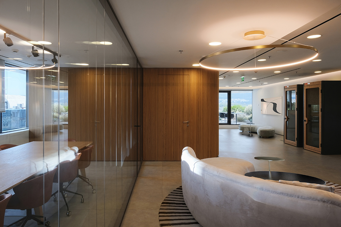 Upon entry, a welcoming reception and lobby, inspired by residential interiors, sets a cozy tone with oak wood, curved sofas, carpets, and artwork. Adjacent to this is the main meeting room, continuing the oak wood theme and featuring essential storage and a mini bar.