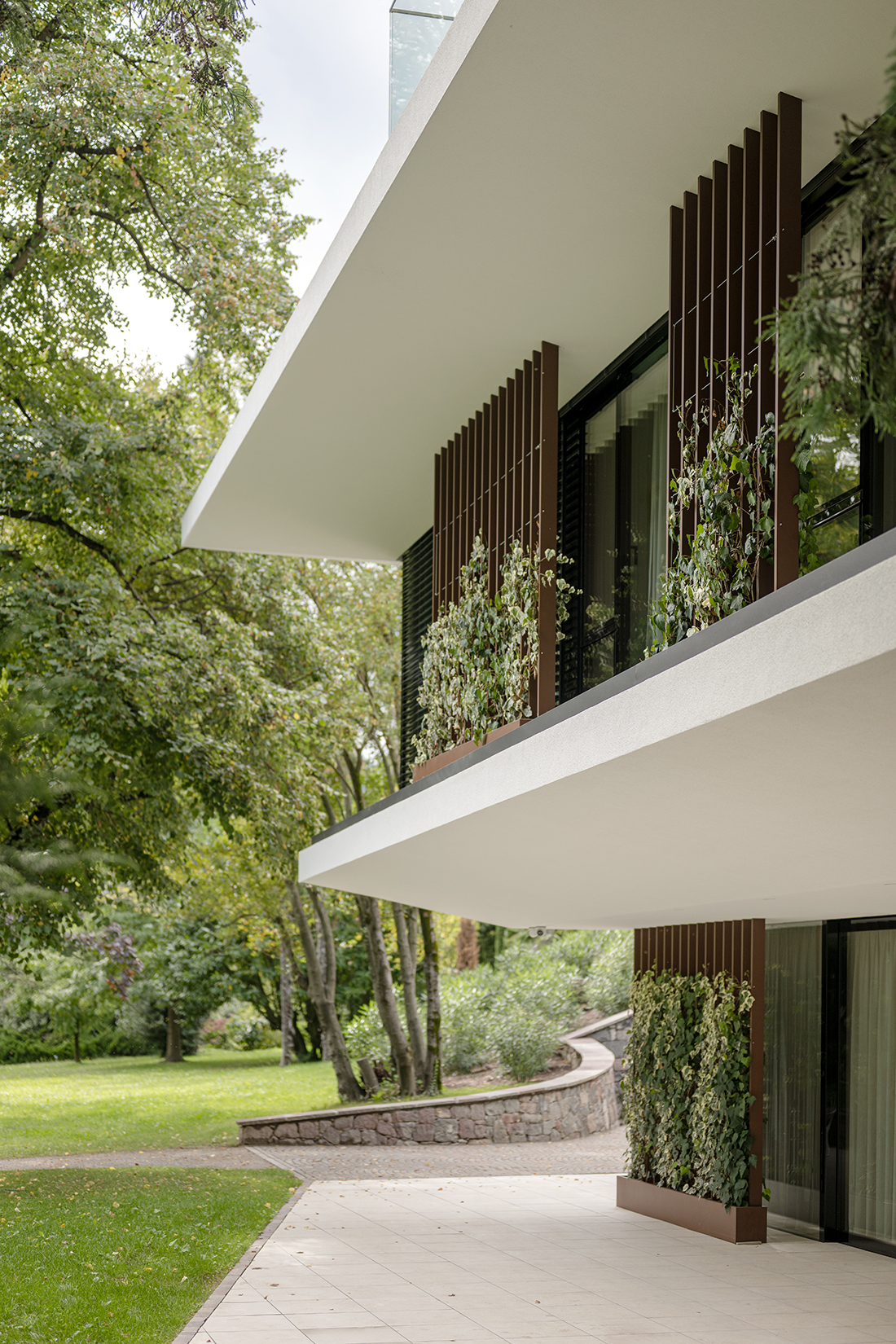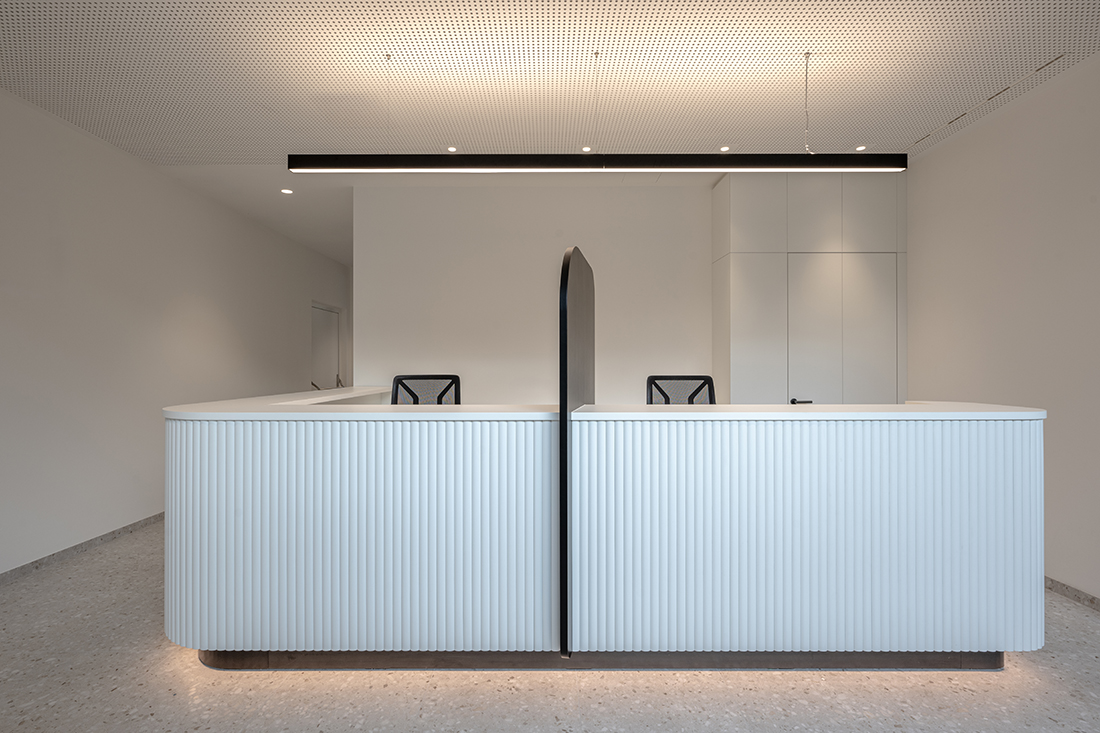 A former pavilion is replaced by a new, three-story structure with a light, floating appearance, defined by overlapping volumes and a transparent glass façade that connects indoor and outdoor spaces. The ground floor hosts a new outpatient clinic with ten treatment rooms and offices. The first floor includes five assisted flats for elderly or dependent individuals, all facing the park. A conference room, laundry, and storage are placed in the basement. White surfaces enhance the sense of calm and well-being. The surrounding park, open to the public during the day, offers shaded paths and sensory experiences that support relaxation and mental health.