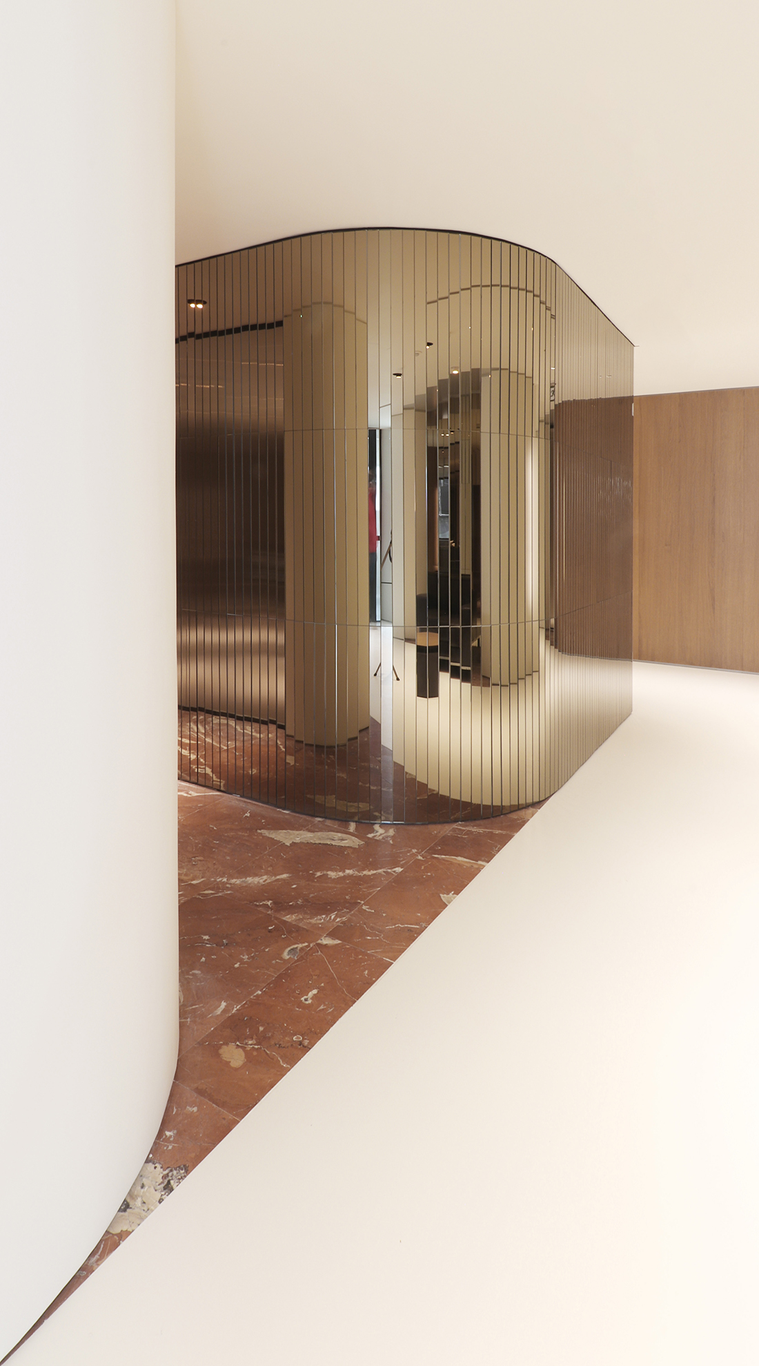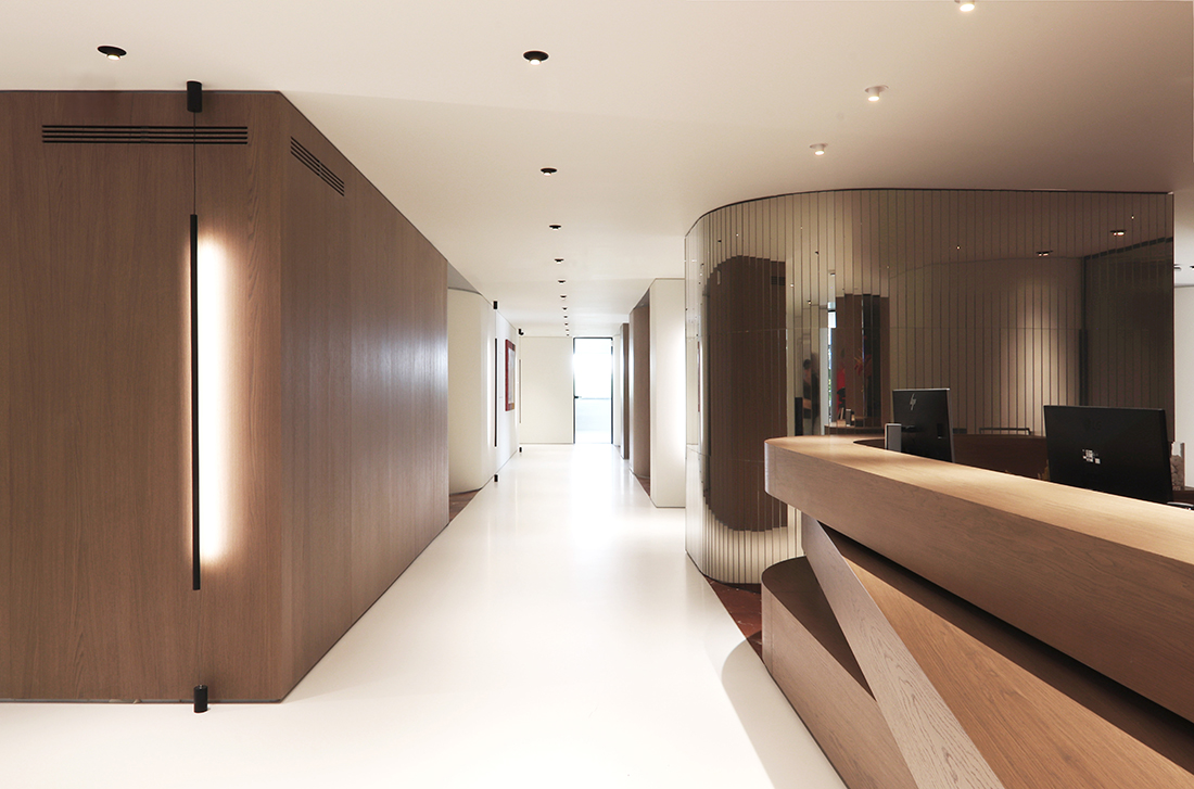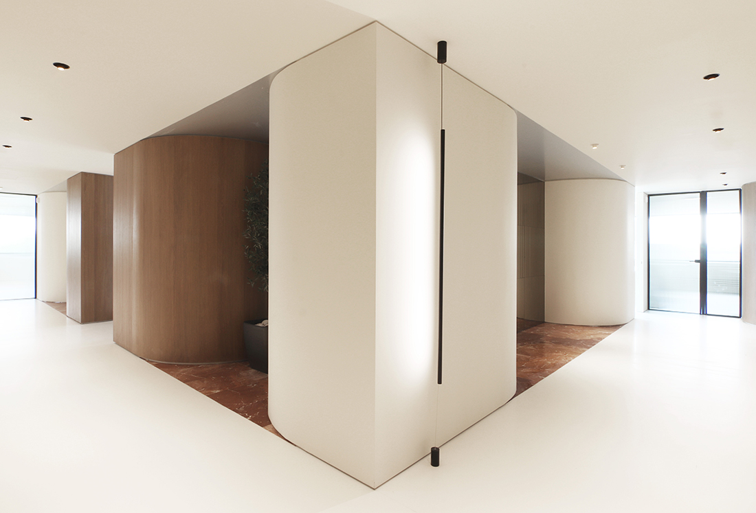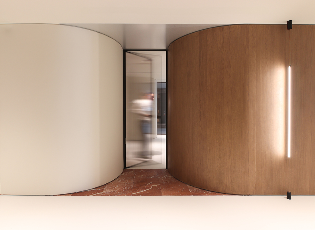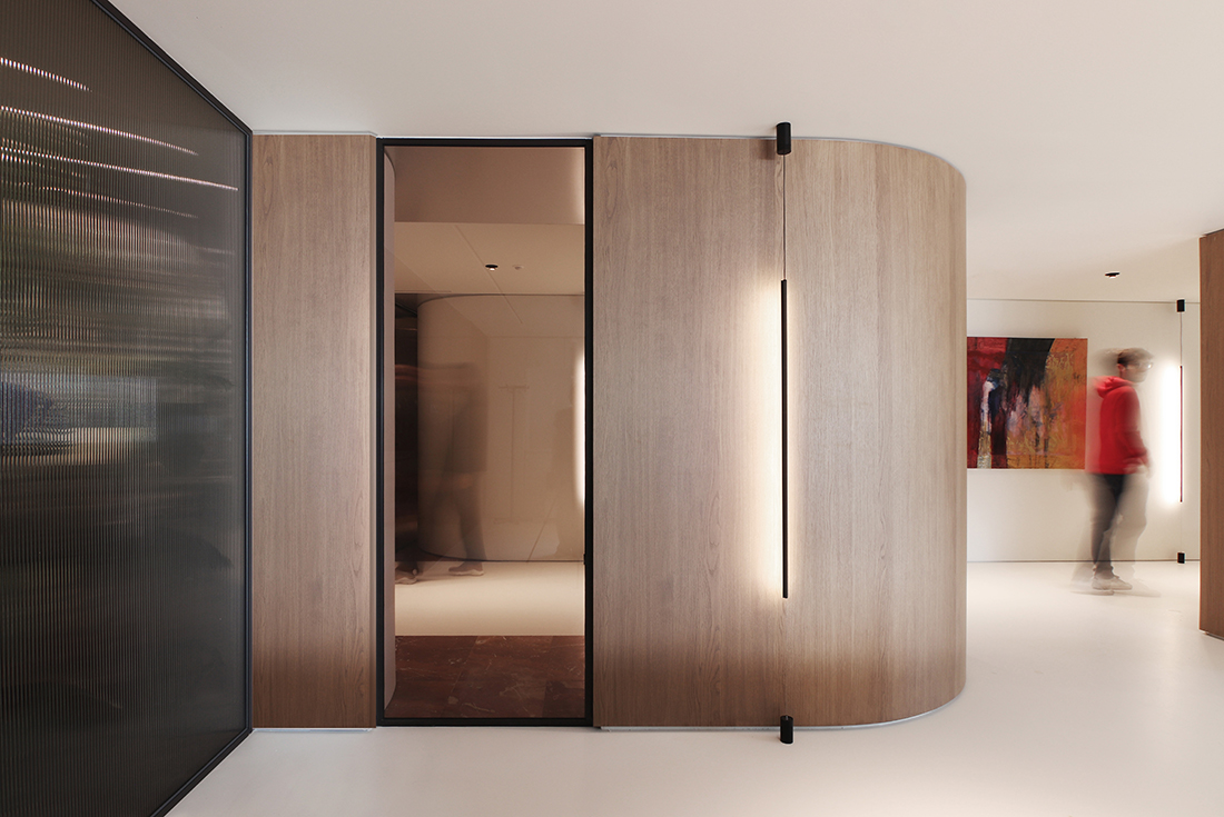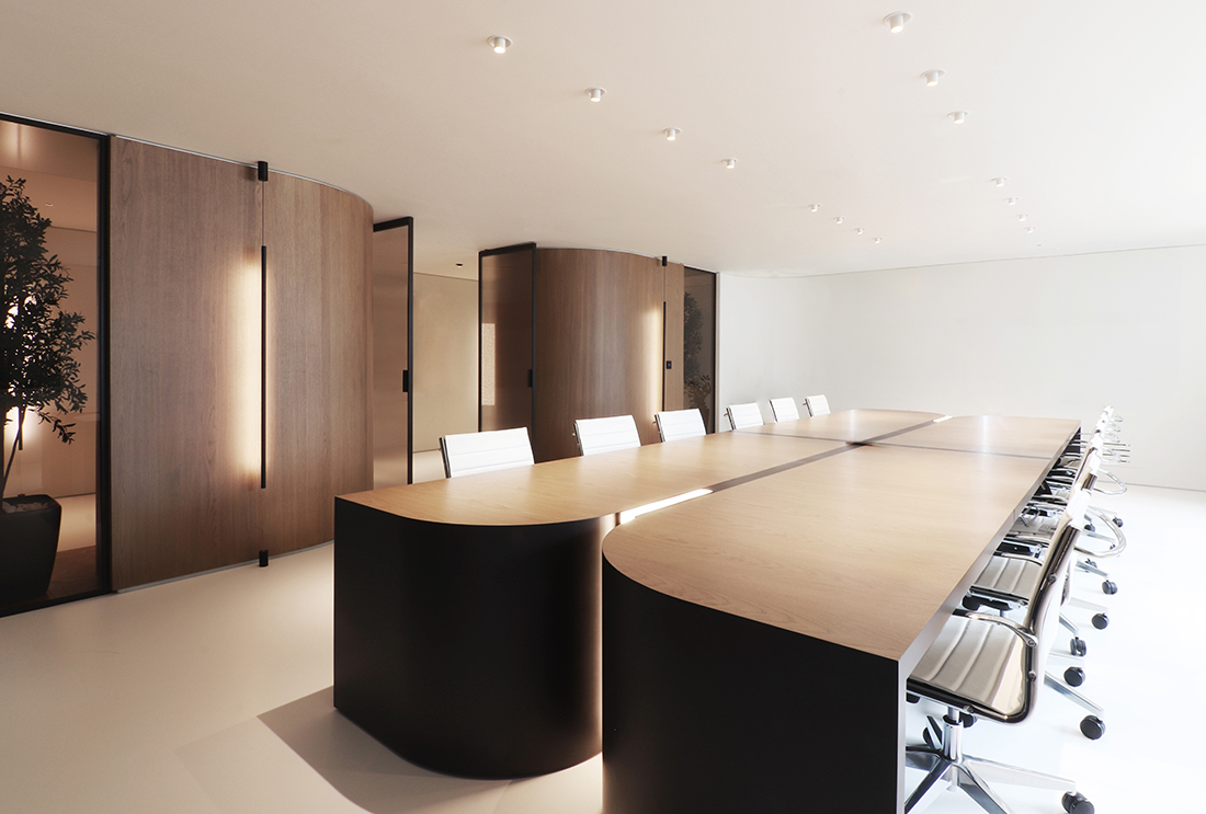 The existing structural grid inspired the core concept of curved “petals” that replace conventional partitions, soften geometry, and choreograph movement. Pocket gardens, ribbed tinted glass, and layered materials – white seamless flooring, oak veneers, Rosso Alicante marble, and reflective stainless-steel ceilings – create rhythm and moments of visual escape. Soft, atmospheric lighting enhances focus and wellbeing, resulting in a calm, fluid environment that merges technological precision with a sense of inhabitation rather than mere production.