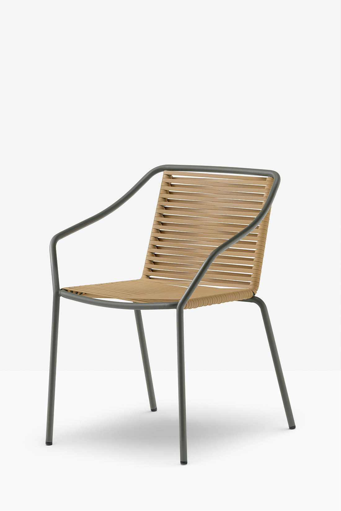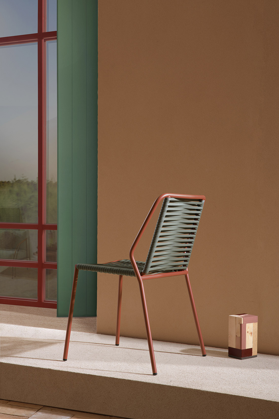The side chair features a blend of rational, geometric lines with softer forms that echo the contours of the human body. Philía is distinguished by its durable steel tubular frame, complemented by a seat and backrest wrapped in a PVC cord textured with horizontal lines. The weaving technique intersects at the center, ensuring both elasticity and high resistance. This hand-crafted weave not only provides softness and comfort but also gives the chair a bespoke, tailored appearance. The frame and weave are available in single-color or two-tone options, offered in warm shades that seamlessly integrate with natural surroundings.