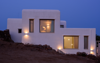 The villas are located in front of the sea, in a summer location near Thessaloniki, Greece. The complex consists of five summer apartments with independent exterior entrance. Each apartment is formed by the living room, one bedroom, the kitchen, the bathroom and an outdoor private seating area in front of the living room and the bedroom. There is an outdoor parking space with independent entrance for vehicles in the southern part of the plot. The architectural synthesis of the building is focused on simple lines and composition of minimal rectangular volumes, aiming at the best integration into the environment. The combination of white walls and the black stone fit the aesthetics of the area and allow the best reading of volumes. The horizontal blinds on the south façade prevent the summer sun and contribute to the thermal comfort of each apartment.