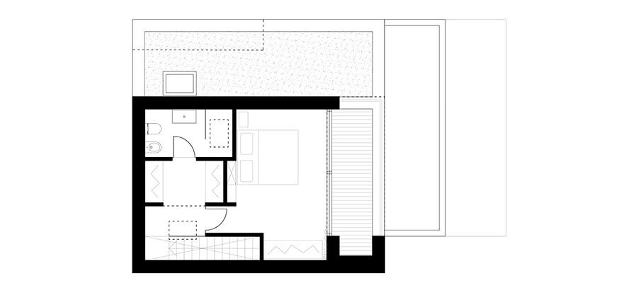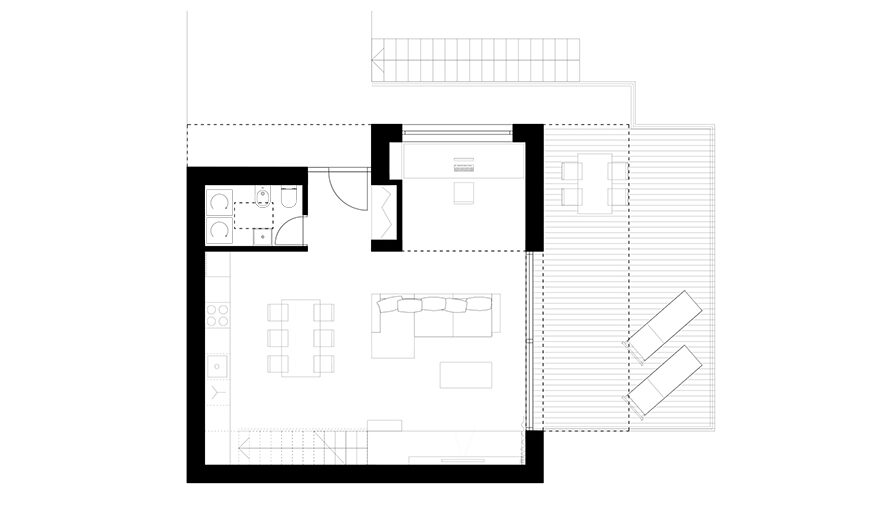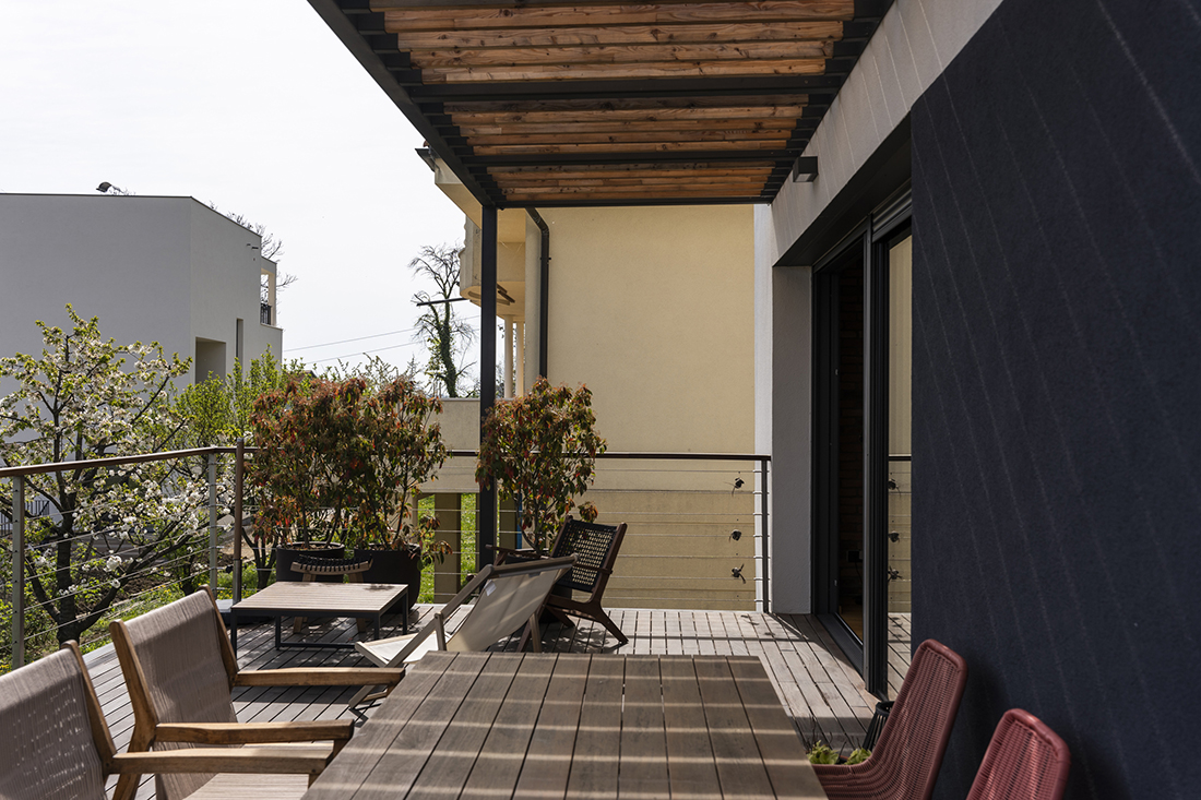 Generous terraces extend the small yet functional interior space, creating a sense of openness. The extended eaves of the flat roof elongate the structure, giving the impression of a much larger house. The façade combines two contrasting colors with wooden cladding, adding warmth and visual interest to the design.