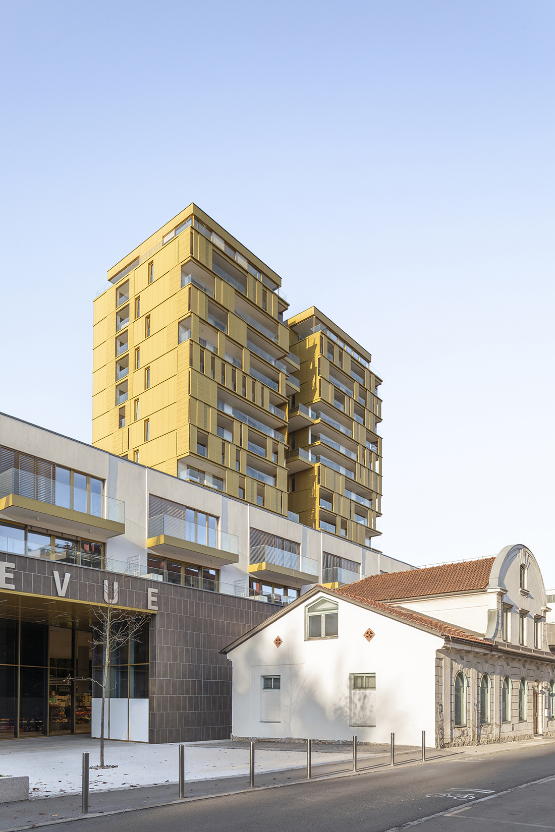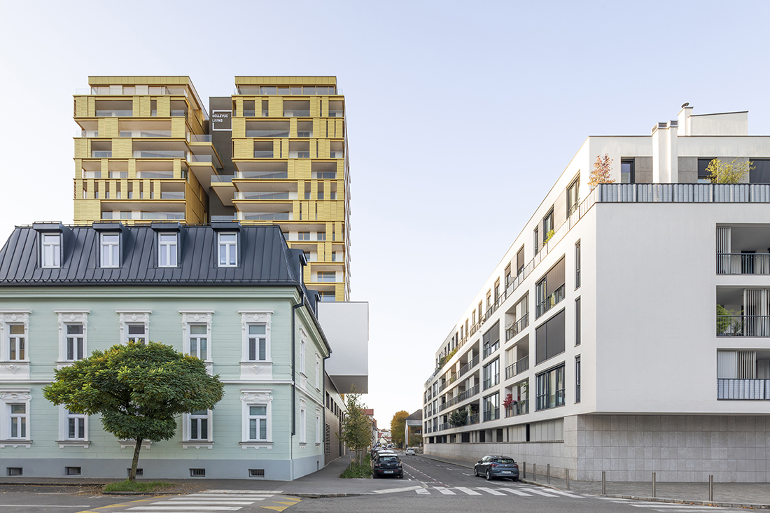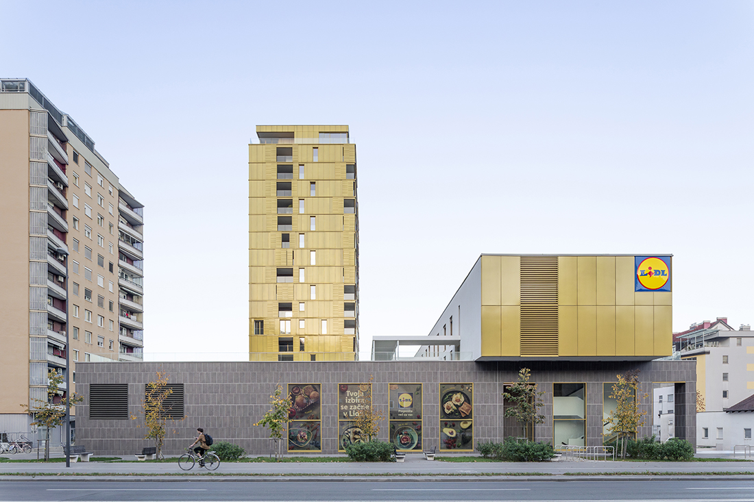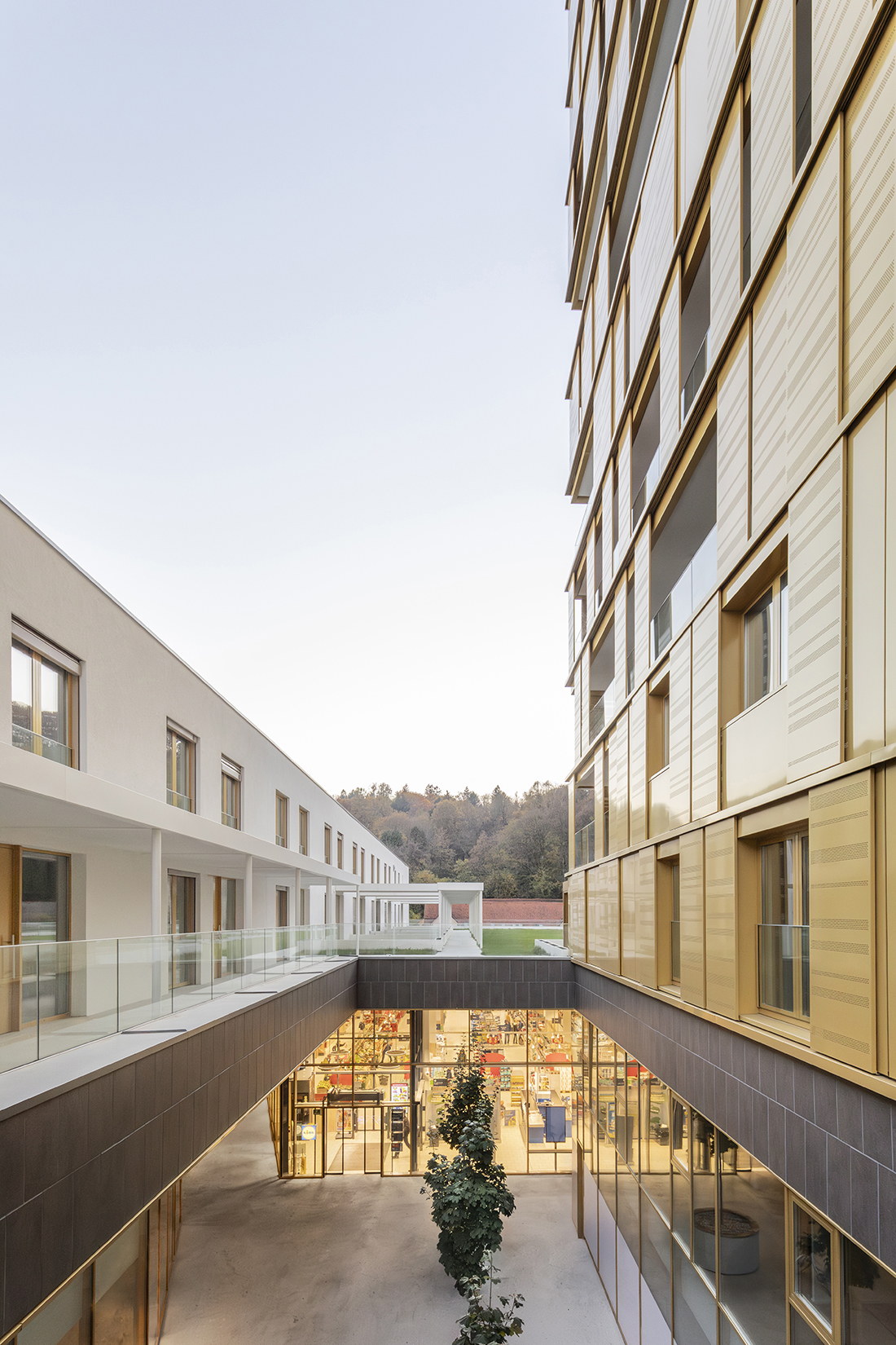 The residential section is set back from Celovška Road, elevated to avoid noise, and ensures good sunlight and views. Despite being near Tivoli Park, a rooftop park is planned for residents, enhancing the microclimate. Tree-lined streets are designed along the perimeter, with a small urban park marking the complex’s entrance, offering hospitality services and a water feature.