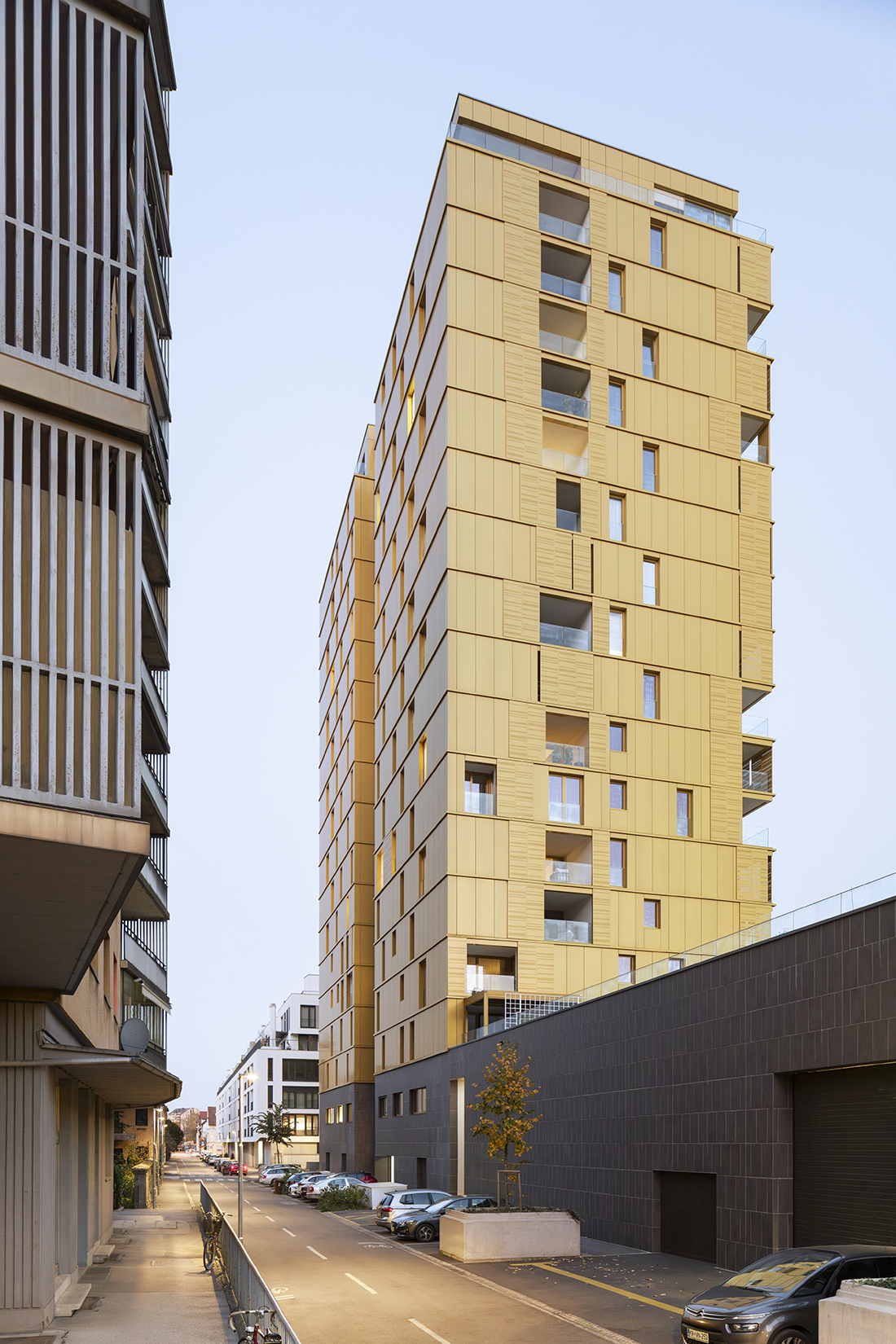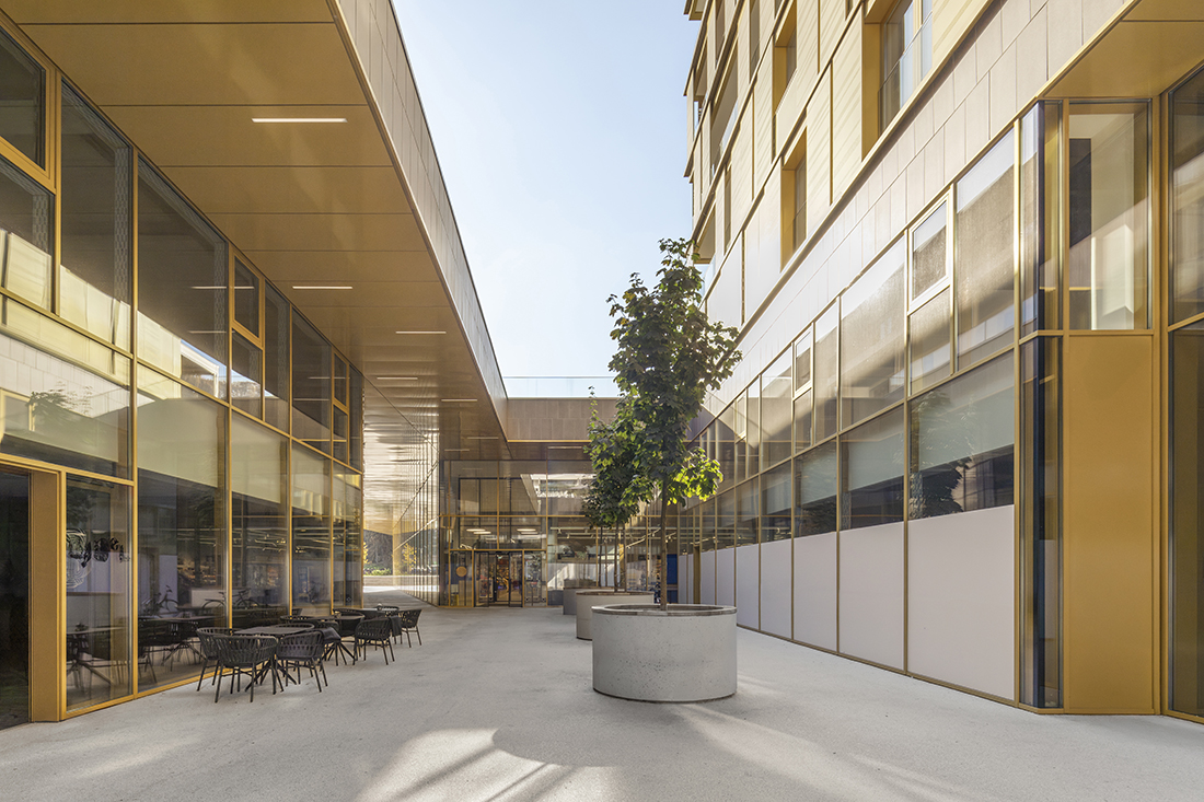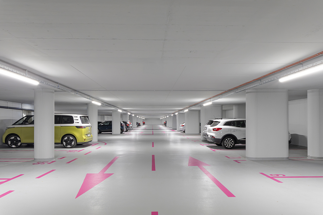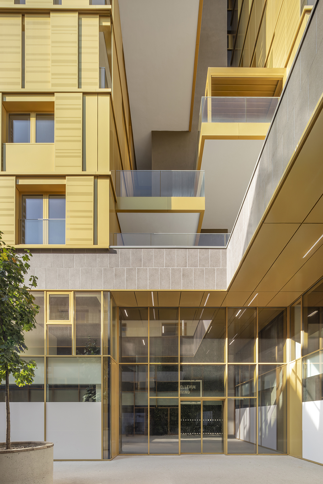The residential section is set back from Celovška Road, elevated to avoid noise, and ensures good sunlight and views. Despite being near Tivoli Park, a rooftop park is planned for residents, enhancing the microclimate. Tree-lined streets are designed along the perimeter, with a small urban park marking the complex’s entrance, offering hospitality services and a water feature.