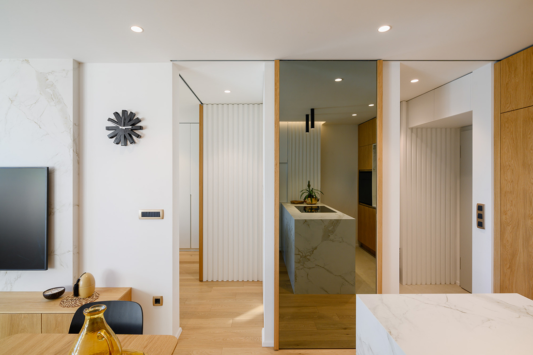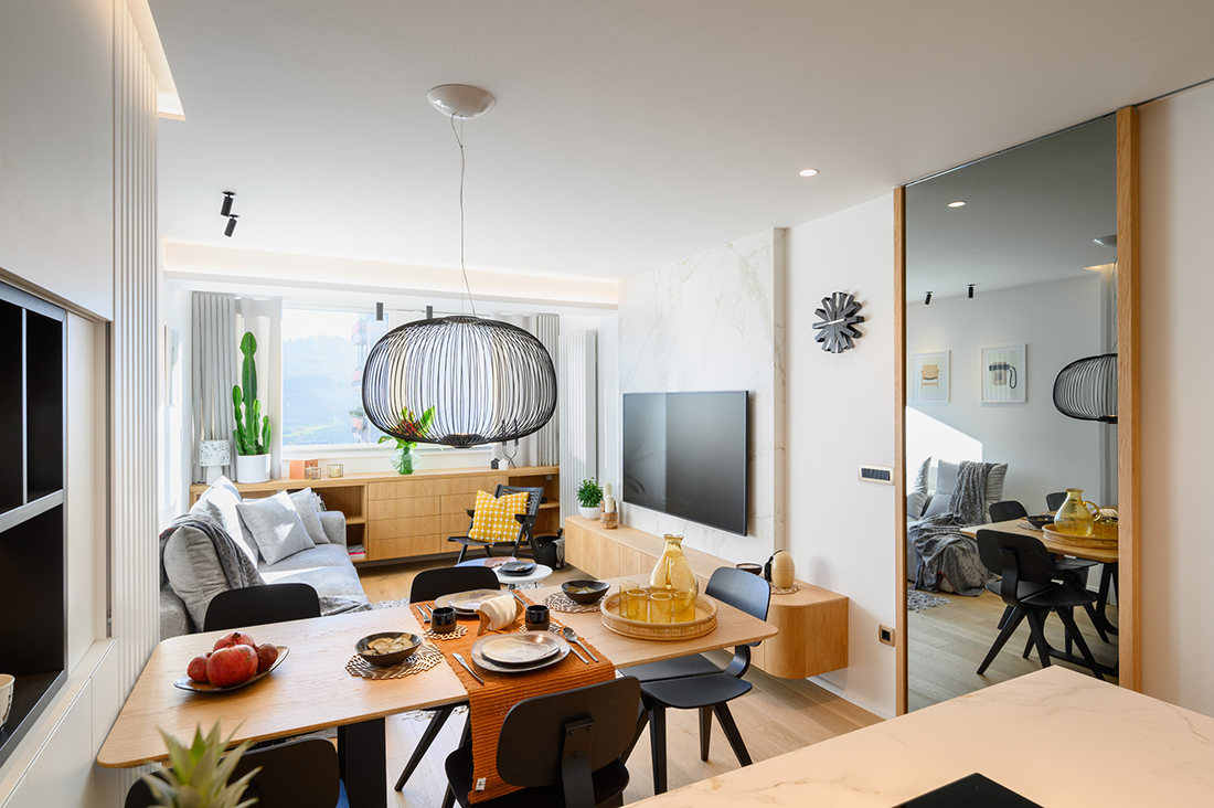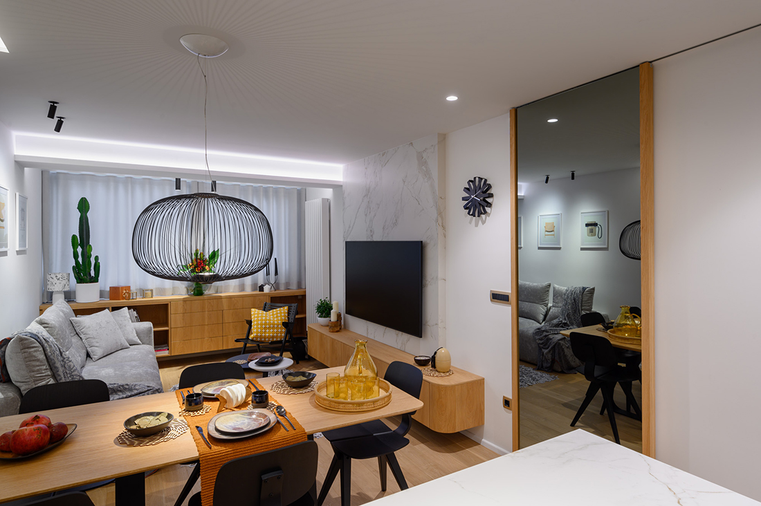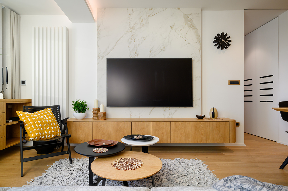 We recently completed the renovation of a smaller apartment in a block built in 1977. The project included a full upgrade of electrical and plumbing systems, along with a slight redesign of the floor plan. All furniture was custom-made to maximize the efficient use of space while ensuring a comfortable living environment for the young couple moving in. This renovation showcases how thoughtful updates can breathe new life into aging housing stock, making it suitable for modern living.