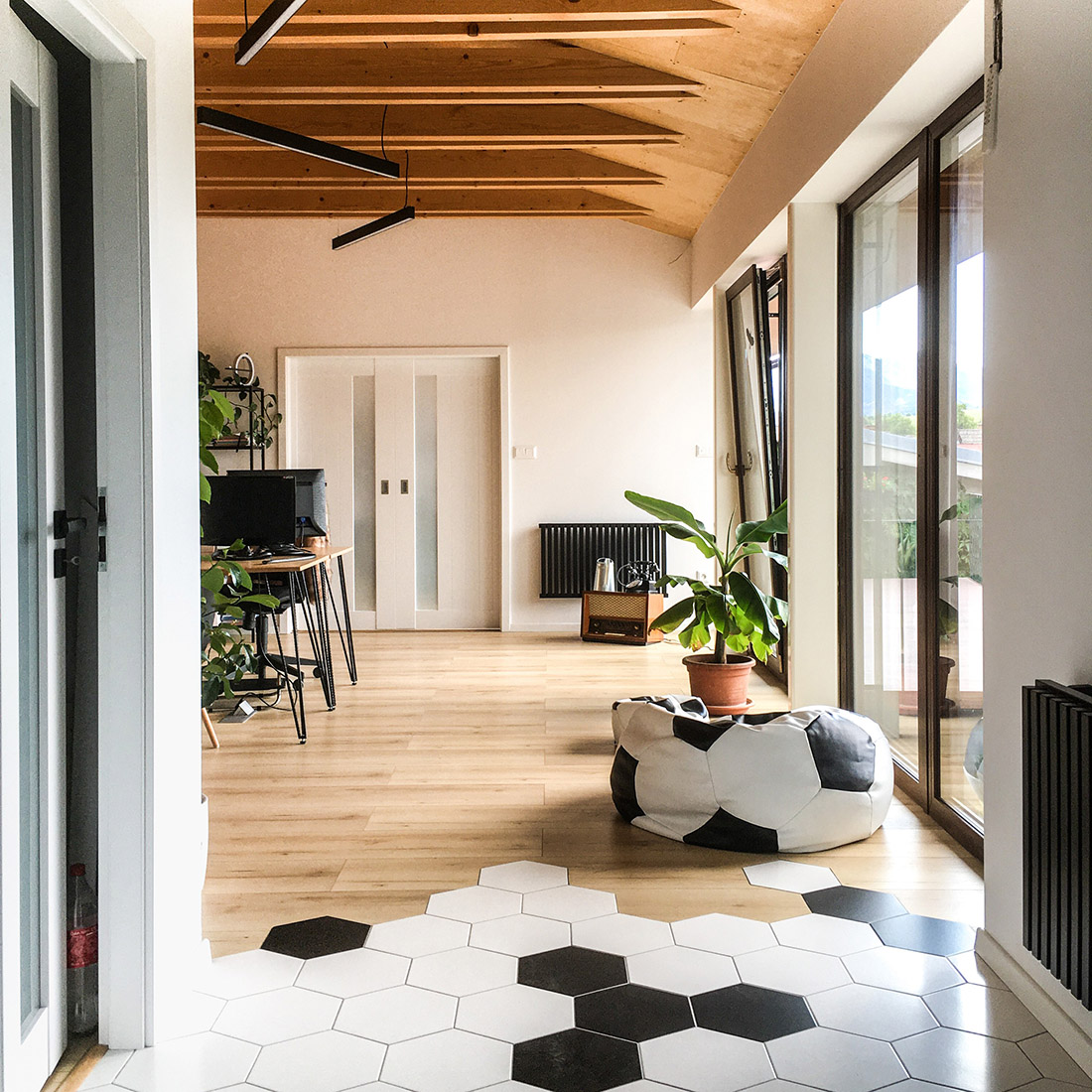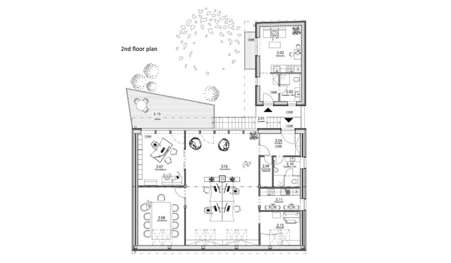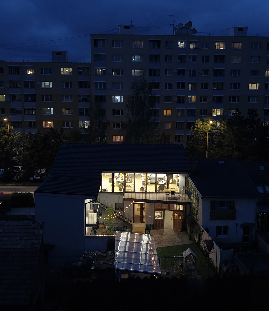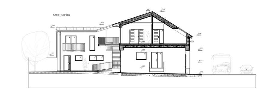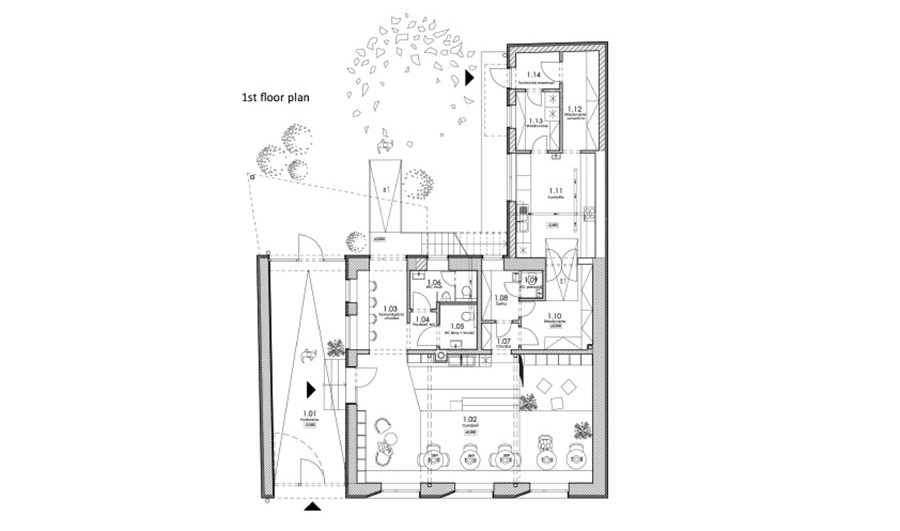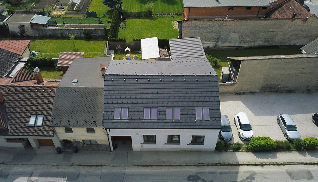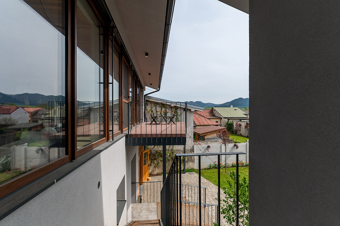 The object of the reconstruction of a terraced townhouse from the 1820s consists of respecting the basic characteristics of the building, its frontage to the main roads, subdivisions and connections to the surrounding buildings. The location in the building block creates a closed yard of family houses creating either relaxation areas or areas for planting greenery. The entrance through the existing underpass completes the traditionality of townhouses, closed from the street, due to noise as well as privately in the building’s courtyard. The multifunctional object creates space for the background of the architectural studio in the attic part with the space of an apartment and the function of small production – confectionery on its ground floor with the possibility of opening to the building’s courtyard. The basic characteristic consists of a modest, trailing character oriented to the main communication, which leads along the facade of the building and openness to the courtyard – a residential block full of greenery.