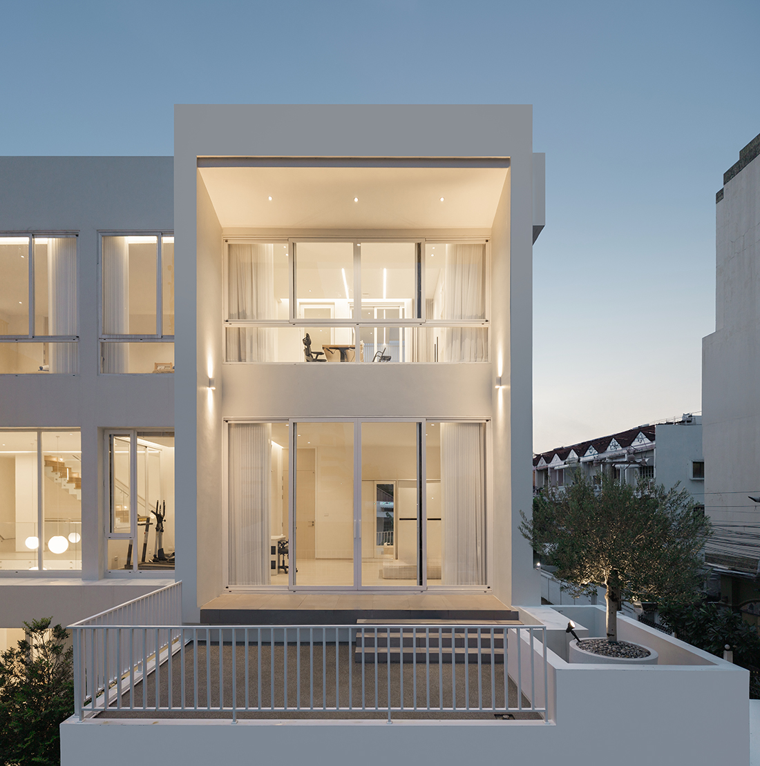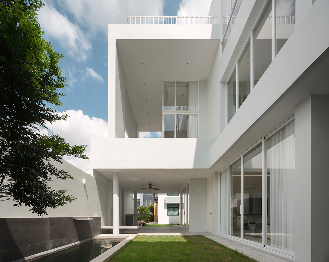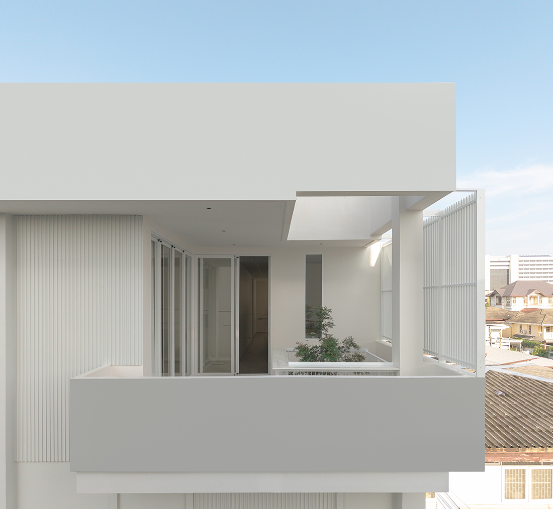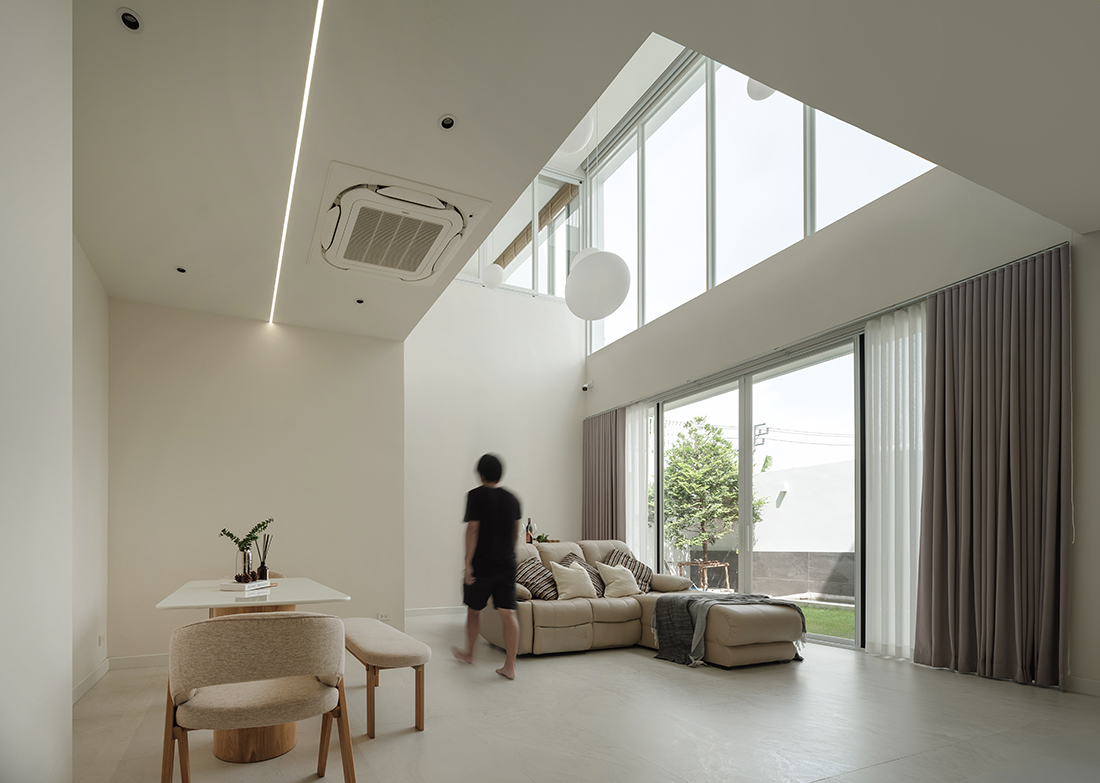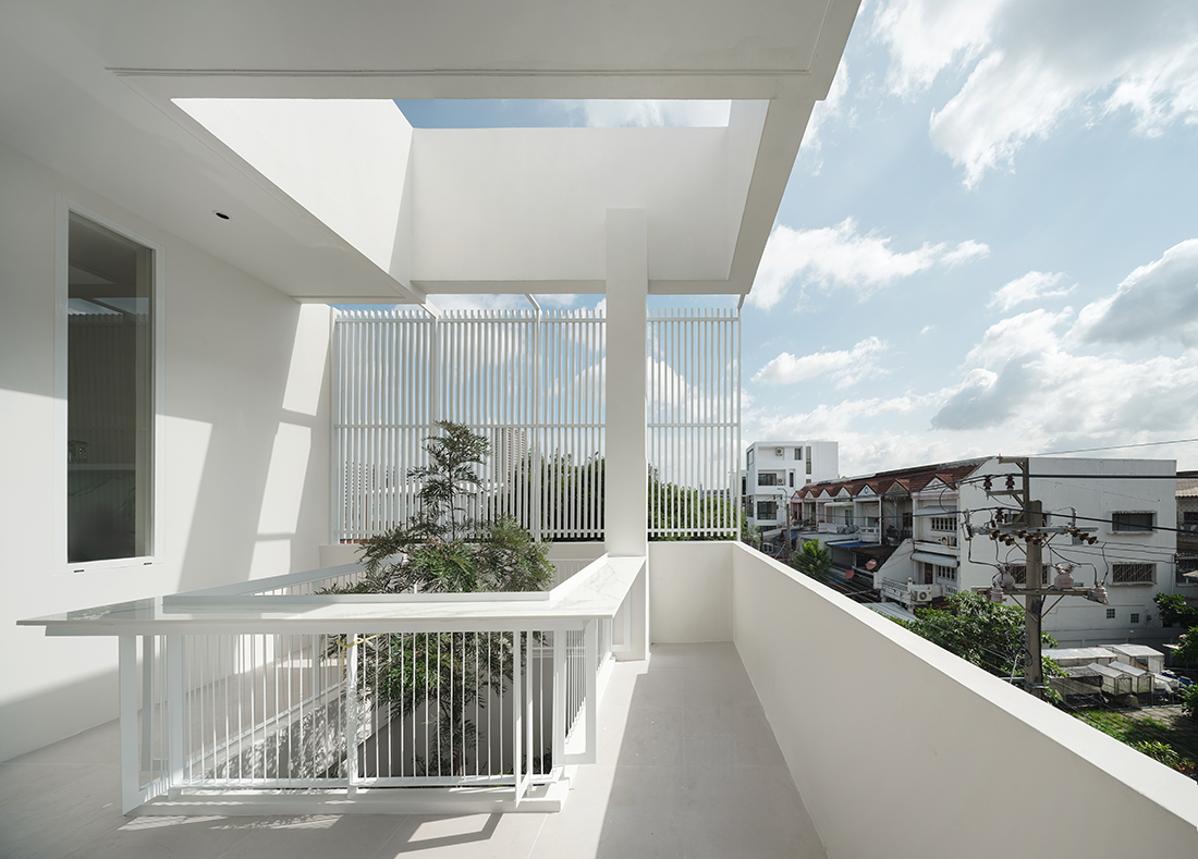 The ground floor functions as a self-contained “Parental Suite”, featuring a double-volume void and a koi pond, to blend wellness with accessibility. The second level serves as a “Social Hub” with independent access and semi-outdoor balconies, while the third-floor “Private Penthouse” offers a master sanctuary with a panoramic bar. Architecturally, the building contrasts a protective, minimalist white façade with a warm, tactile timber interior. A central “Light Well” skylight harvests natural illumination, creating a thermal stack that encourages passive airflow throughout the dense footprint.