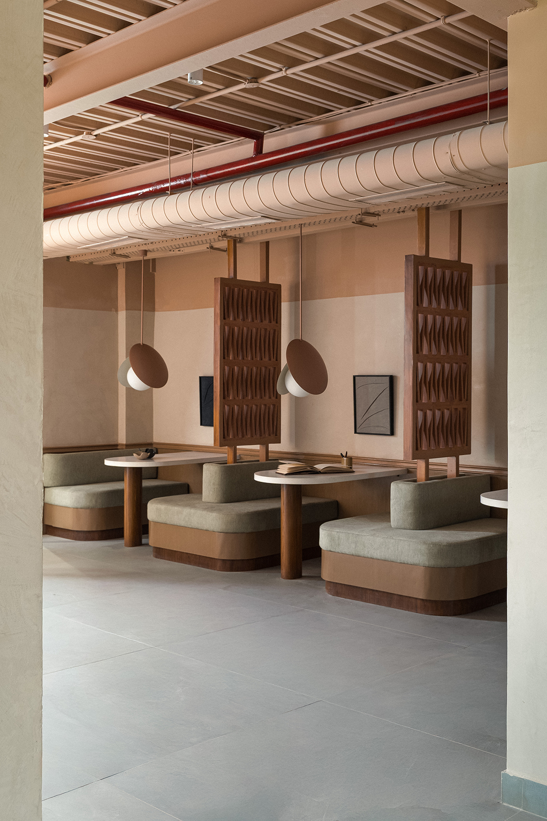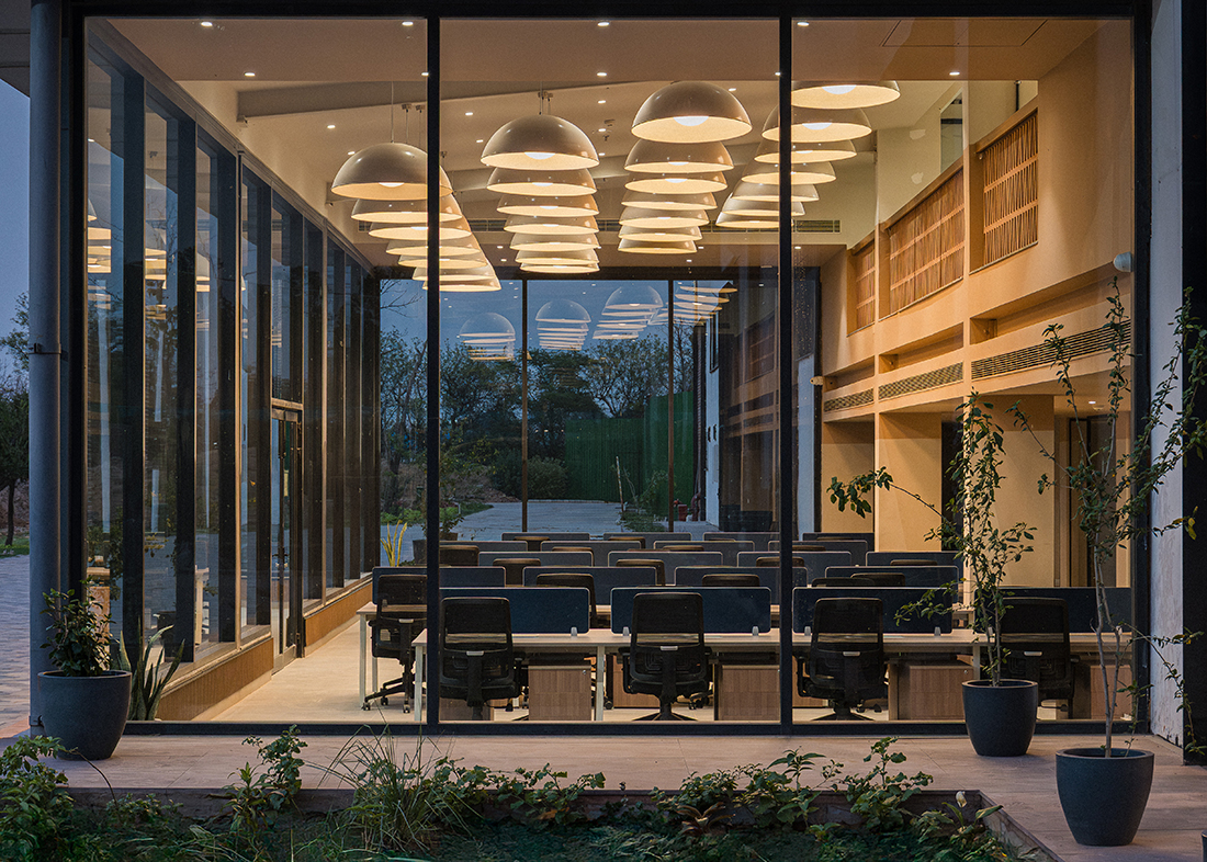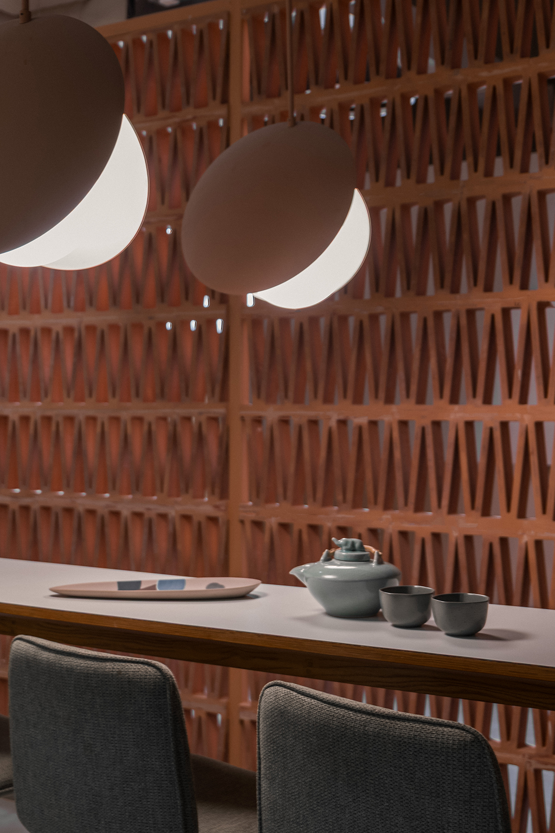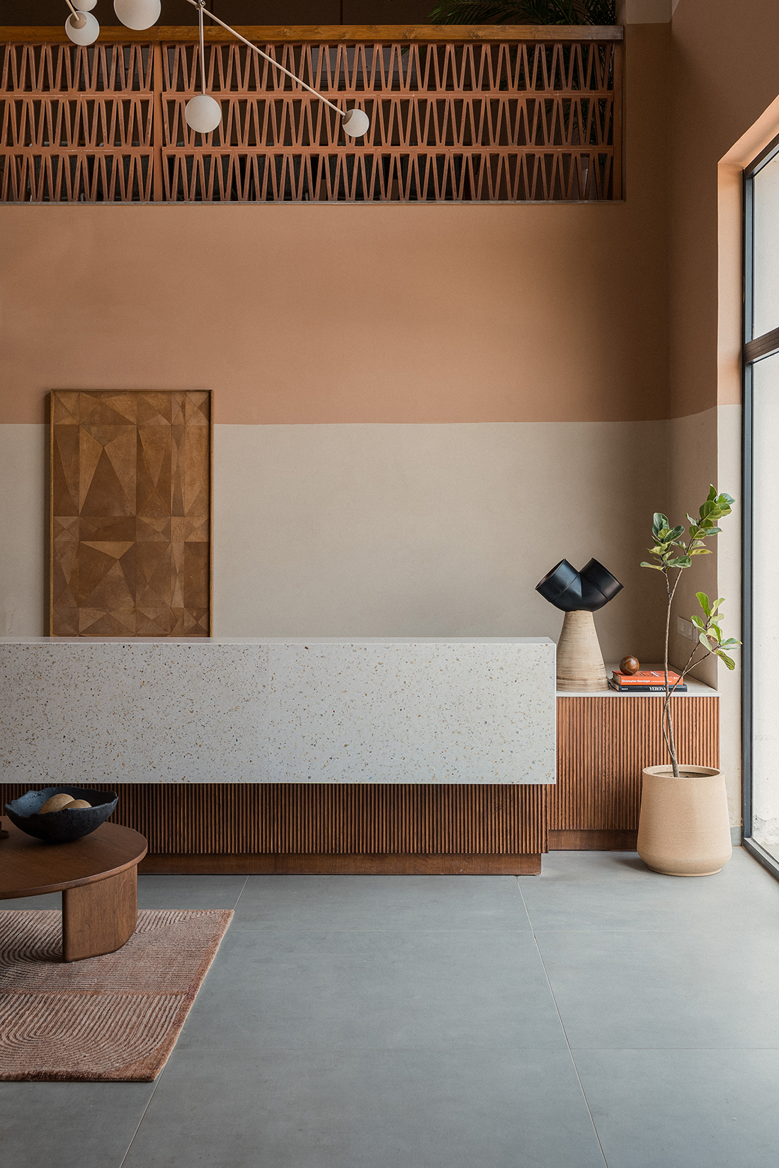 W shaped terracotta modules recur as porous screens, dividing without disconnecting. Used as railings, backdrops, and thresholds, they filter light and air, creating a cohesive architectural language that allows the workplace to breathe.