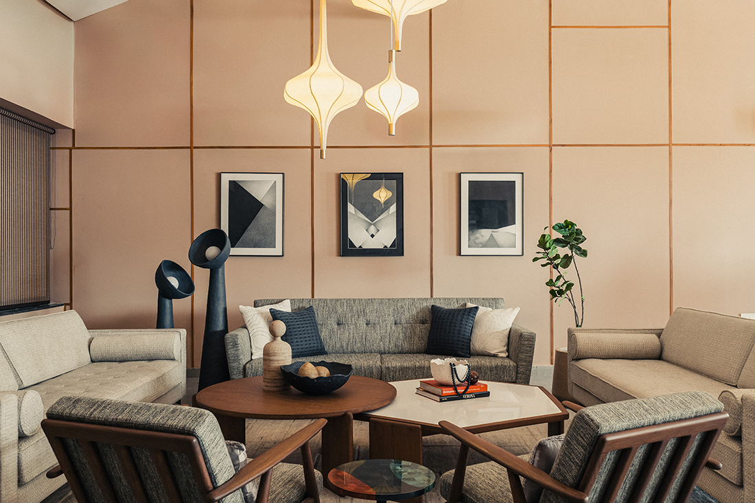 Natural light is drawn deep into the plan, reducing dependence on artificial lighting, while custom fixtures add precision where needed. Breakout zones sit at the margins, with booth lined alcoves for informal conversations below and a mezzanine lounge above. Furnished with solid timber, rugged textiles, and artwork by emerging Indian makers, the lounge is durable yet warm, designed for client and investor meetings.