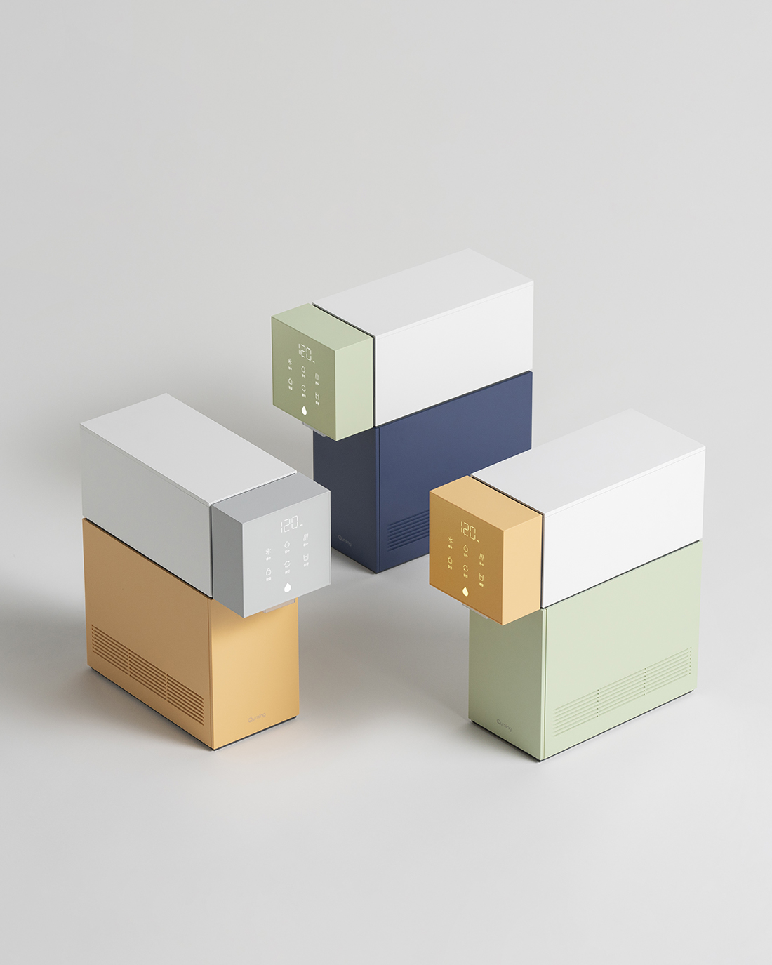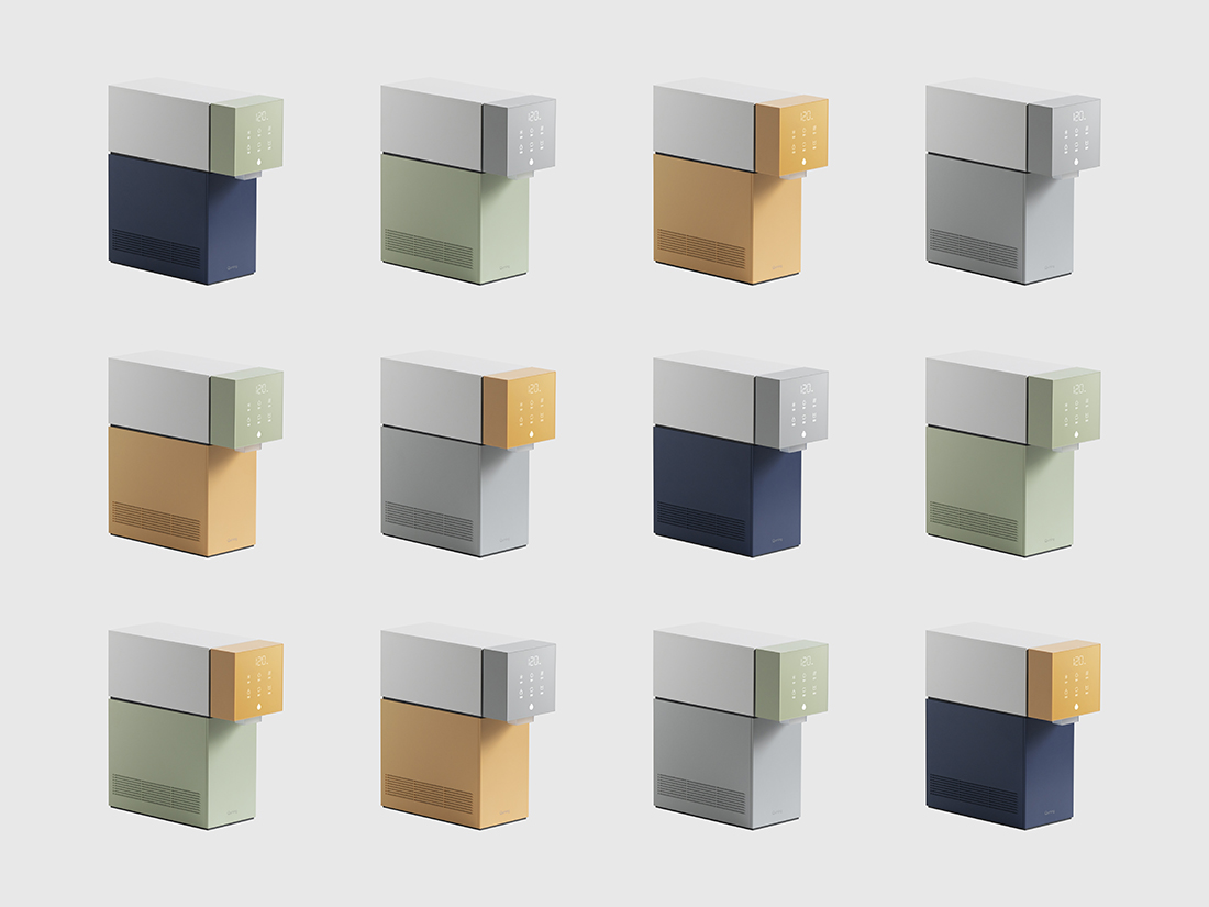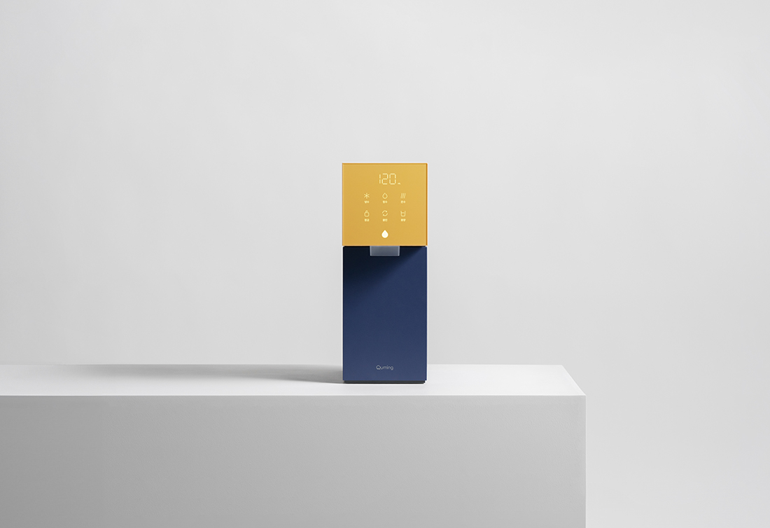 Delight is a water purifier designed for Hyundai Rental Care’s home appliance brand, Quming. The design is a celebration of customization through the use of diverse color combinations. Its minimal form is made of purely geometric shapes, with precise lines that divide the product into three distinct sections, playing on the sense of graphic composition and proportion.