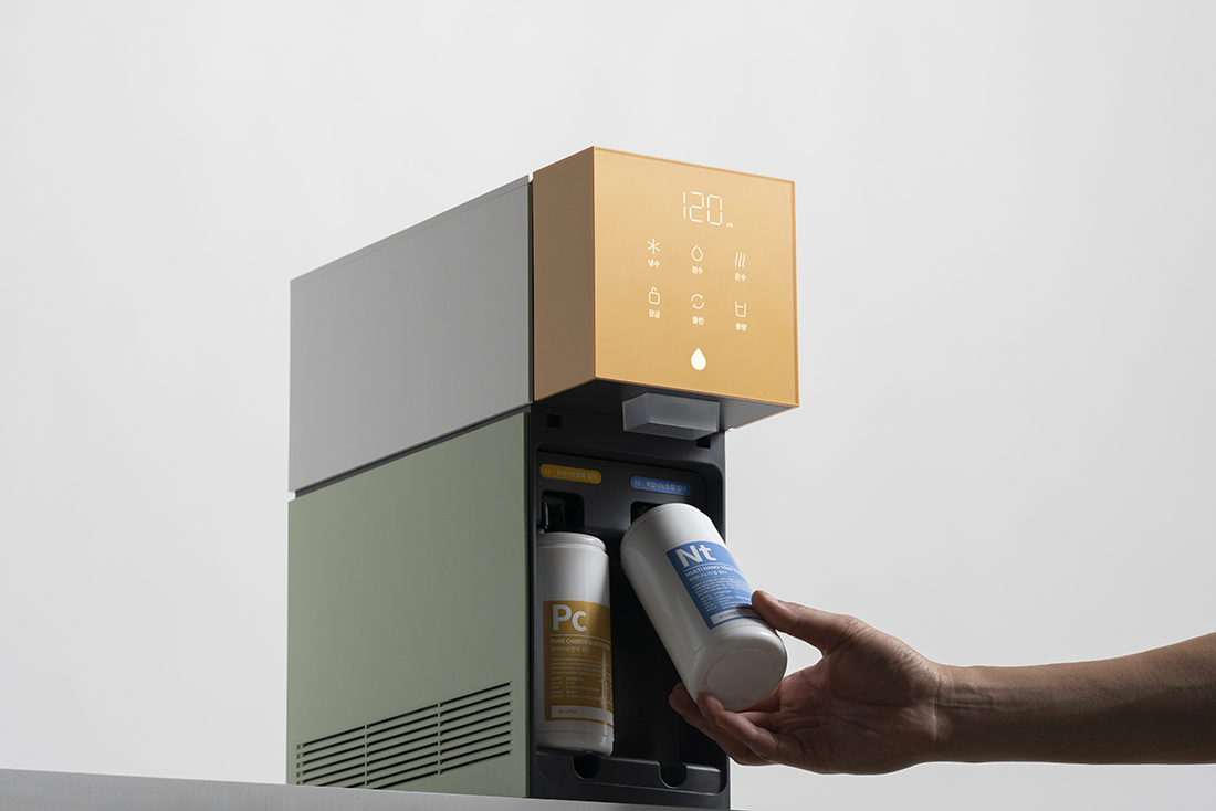 Breaking away from the common water purifier designs that only emphasize what you see from the front, this three-dimensional approach enables color customization from all angles, easily adapting to different kitchen styles and layouts. The control panel features a hidden lighting interface under a translucent, color finish, creating an elegant and clean look. The faucet’s twist locking mechanism allows convenient cleaning, while the magnetic filter cover and lever type filter attachment mechanism enables easy self-maintenance.