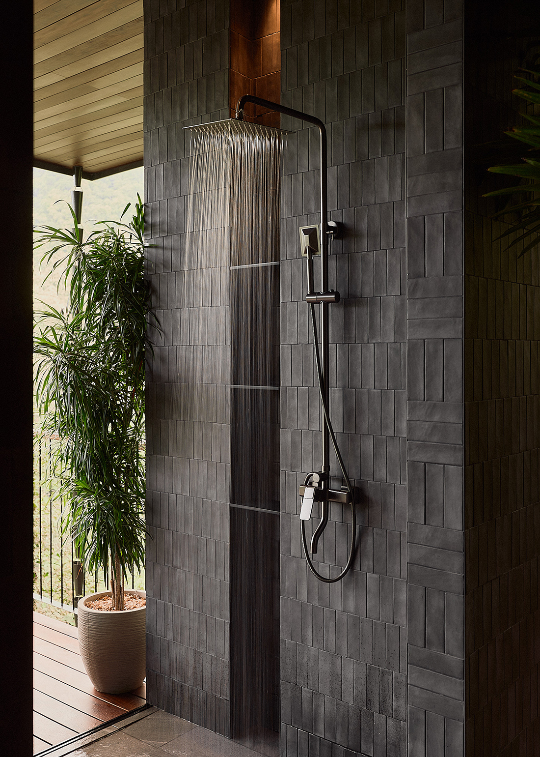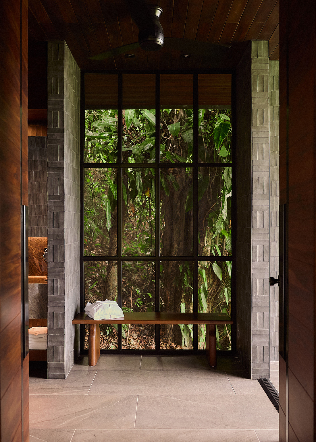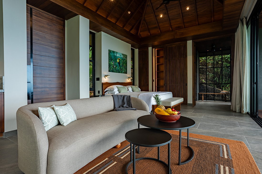 Floor to ceiling pivoting doors open completely to private terraces, dissolving the boundary between interior and nature. Compact layouts flow toward expansive ocean views, while open air bathrooms strengthen the sensory connection to the jungle’s sounds, light, and breeze. Set lightly on slender steel columns, the buildings minimize ground disturbance and allow air to circulate beneath the structures, creating natural, passive cooling suited to the tropical climate. The result is a quiet architecture that elevates living among the trees while respecting the surrounding landscape.