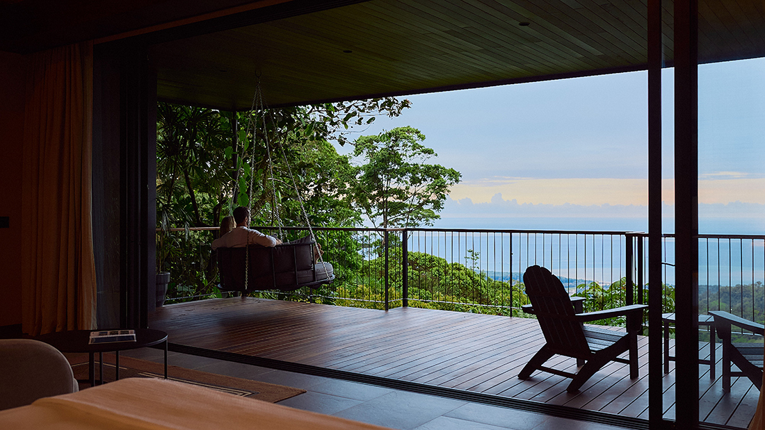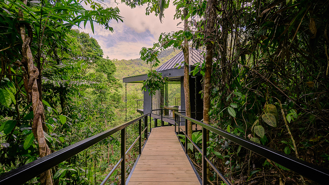 Suspended among the treetops of Uvita’s lush hillside, Rancho Pacífico Treehouses is a collection of four elevated jungle retreats, designed to immerse guests in the surrounding rainforest. Each structure rises 4 to 6 meters above the ground and is carefully positioned to preserve the existing trees and natural terrain. Rather than dominate the landscape, the architecture recedes into it through a restrained palette of dark timber, weathered finishes, and natural stone that blends with the forest canopy.
