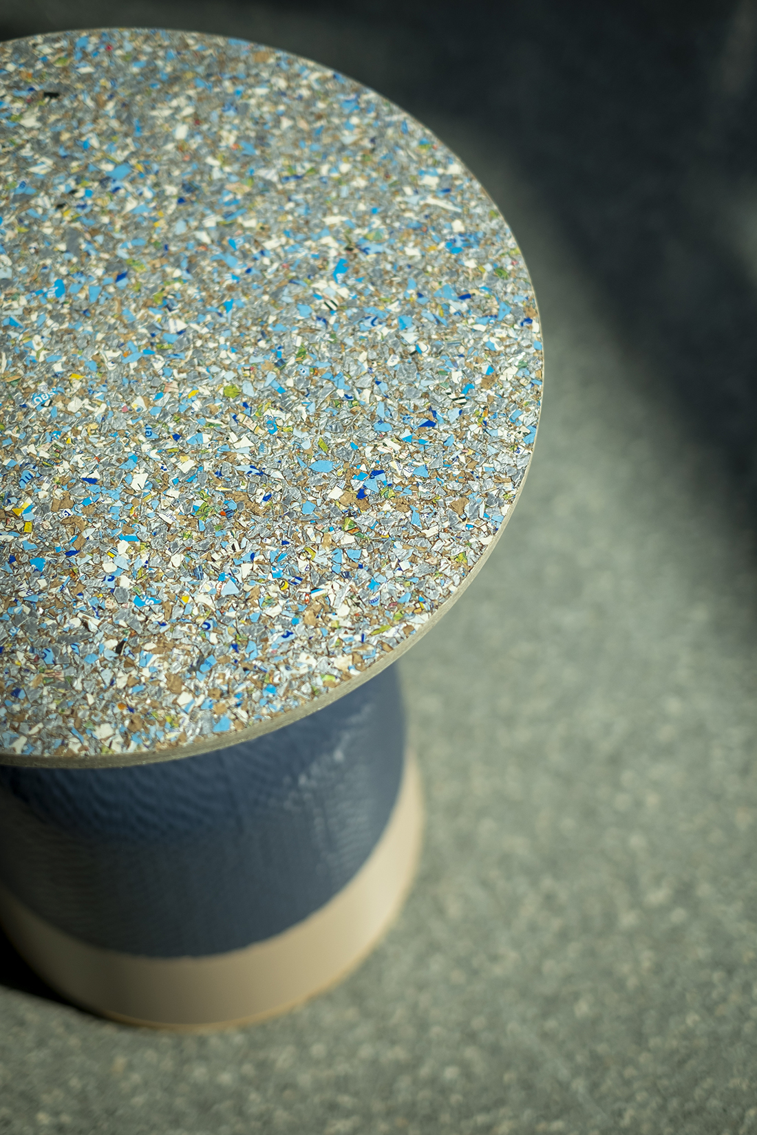 Driven by a philosophy of long-lasting, sustainable making, the experiment soon evolved to embrace post-consumer polypropylene (PP) – the ubiquitous plastic from food delivery. Reprocessed through an industrial shredding and compression technique, this waste is reborn as a dense, tactile cylinder: raw in character, precise in form, and radical in its refusal to disguise its origins. To deepen the narrative, select pieces incorporate coffee ground waste, resulting in a warm mocha hue with organic, scattered flecks.