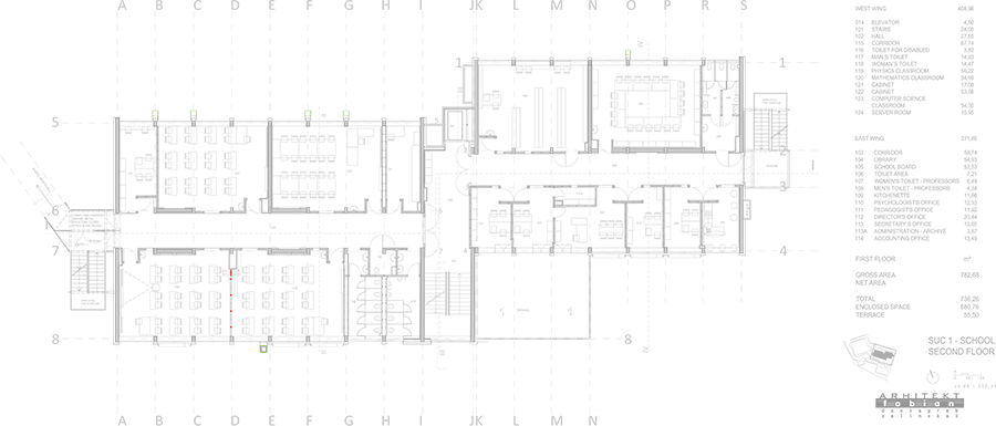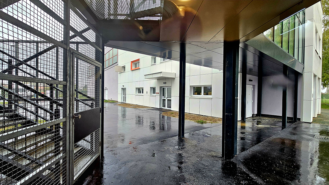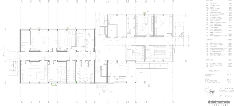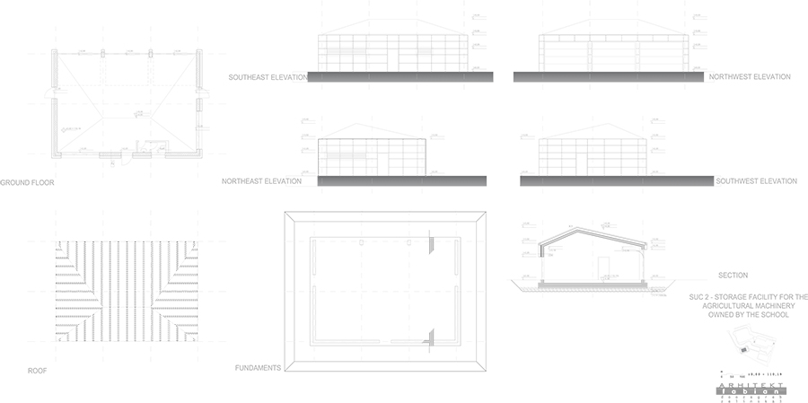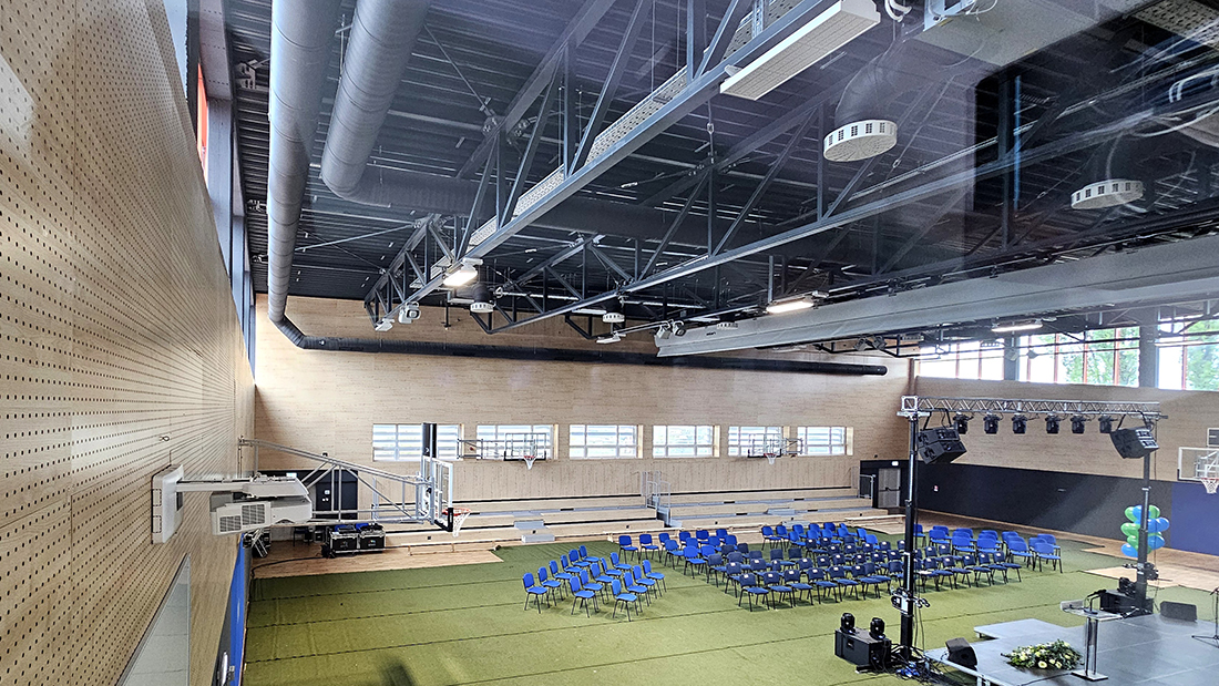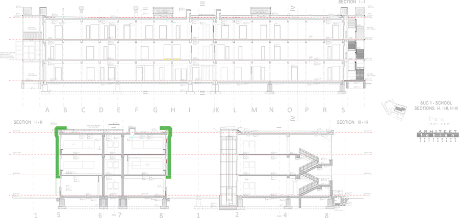 The project included the reconstruction of the existing school building, along with the addition of essential facilities such as a two-part school sports hall and a storage facility for agricultural machinery owned by the school. The reconstructed school building is located adjacent to the industrial facilities of the meat industry. Due to the limitations of the weak existing reinforced concrete structure, it was not possible to drill through it for ventilation ducts. Instead, the ducts were constructed visibly on the facades, similar to those used in the neighboring factory’s production facilities.