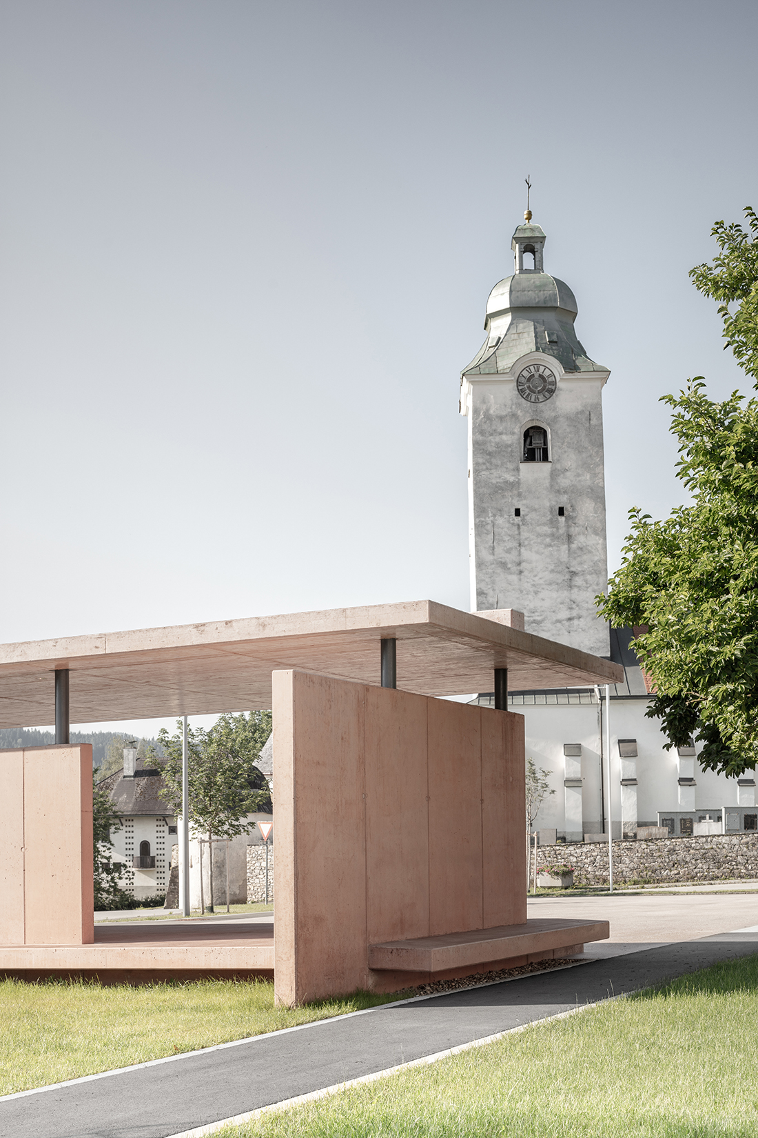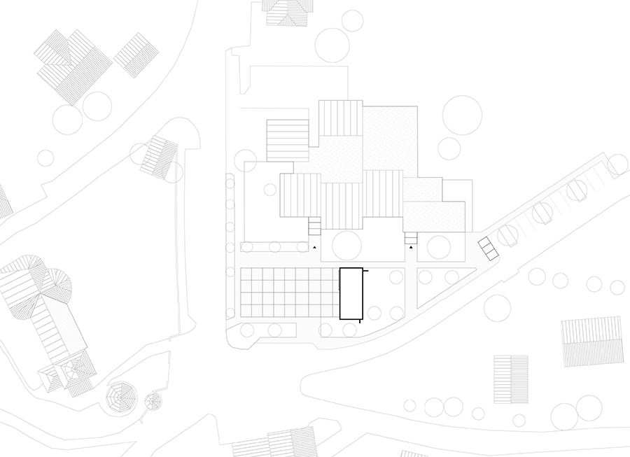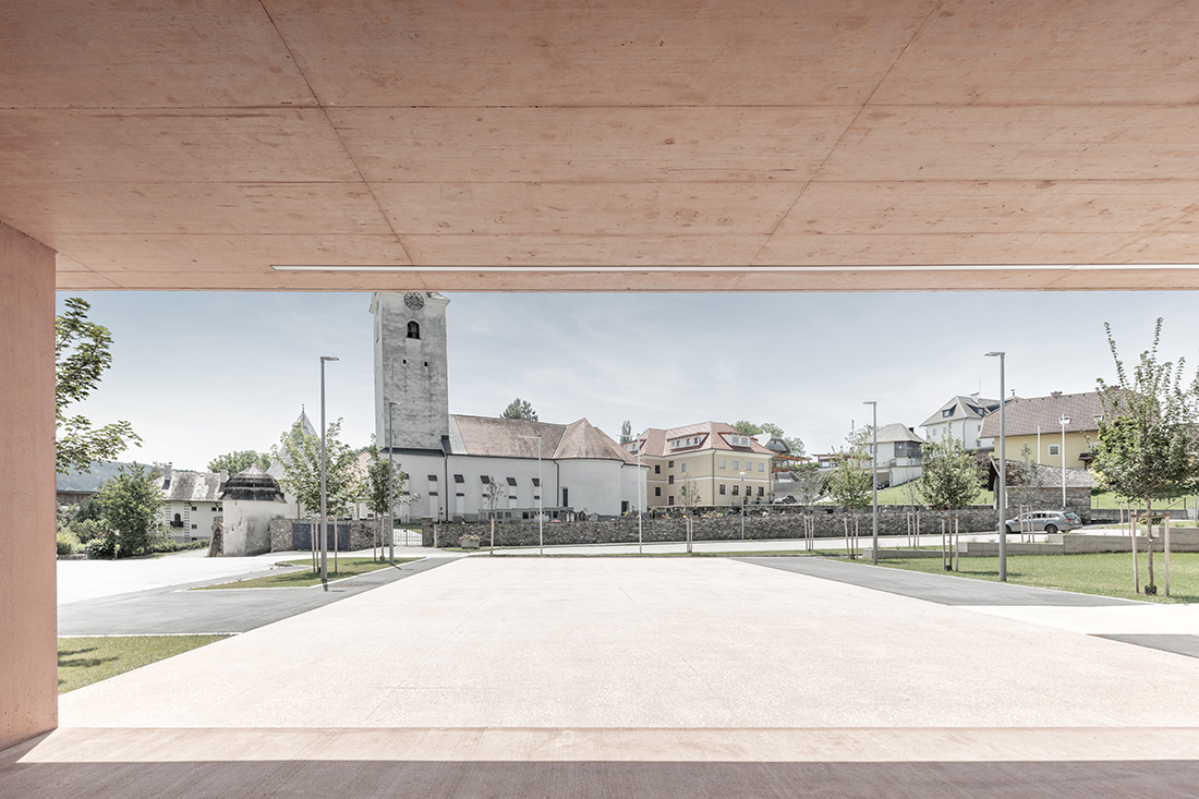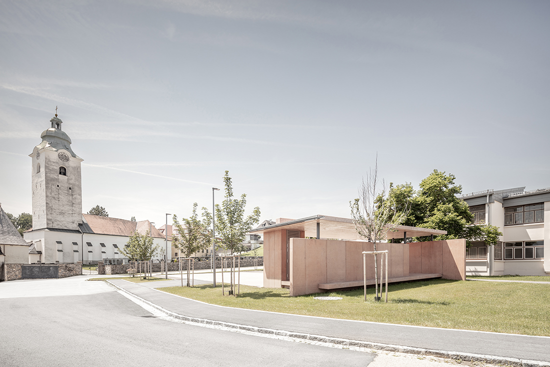 Before the renovation, the center of Kappel lacked cohesion, with fragmented open spaces between the church, elementary school, and fire department. The new 12 × 25 m town square creates a unified, spacious area that connects these key buildings. A pavilion-like structure on the northeastern edge provides a spatial closure while serving as a multifunctional shelter, waiting area, and stage. The square is framed by local deciduous trees, offering a permeable boundary and seasonal color accents through their foliage and blossoms.