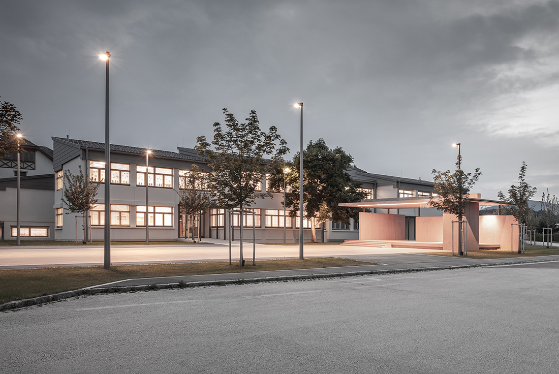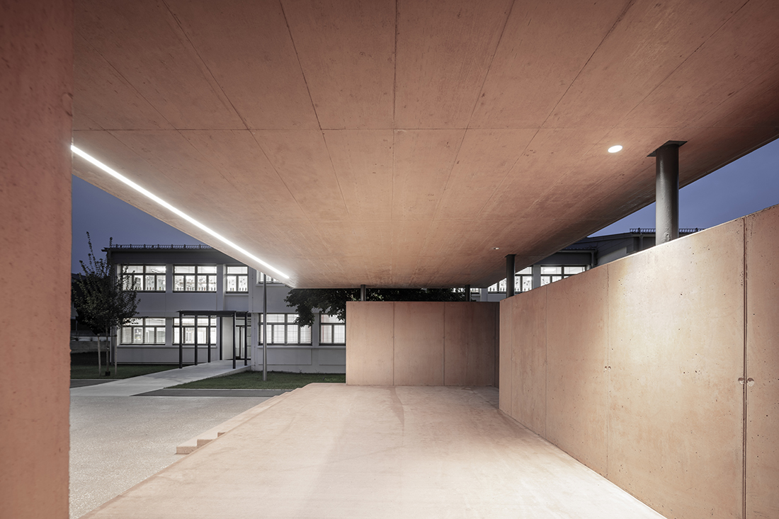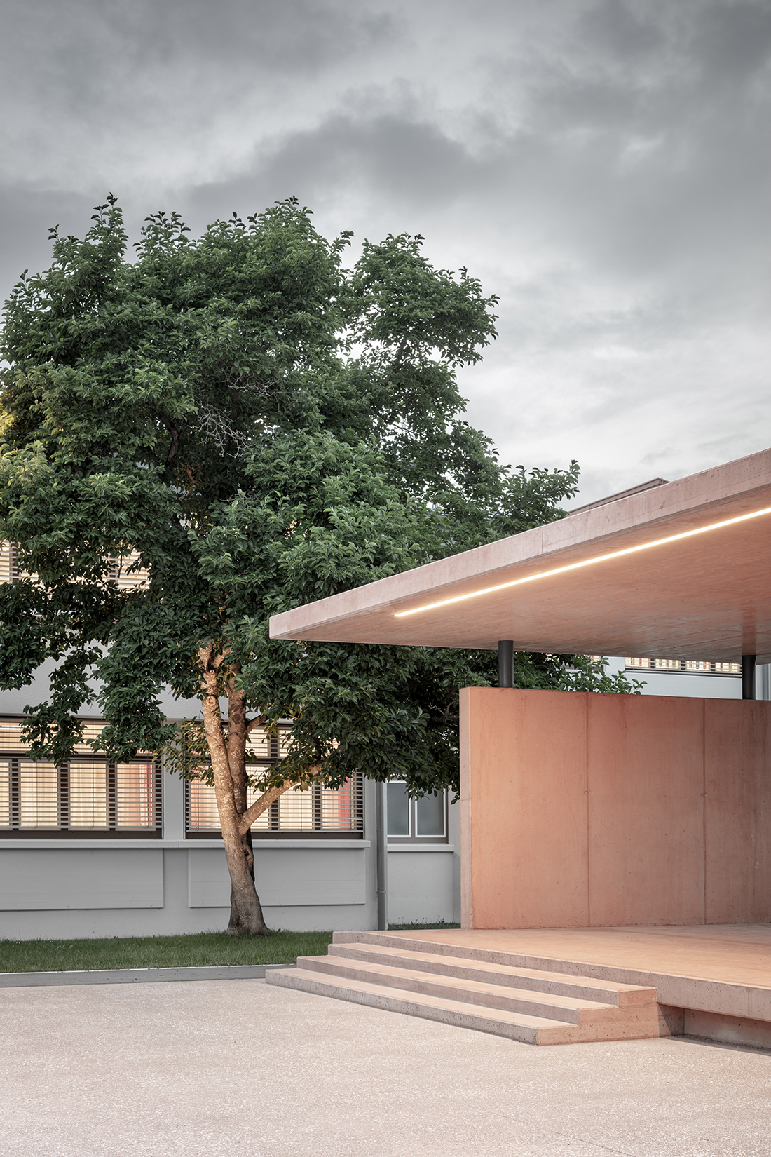 Before the renovation, the center of Kappel lacked cohesion, with fragmented open spaces between the church, elementary school, and fire department. The new 12 × 25 m town square creates a unified, spacious area that connects these key buildings. A pavilion-like structure on the northeastern edge provides a spatial closure while serving as a multifunctional shelter, waiting area, and stage. The square is framed by local deciduous trees, offering a permeable boundary and seasonal color accents through their foliage and blossoms.