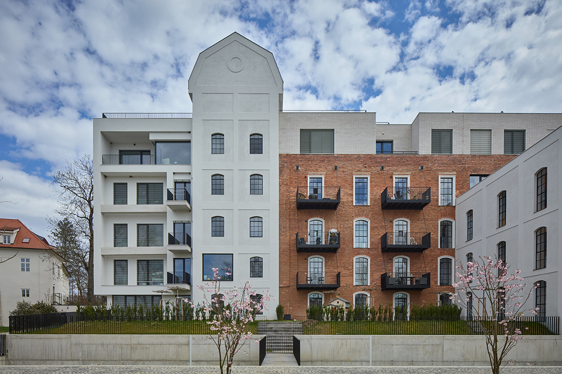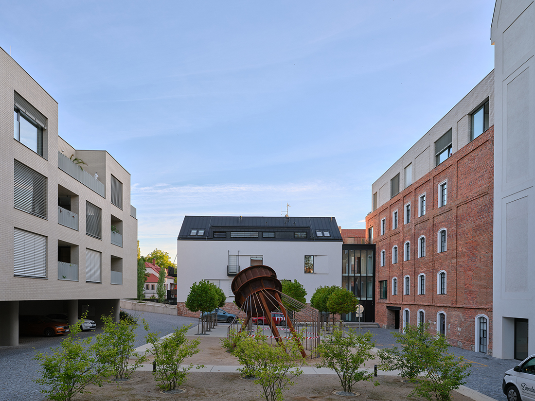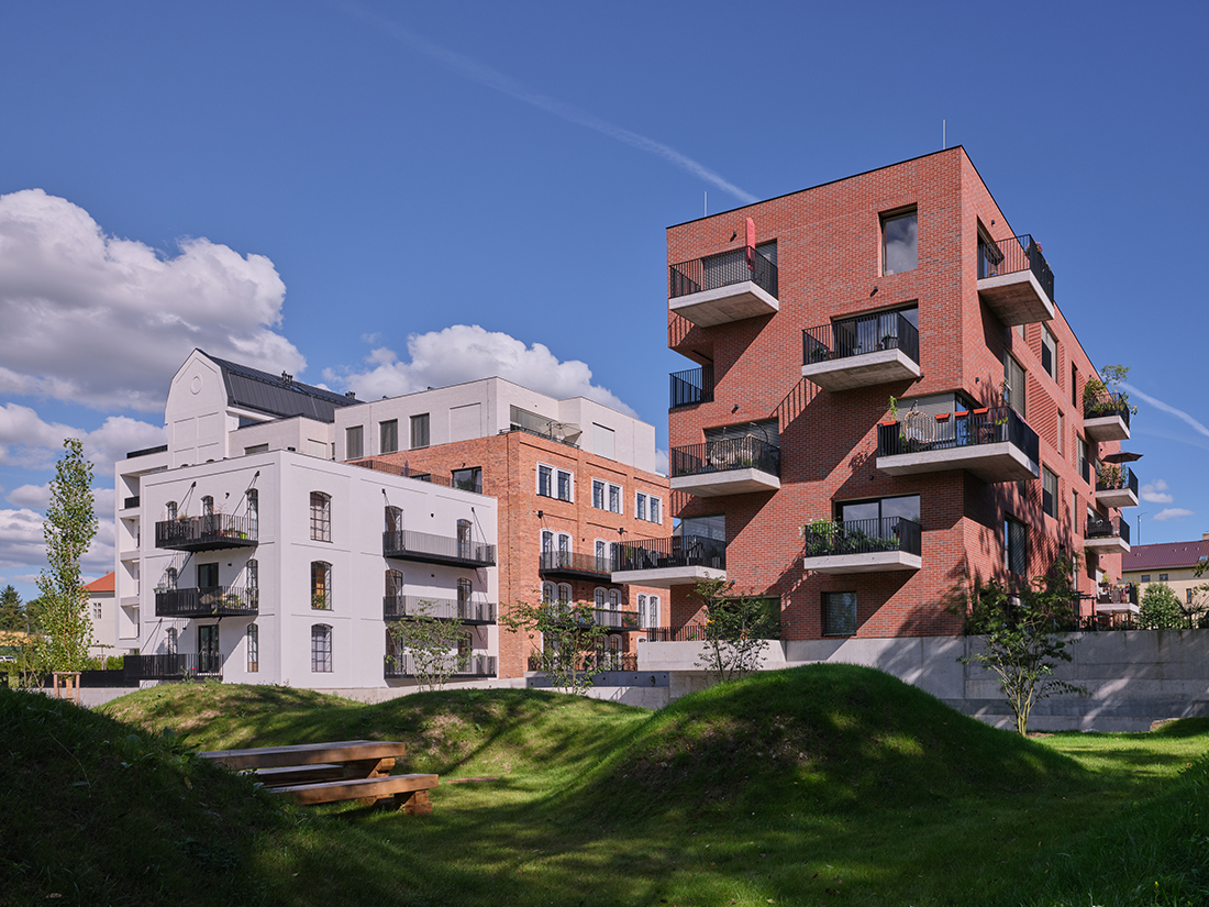 The former Žitný Mill complex in Boršov nad Vltavou has been transformed from a historic industrial site into a modern residential quarter. The project connects the 19th century with the 21st, preserving the brick silo, administrative building, and Baroque manor, complemented by two new buildings. It now houses 83 apartments of various sizes, a café, and a new square featuring the original Francis turbine as a historical centerpiece.