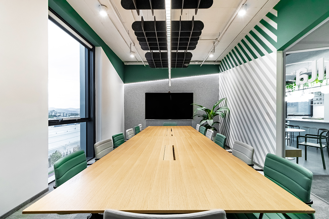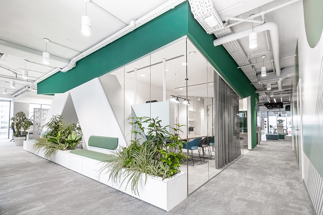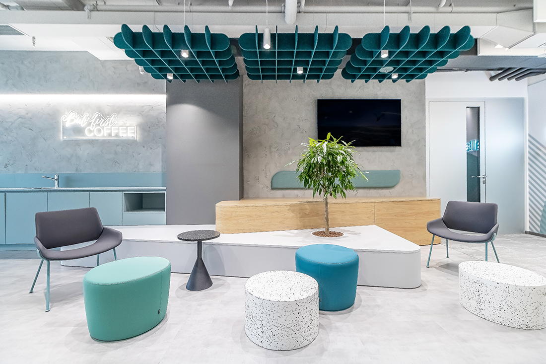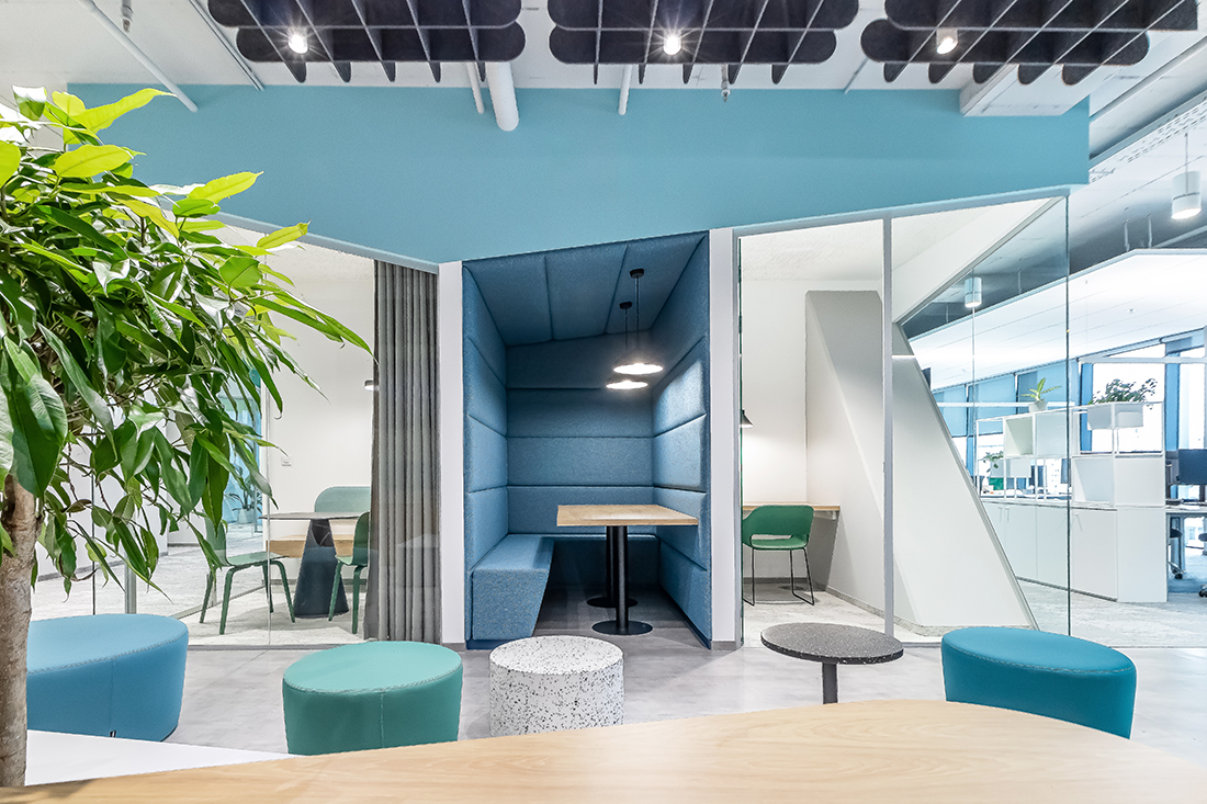 Situated in Ljubljana’s Crystal Palace, the 610 m² office features a flexible open layout, complemented by strategically placed closed support areas to improve cooperation and communication. Key spaces include a central lounge, a cafeteria, meeting rooms, quiet rooms, work booths, and an aquarium.