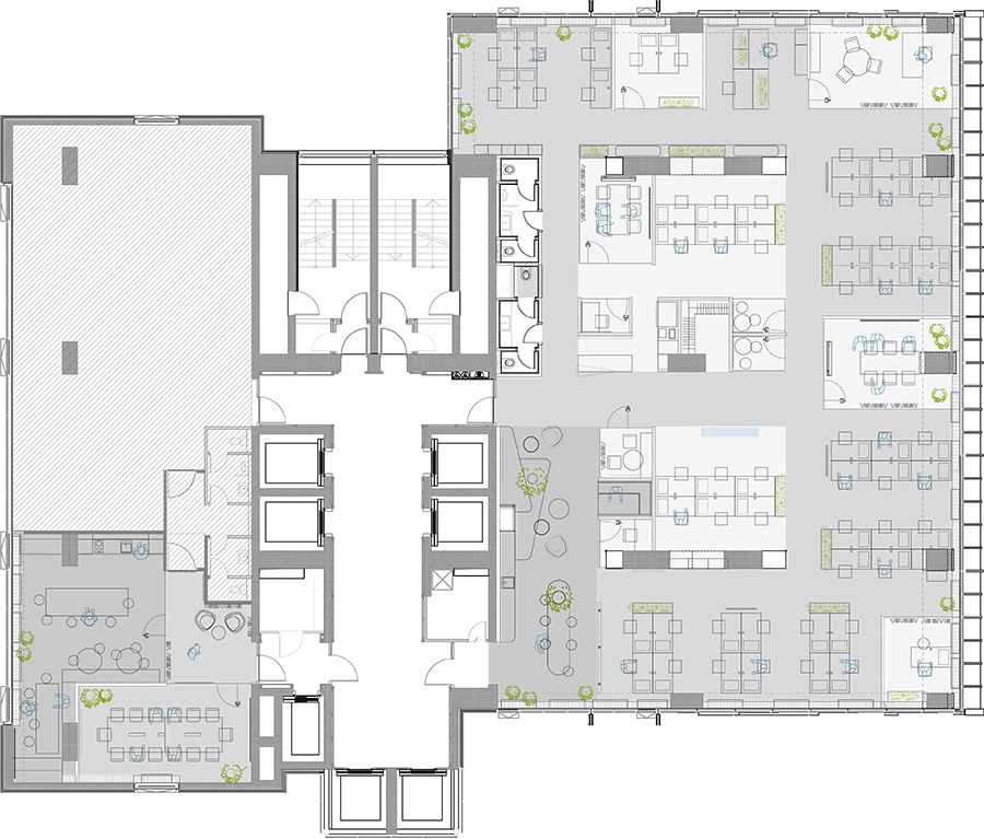 Permanent workstations are positioned to maximize natural light exposure, with a social area and video conferencing room located nearby. Despite the open-plan design, excellent acoustics have been achieved using acoustic flooring and ceiling elements, ensuring a comfortable work environment.