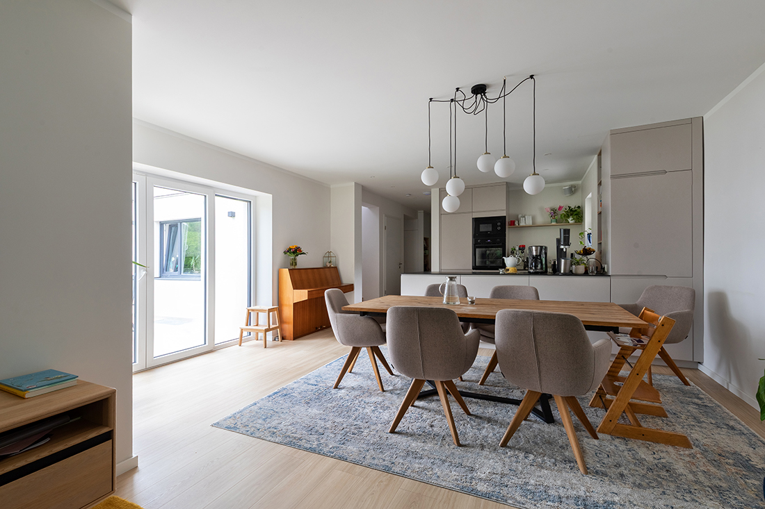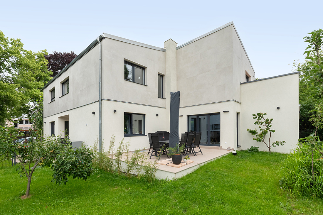 The result is the creation of two spacious duplex apartments. A clean design language and a subtle color palette create a calm and contemporary overall look. An ecological, yet economical, construction method was combined with high design quality. Renovation and Addition: The ground floor of the existing building was renovated and completely rebuilt. The addition was constructed on top of the brickwork on the ground floor, using prefabricated wood-sandwich panels, which significantly reduced construction time.