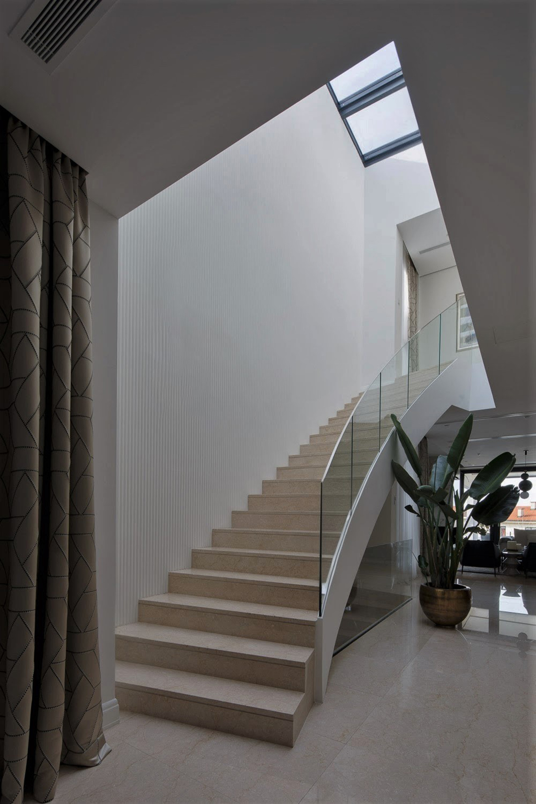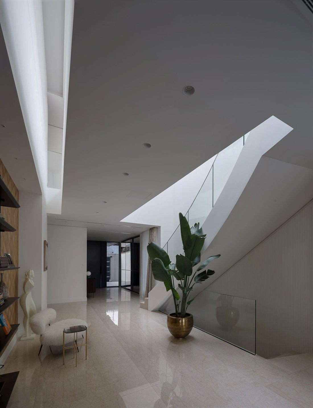 On the access level, the living area includes a separate space for work and guest accommodation, facing the street, as well as a terrace oriented towards the inner courtyard. The family accommodations are located on the first floor. The roof area is also activated, featuring a terrace with an outdoor jacuzzi, a coffee kitchen, and a toilet, along with a bio-pergola covering part of the space.