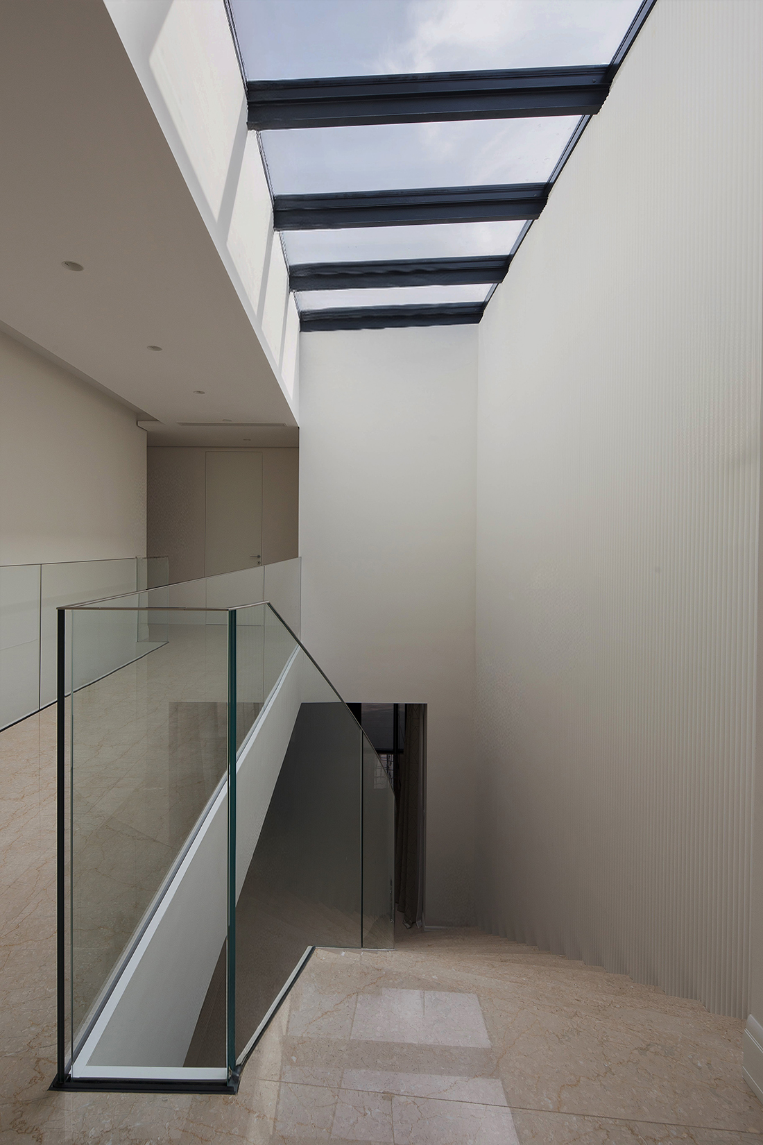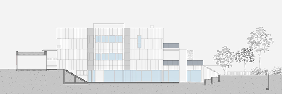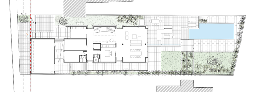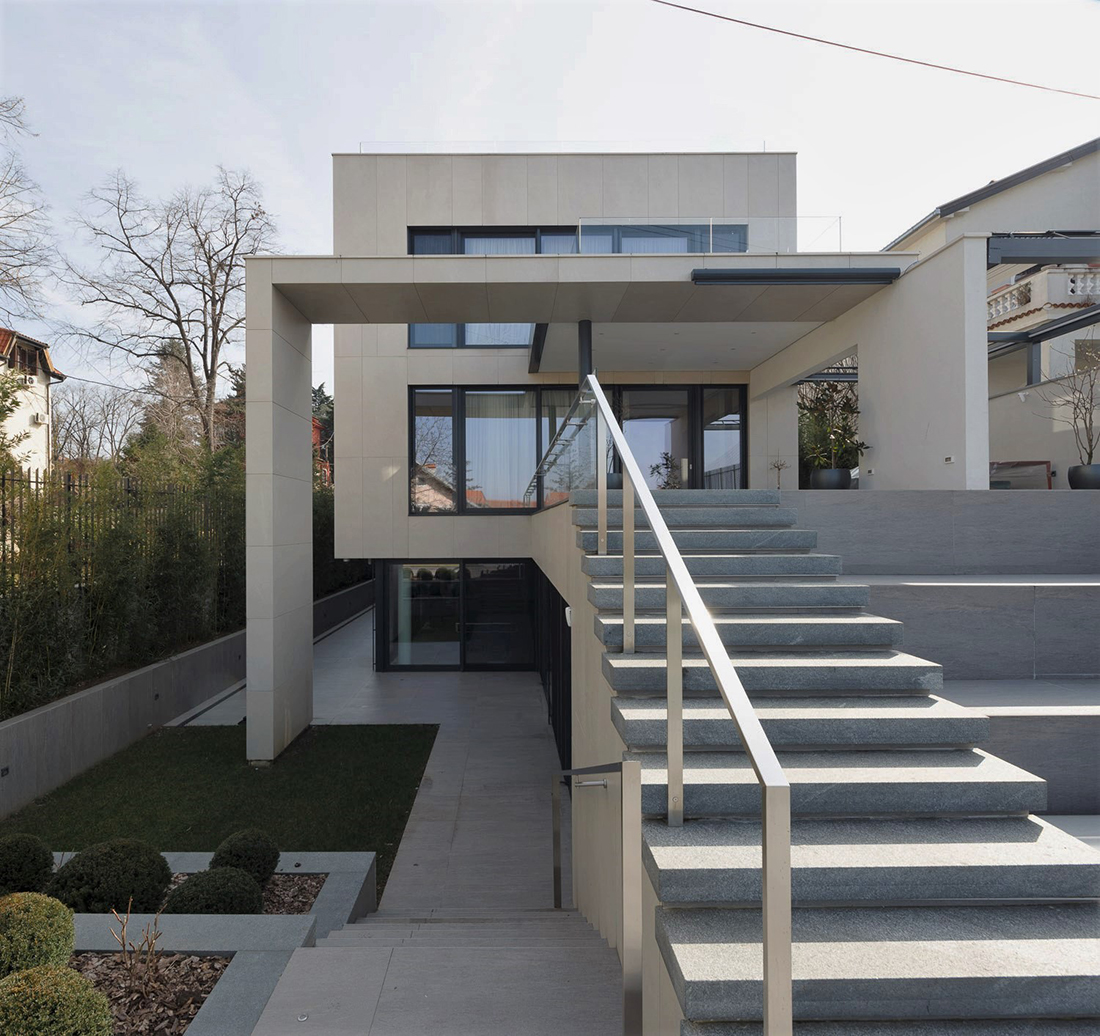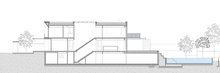 The building is situated in the residential area of Senjak, on a long plot with sloping terrain from the access road. This, along with urban regulations, influenced the layout of the building and its associated spaces – such as the swimming pool and inner courtyard – which are not level with the street or access level.
