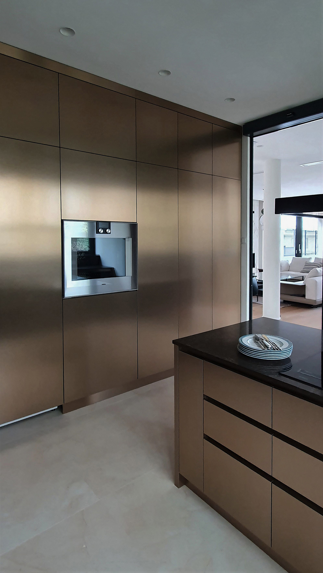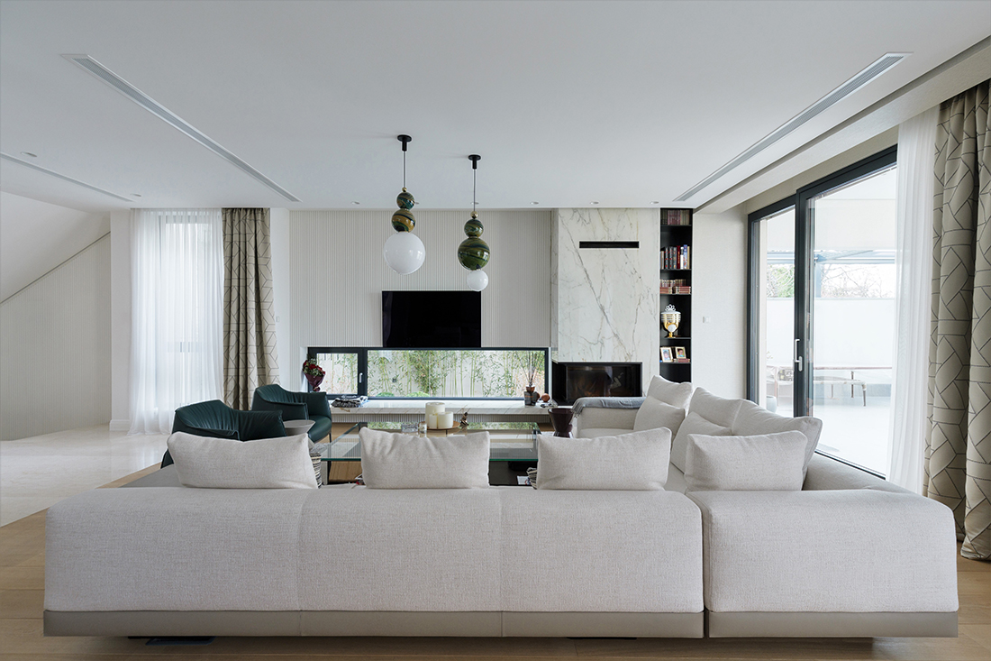 All levels of the building are connected by an attractive freestanding stairwell, illuminated by a lantern, and an elevator. The basement, thanks to the leveled courtyard, is open to the outdoor environment across its entire height. It includes recreational spaces – a gym, golf simulator, and a home cinema with additional facilities.