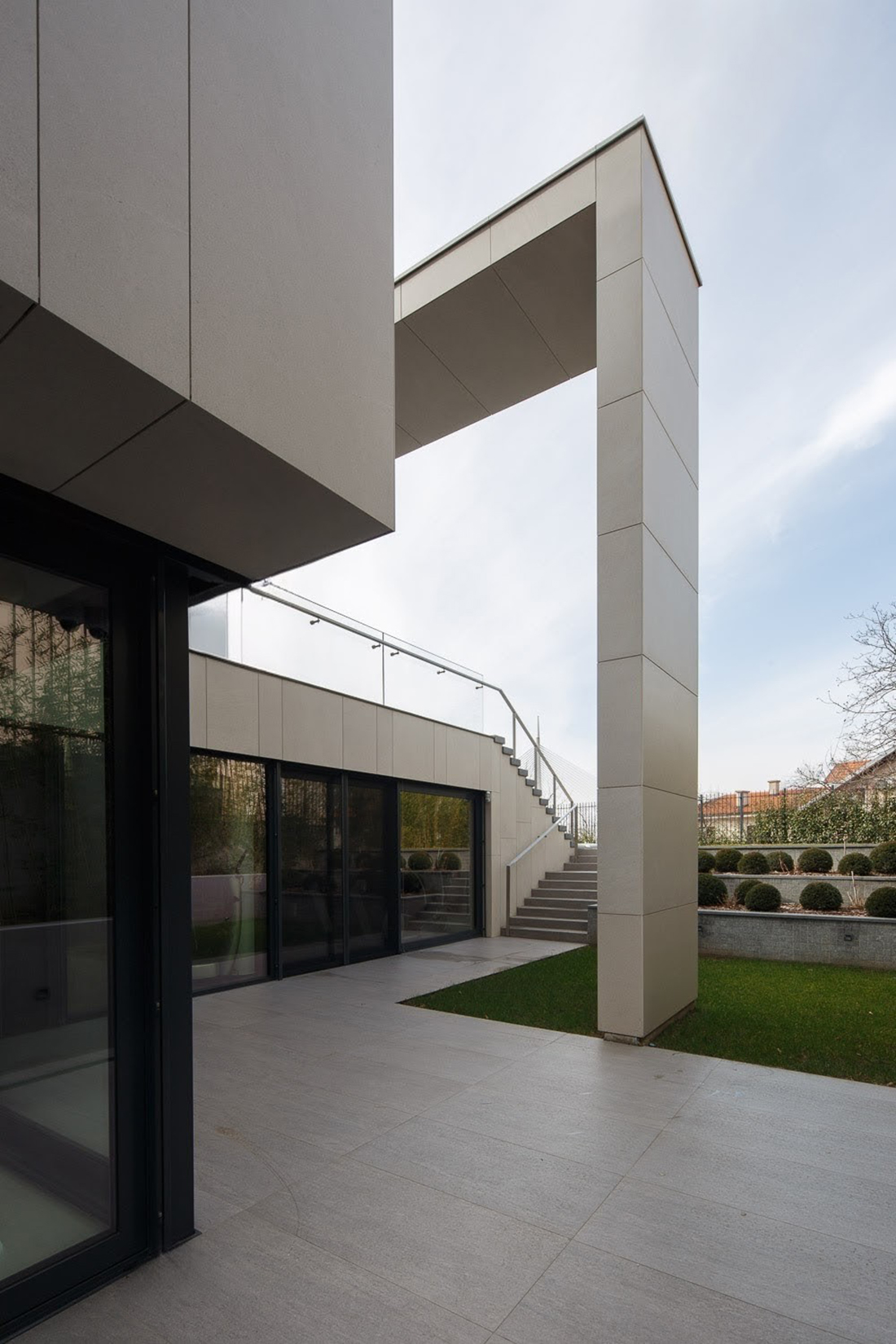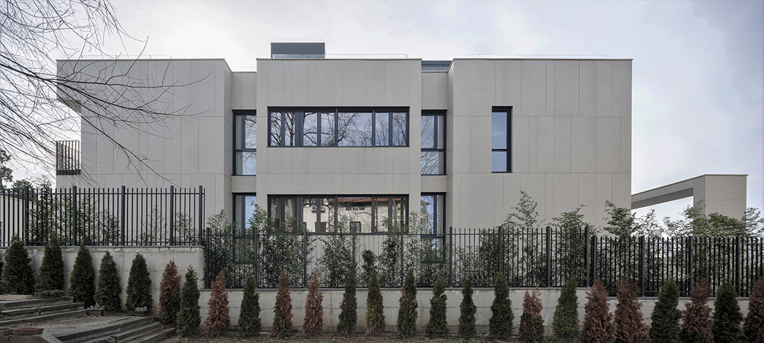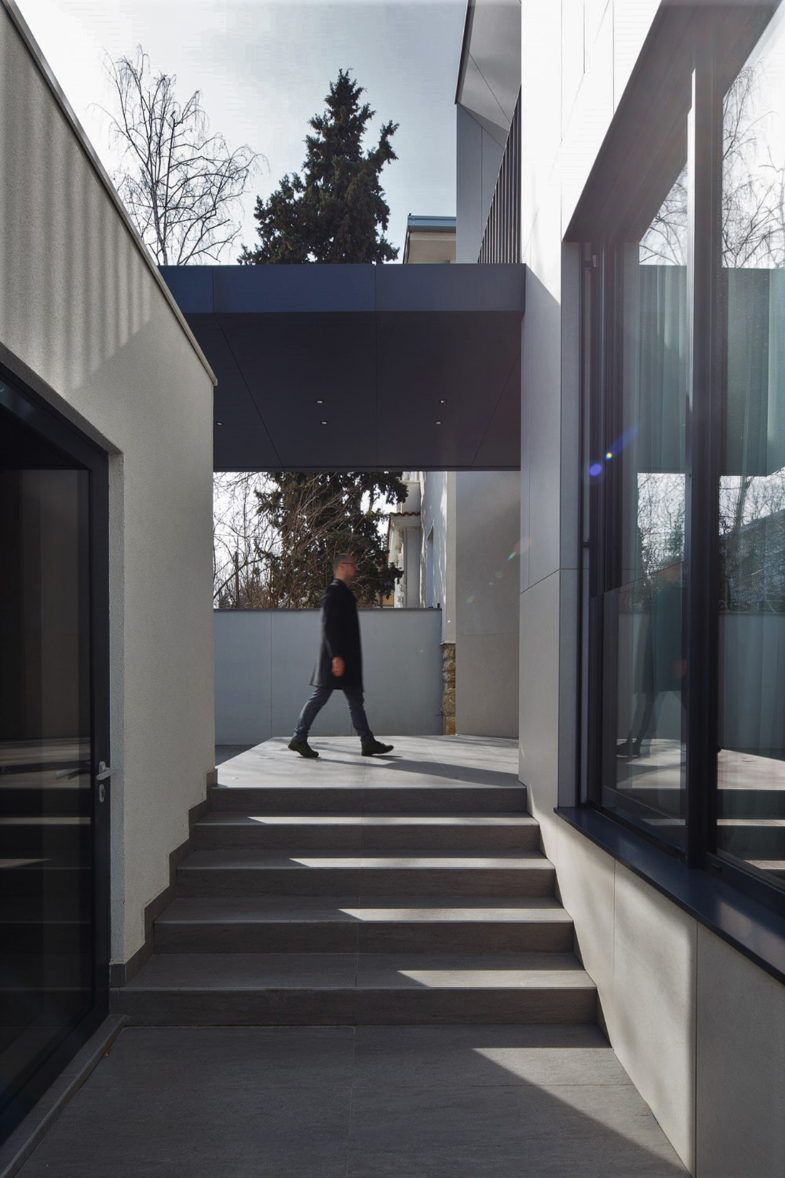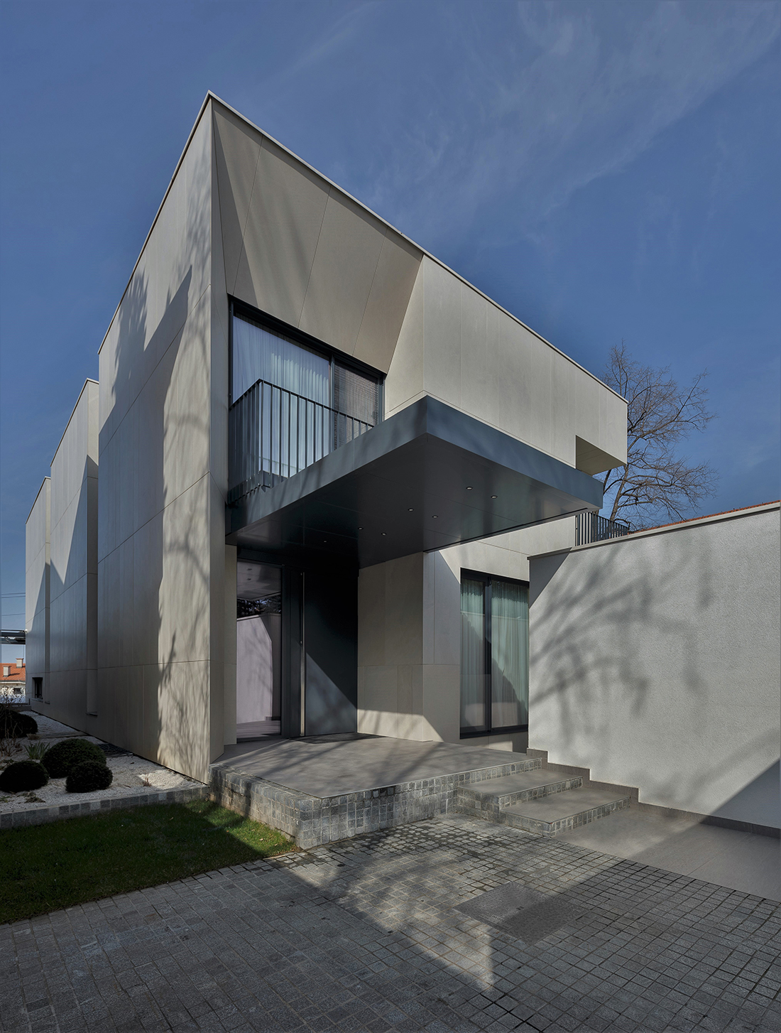 The structure is composed of three interconnected cubes, forming a three-story monolithic design with breaks in the form of glazed niches that run the full height of the building. The refined modernist design is emphasized by uniform materials – Eternit panels – and the arrangement of large facade openings at both the entrance and courtyard.