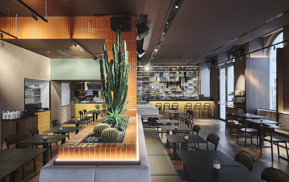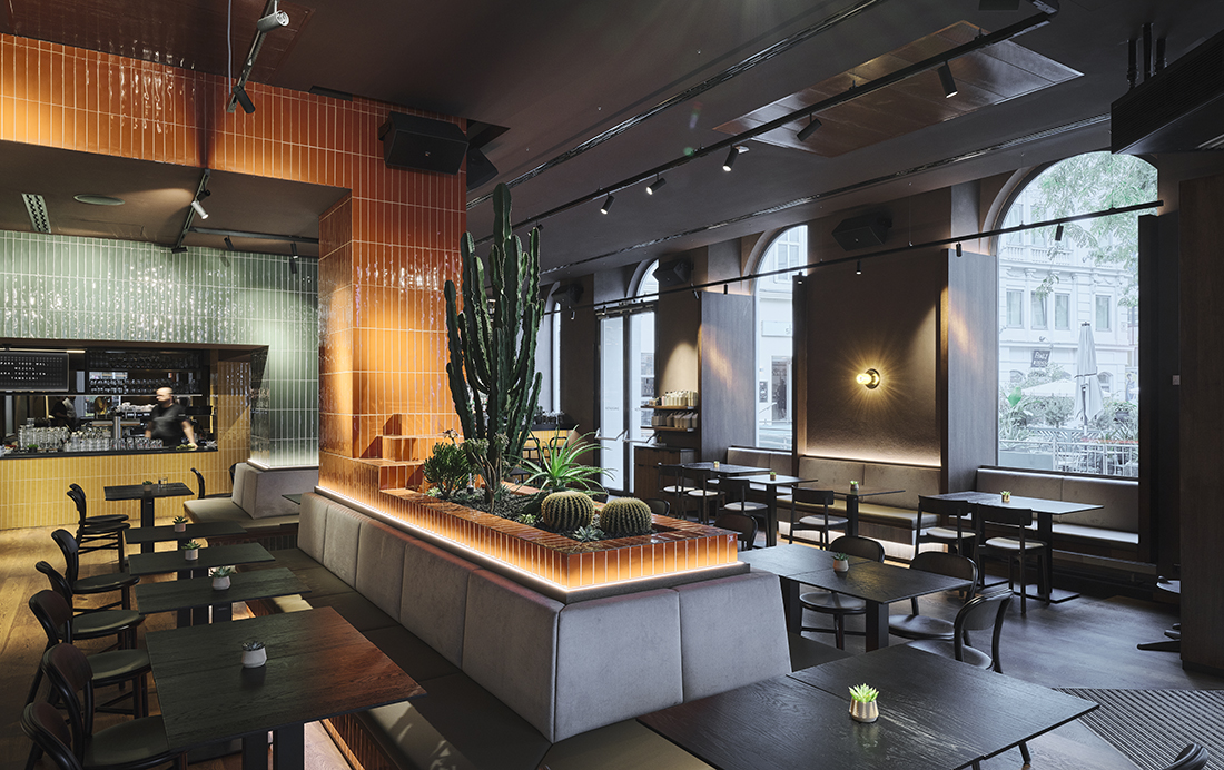 Dedicated to Mexican authenticity, the design language of Luis Barragán Morfín is mandatory: Inspired by the Mexican architect, two massive masonry pillars, underneath which the restaurant’s floor space extends, are transformed into columnar sculptures with Aztec grace through a distinctive texture and tile pattern. Refined and well-proportioned details, as well as the transition of the columnar character into a central banquette element, are reminiscent of genuine Mexican identity. The resulting central sculpture is richly planted with vibrant desert vegetation. The walls are covered with natural, earthy clay plaster – in various shades of fineness and color.