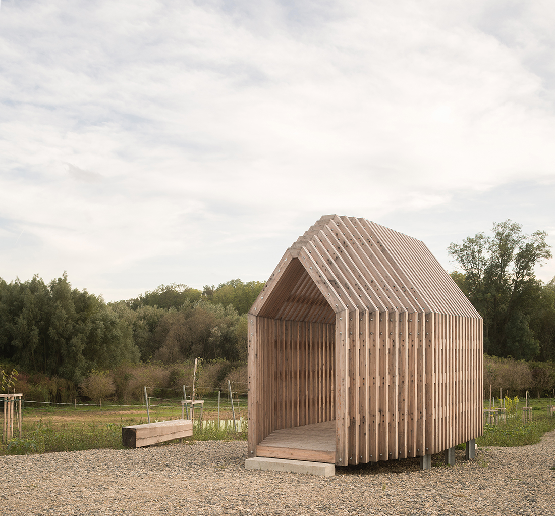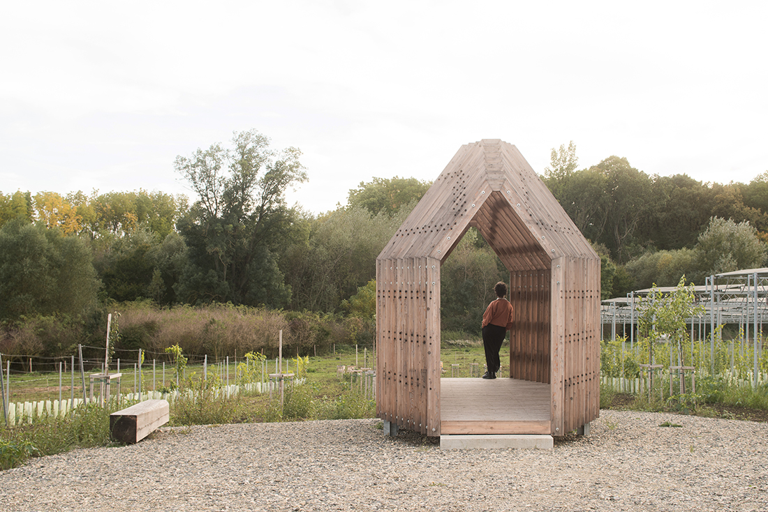 We find here new uses of the area by small architectural interventions and the planting of greenery in the landscape, which co-shape and enliven the local landscape character. In collaboration with garden architects, we created an area with field trees that will become a pleasant refuge for both insects and cyclists who are using the adjacent trail. Here, bees will find hives and plants to pollinate, and the passerby a resting place – a chapel for a quiet prayer. The area is used for research into the future of solar energy and landscape that is not limited just to monoculture farming. Solar panels do not prevent the use of fertile ground, and because we are in South Moravia, the researchers from Mendel University planted a vineyard under them.
