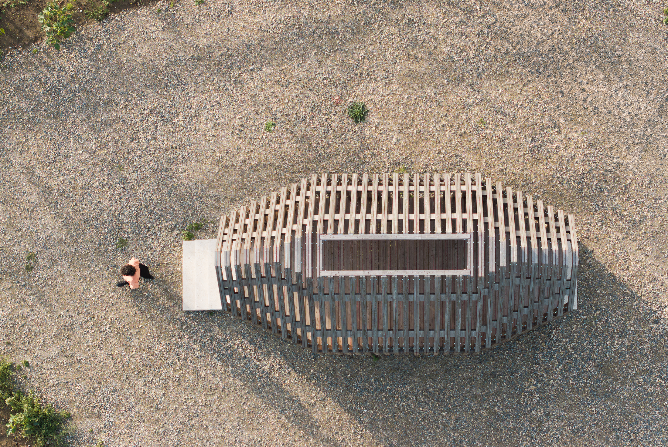 The Resting chapel between vineyards and agrovoltaics for the South Moravian company MND a.s. Our building is part of the reclamation of an industrial site where oil and gas were previously mined. By planting vineyards and photovoltaic panels above them, the original land near the village of Starý Poddvorov is restored.