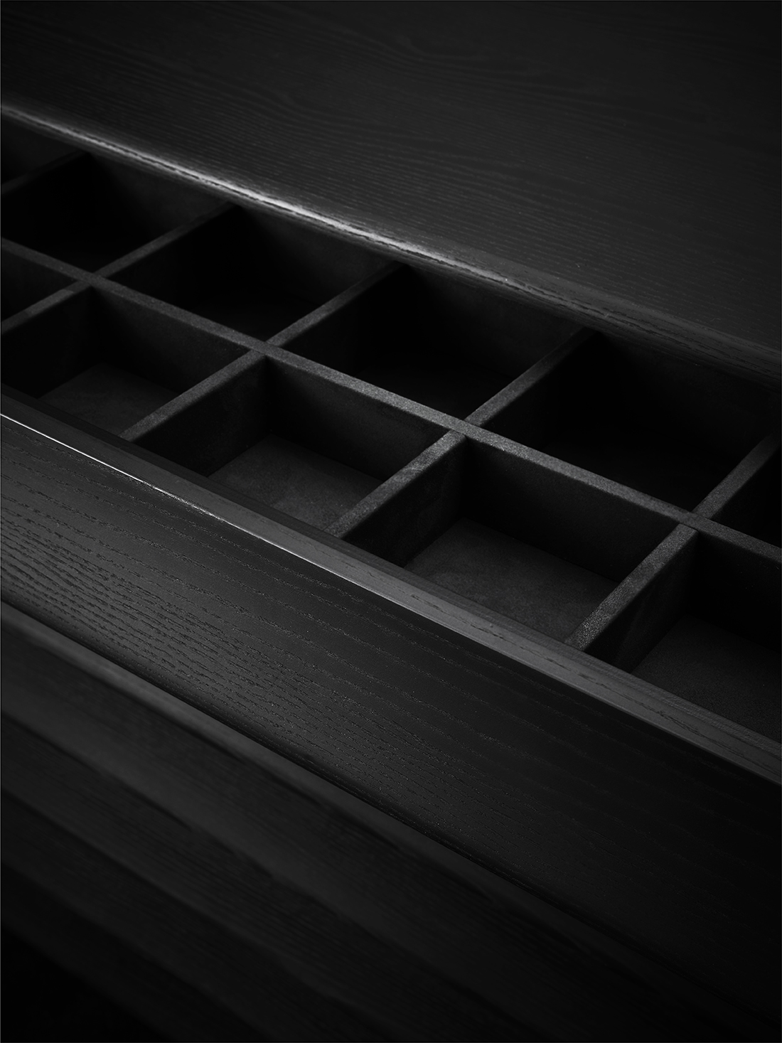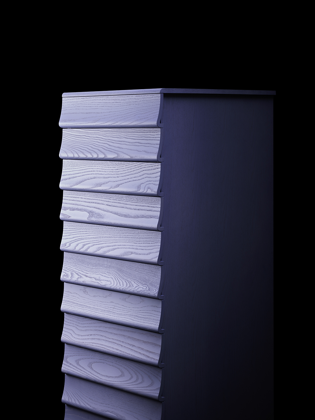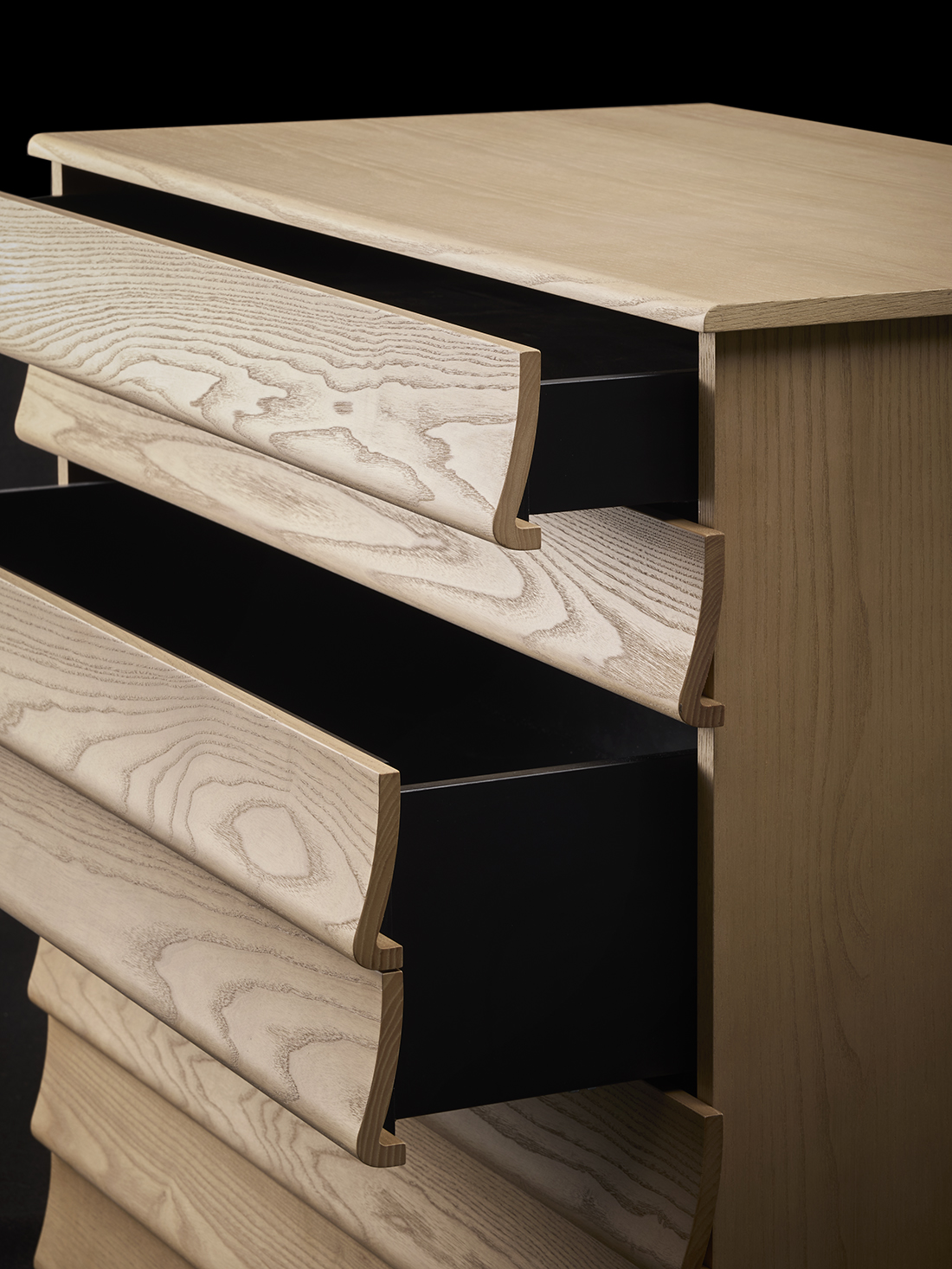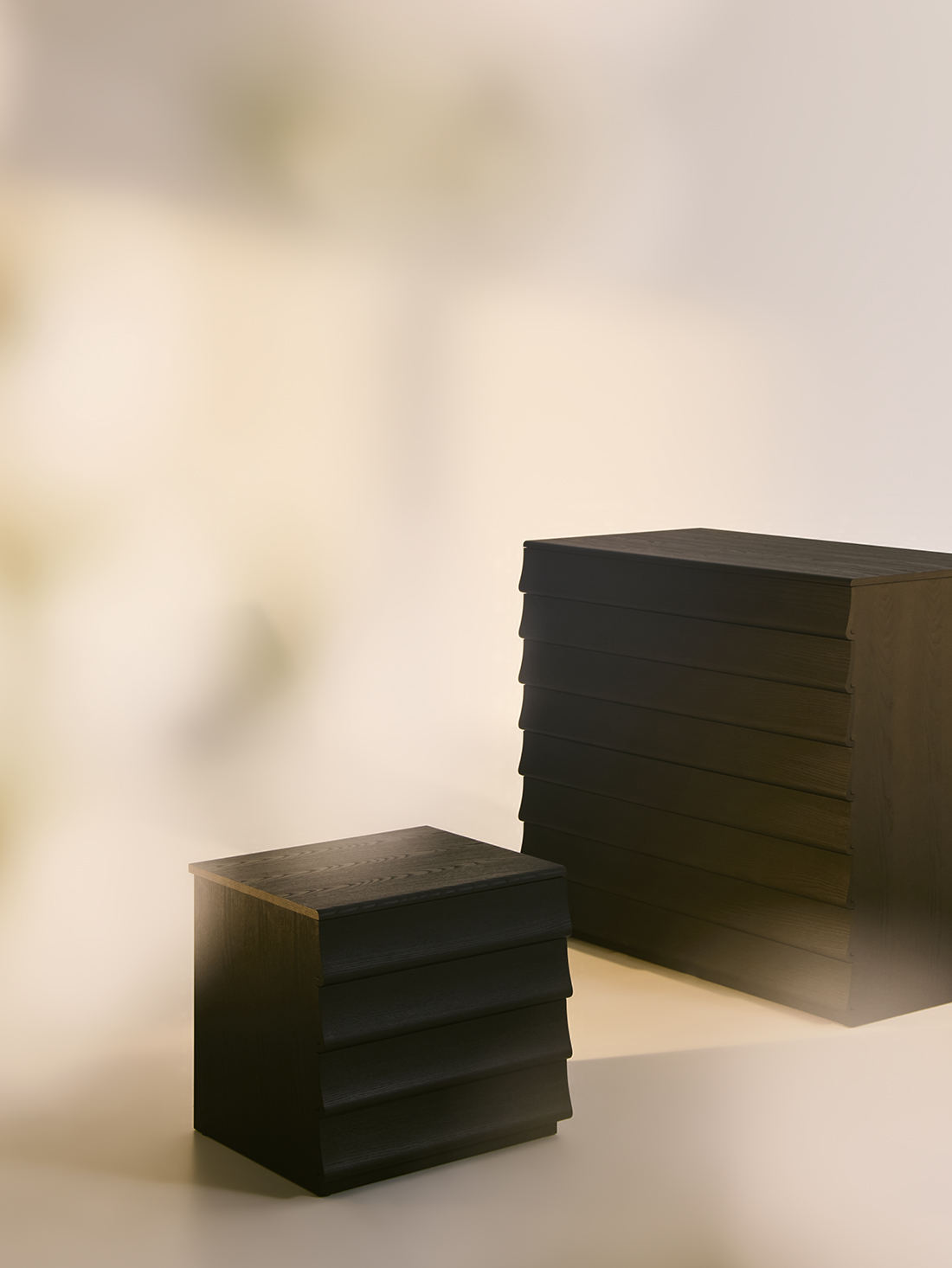 Rideaux is a collection of bedroom storage furniture defined by undulating surfaces that echo the sinuous design of Roman blinds with their succession of curves. The family includes a floorstanding bedside table, a seven-drawer chest, and a five-drawer chest, all distinguished by the soft sequence of wooden draperies that characterize their fronts. Starting from the top, this delicate wavy motif conceals the edges and envelops the volumes of the furniture, gently cascading onto the front with a slight lateral projection that creates a refined aesthetic detail and functionality for drawer opening.